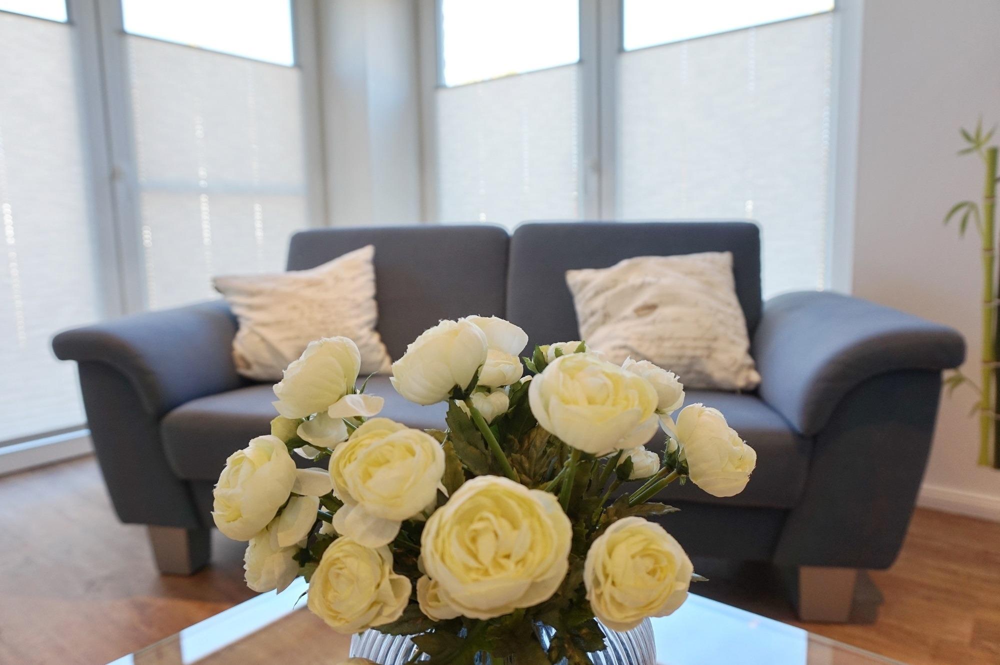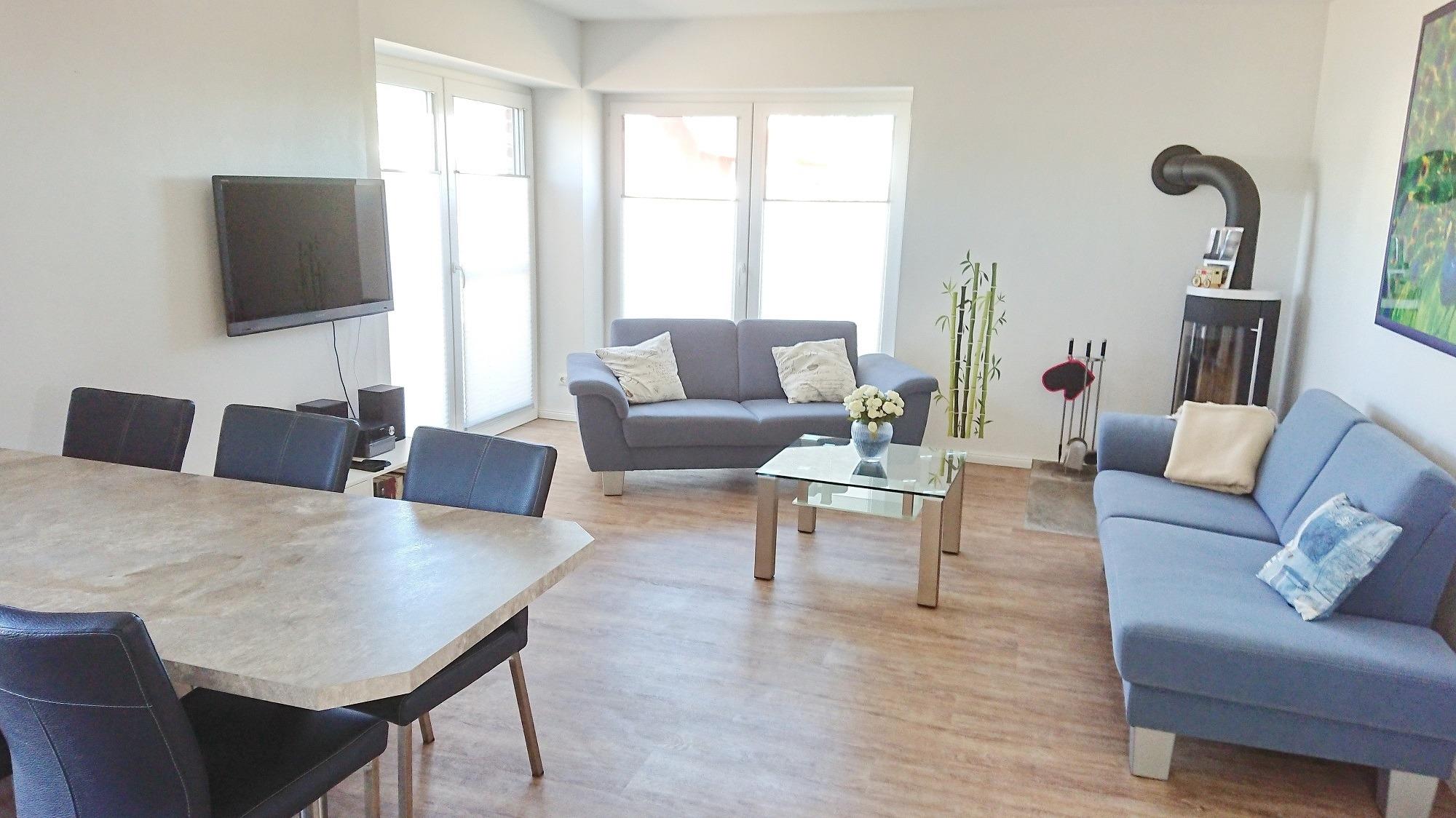 Das Wohnzimmer ist gemütlich mit einem Sofa und einer zusätzlichen Récamière eingerichtet und bietet neben einem großen Fernseher eine Hifi-Anlage mit CD-Player und einen hochwertigen Kaminofen, für den das hinter dem Haus gelagerte Holz gegen einen kostendeckenden Beitrag genutzt werden kann. Das OG verfügt über ein weiteres Badezimmer und die beiden Schlafzimmer sind jeweils mit einem Doppelbett (180 x 200 cm) und einem hochwertigen Einbau-Kleiderschrank ausgestattet.