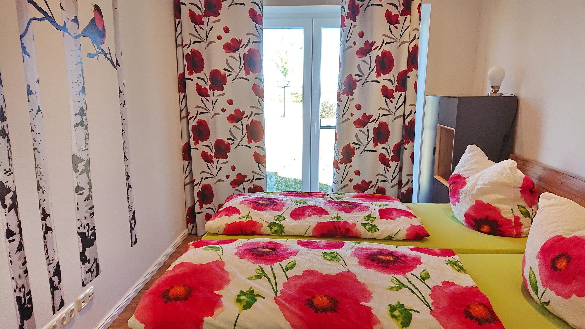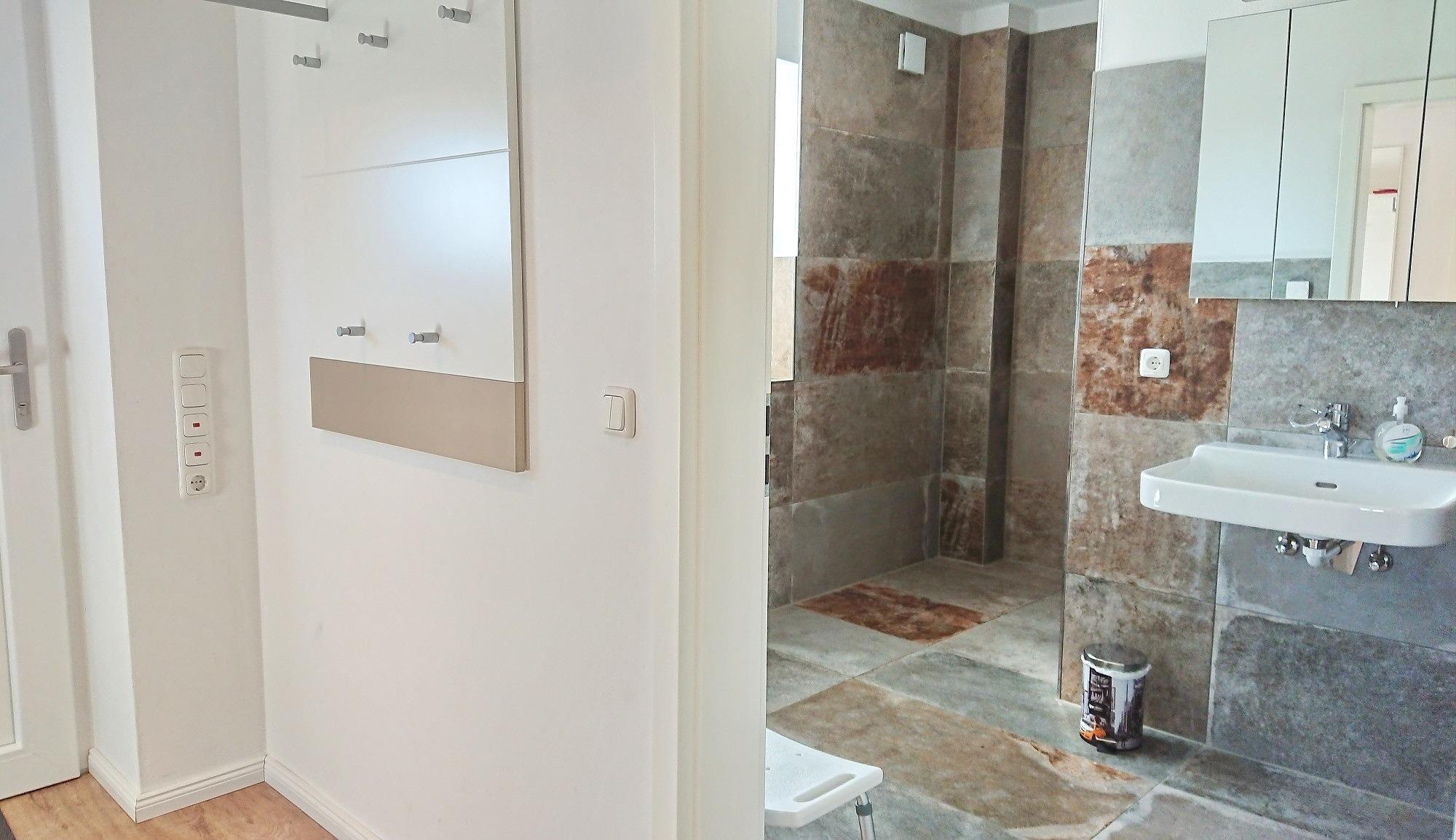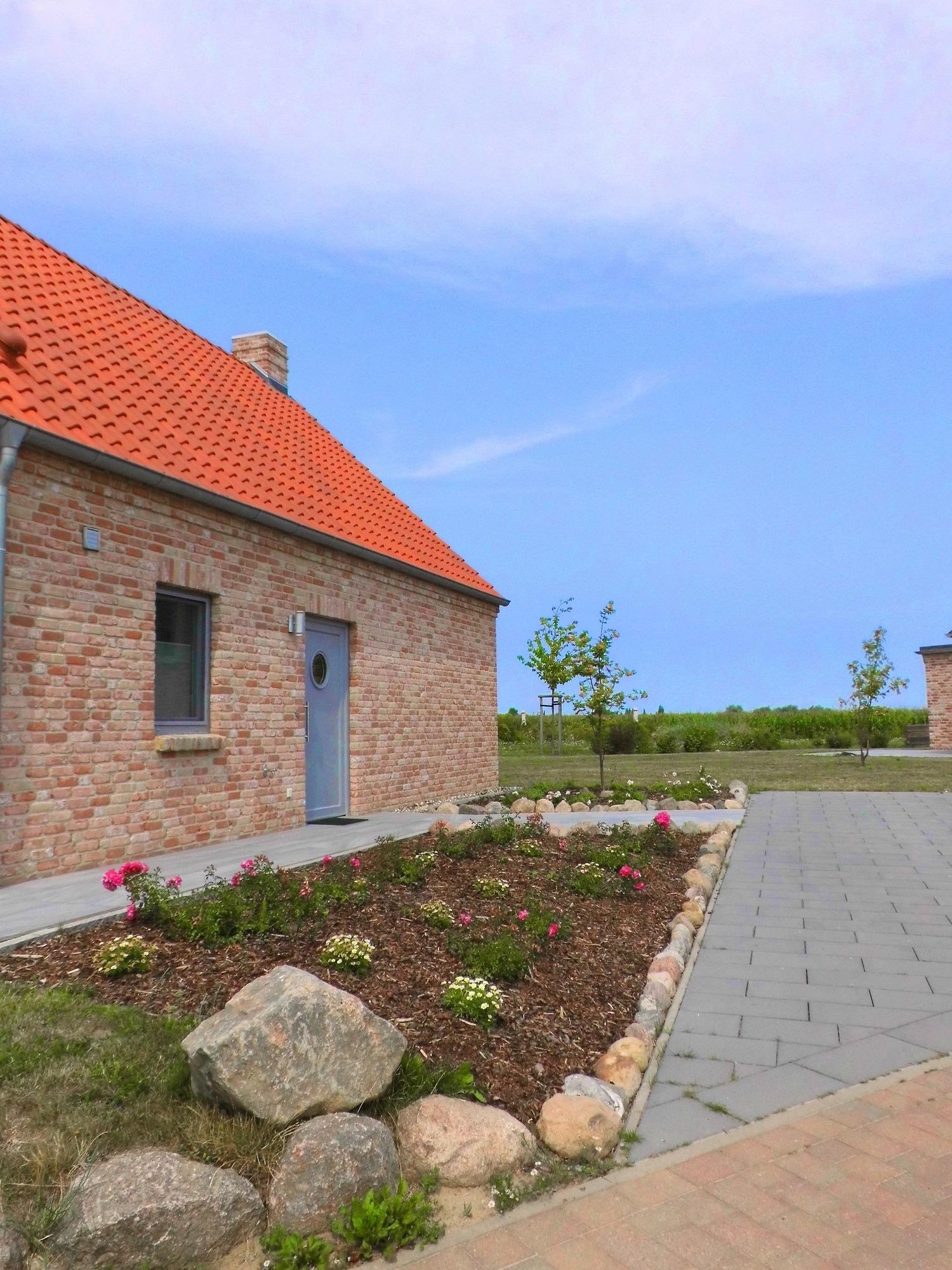 Das im Dezember 2016 fertiggestellte Ferienhaus „Fantasie“ bietet auf 104 qm eine hochwertige Ausstattung mit 3 Schlafzimmern, 2 Bädern und einem großzügigen Wohn-Essbereich mit integrierter Einbauküche. In allen Räumen befinden sich Insektenschutzgitter und Fußbodenheizung (Erdwärmepumpe). Das behindertengerechte Erdgeschoss gibt auch einem gehbehinderten Familienmitglied die Möglichkeit, das Ferienhaus zu nutzen. Die Zimmertüren haben hier eine Durchgangsbreite von 94 cm, das Doppelbett (180 x 200 cm) im Schlafzimmer ist auf einer Seite mit einem separaten elektrisch höhenverstellbaren Lattenrost (Einlegerahmen „Lippe IV“ der Firma Burmester) ausgestattet und kann bequem von einem Rollstuhl (kein E-Rollstuhl) oder Gehwagen angefahren werden. Das große Badezimmer verfügt über einen unterfahrbaren Waschtisch, eine 130 cm breite barrierefreie Dusche und ein WC mit einem Wandgriff auf der einen und einem schwenkbaren Griff auf der anderen Seite. Der Küchentisch im Wohn-Essbereich ist ebenfalls unterfahrbar. Die Einbauküche ist hingegen nicht behindertengerecht ausgestattet.