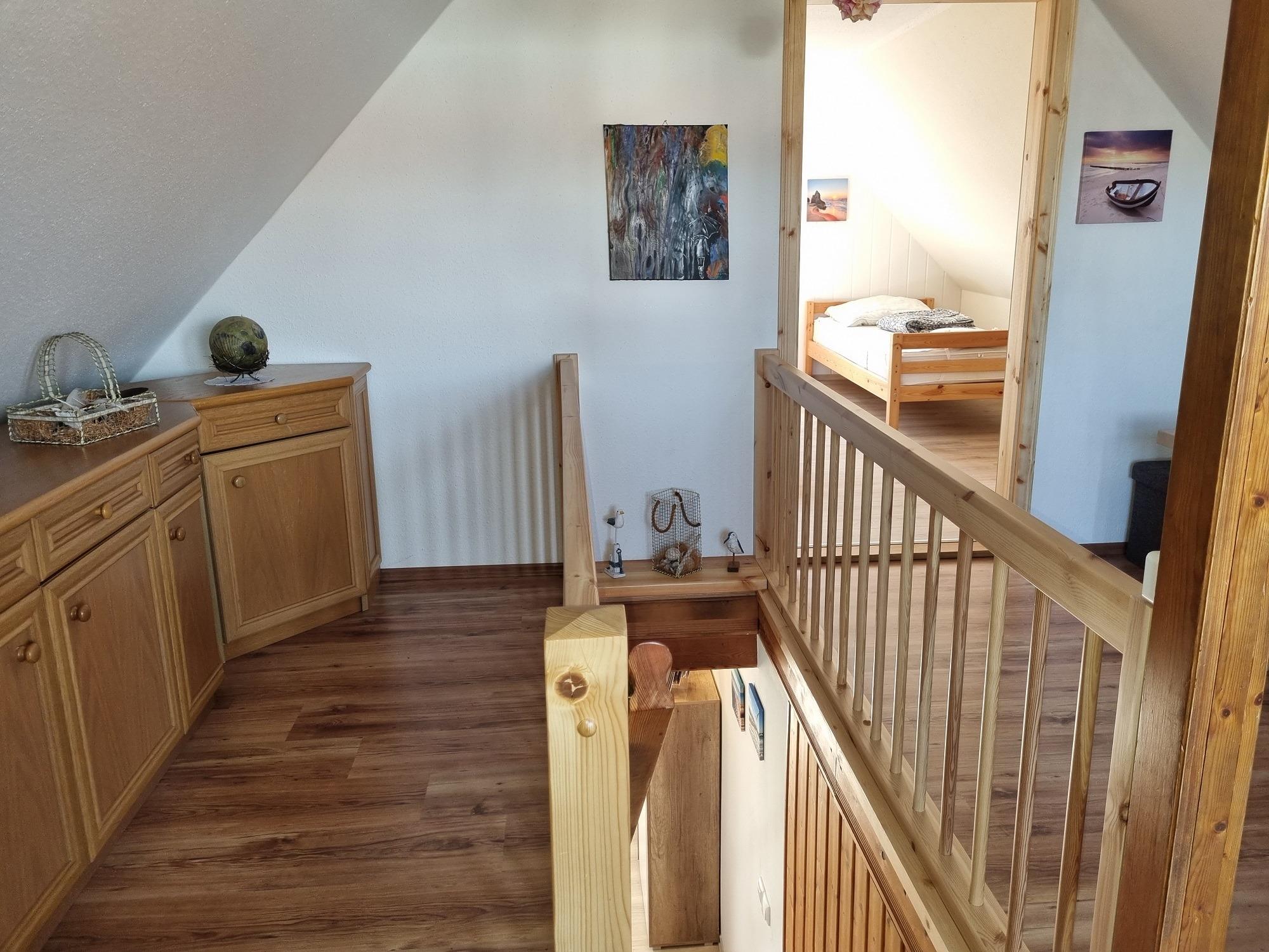 Das 2. Schlafzimmer im Obergeschoss ist ebenfalls mit einem Doppelbett und einem zusätzlichen Einzelbett eingerichtet.