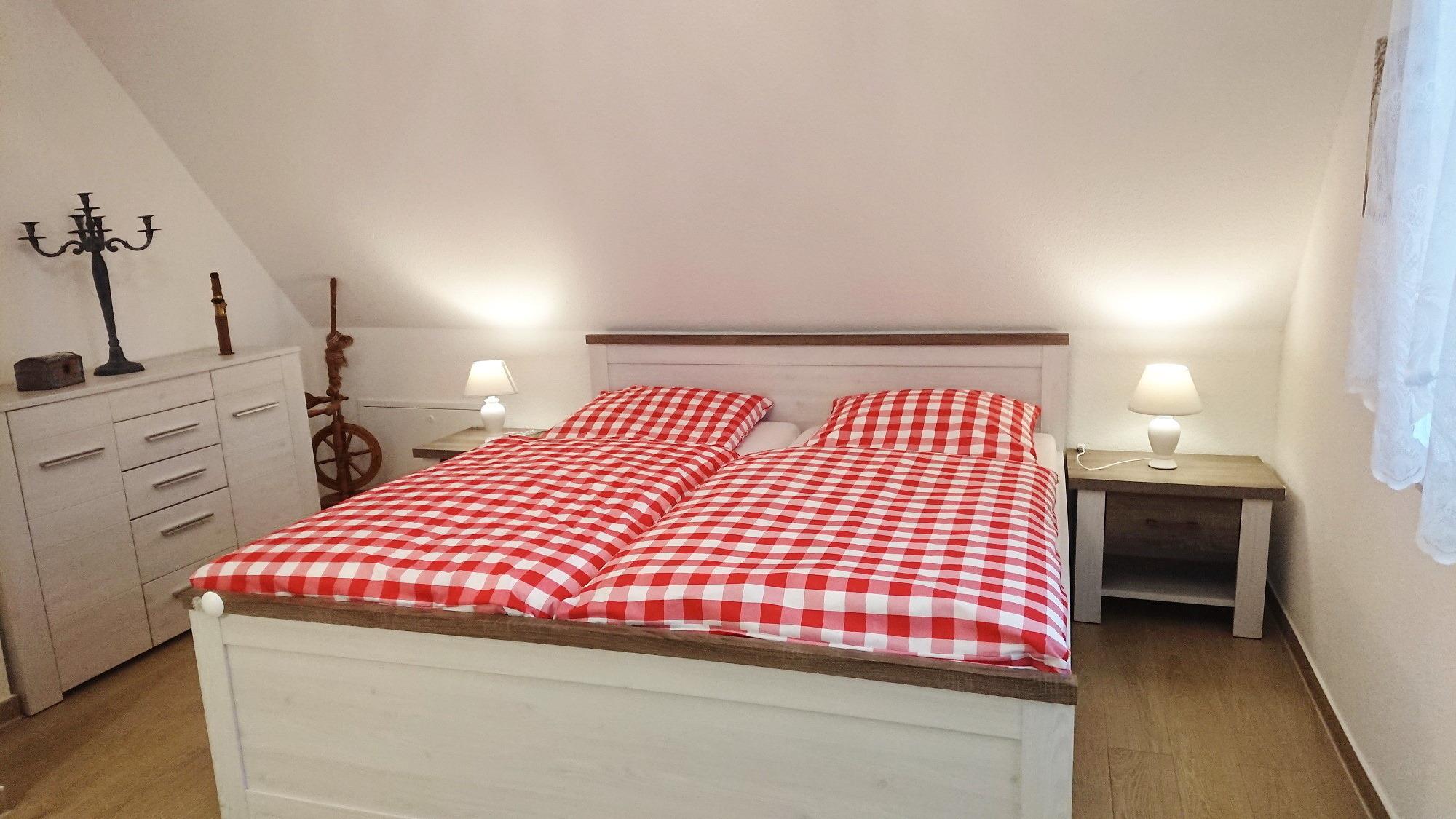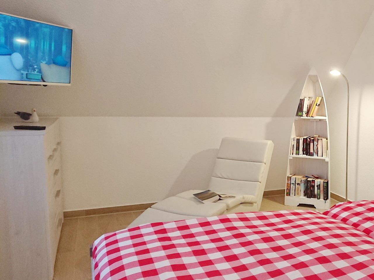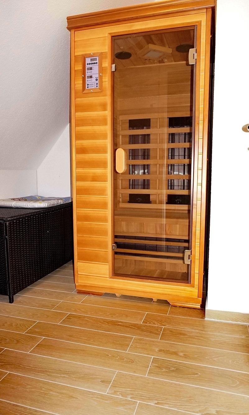 Im Schlafzimmer im Obergeschoß können Sie sich zurückziehen. Ein 2. TV und eine, zwei Kommoden, eine Relaxliege sowie das Doppelbett (4 Jahreszeitenbetten - Allergiker geeignet) sind dort platziert. Die Schlafzimmer lassen sich durch Rollos verdunkeln. Das Duschbad verfügt über eine Echtglasdusche, WC und Waschbecken. Eine kleine Infrarotsauna wurde zusätzlich eingebaut. Für die Kleinen Gäste stehen ein Kinderreisebett mit Matratze, Wickelauflage, Babybadewanne und Tritthocker bereit. Im HWR stehen, Staubsauger, Waschmaschine und Wäscheständer zur Verfügung. Ein Stellplatz ist direkt am Ferienhaus.