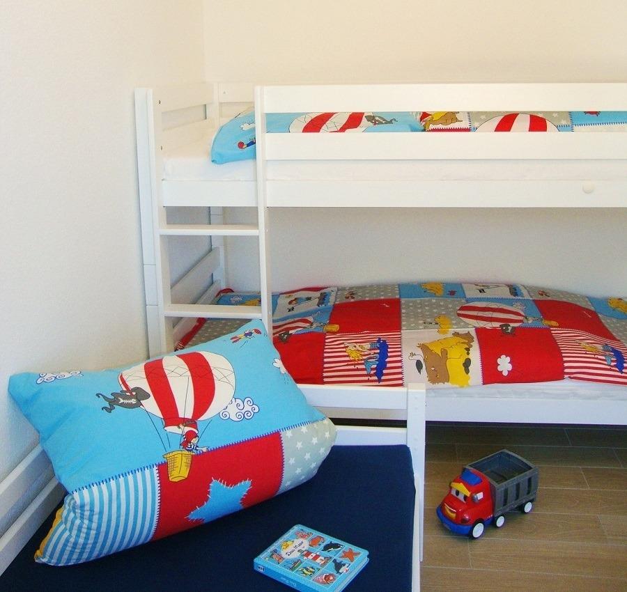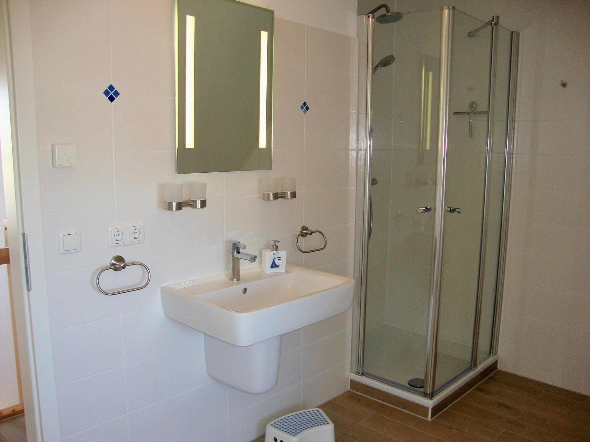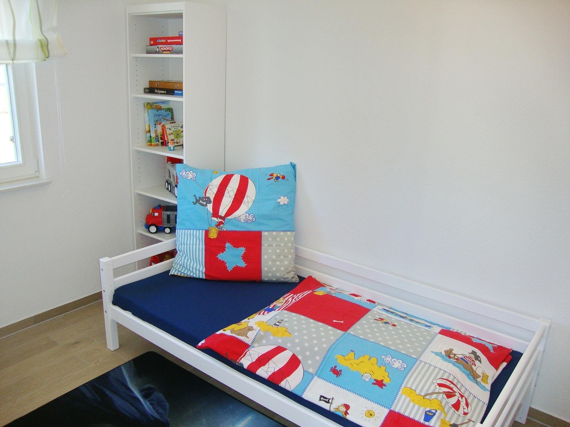 Im Schlafzimmer im Obergeschoß können Sie sich zurückziehen. Ein 2. TV und eine, zwei Kommoden, eine Relaxliege sowie das Doppelbett (4 Jahreszeitenbetten - Allergiker geeignet) sind dort platziert. Die Schlafzimmer lassen sich durch Rollos verdunkeln. Das Duschbad verfügt über eine Echtglasdusche, WC und Waschbecken. Eine kleine Infrarotsauna wurde zusätzlich eingebaut. Für die Kleinen Gäste stehen ein Kinderreisebett mit Matratze, Wickelauflage, Babybadewanne und Tritthocker bereit. Im HWR stehen, Staubsauger, Waschmaschine und Wäscheständer zur Verfügung. Ein Stellplatz ist direkt am Ferienhaus.