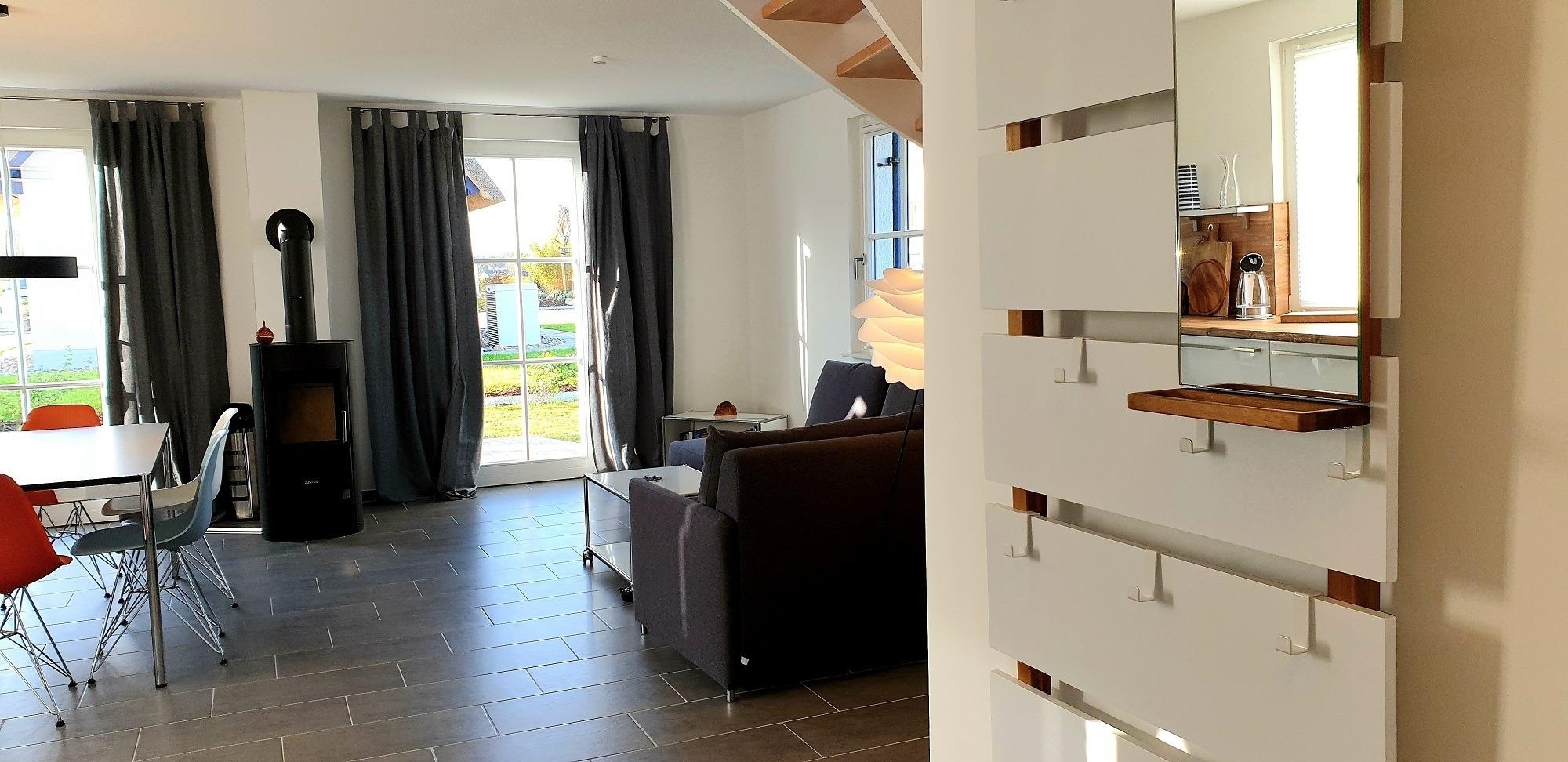 Behagliches Wohnklima sorgt der Kaminofen und die Fußbodenheizung im Haus.