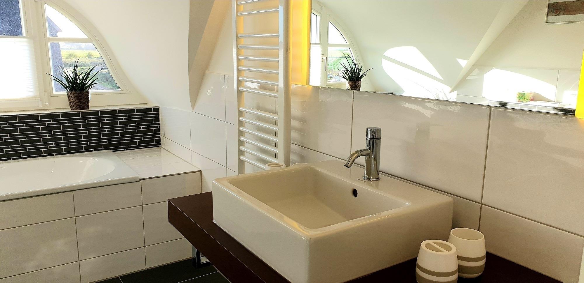 Das großzügige Vollbad zwischen den beiden Schlafzimmern bietet viel Komfort.