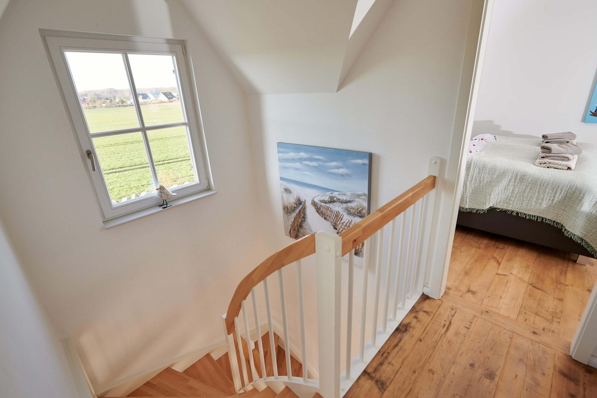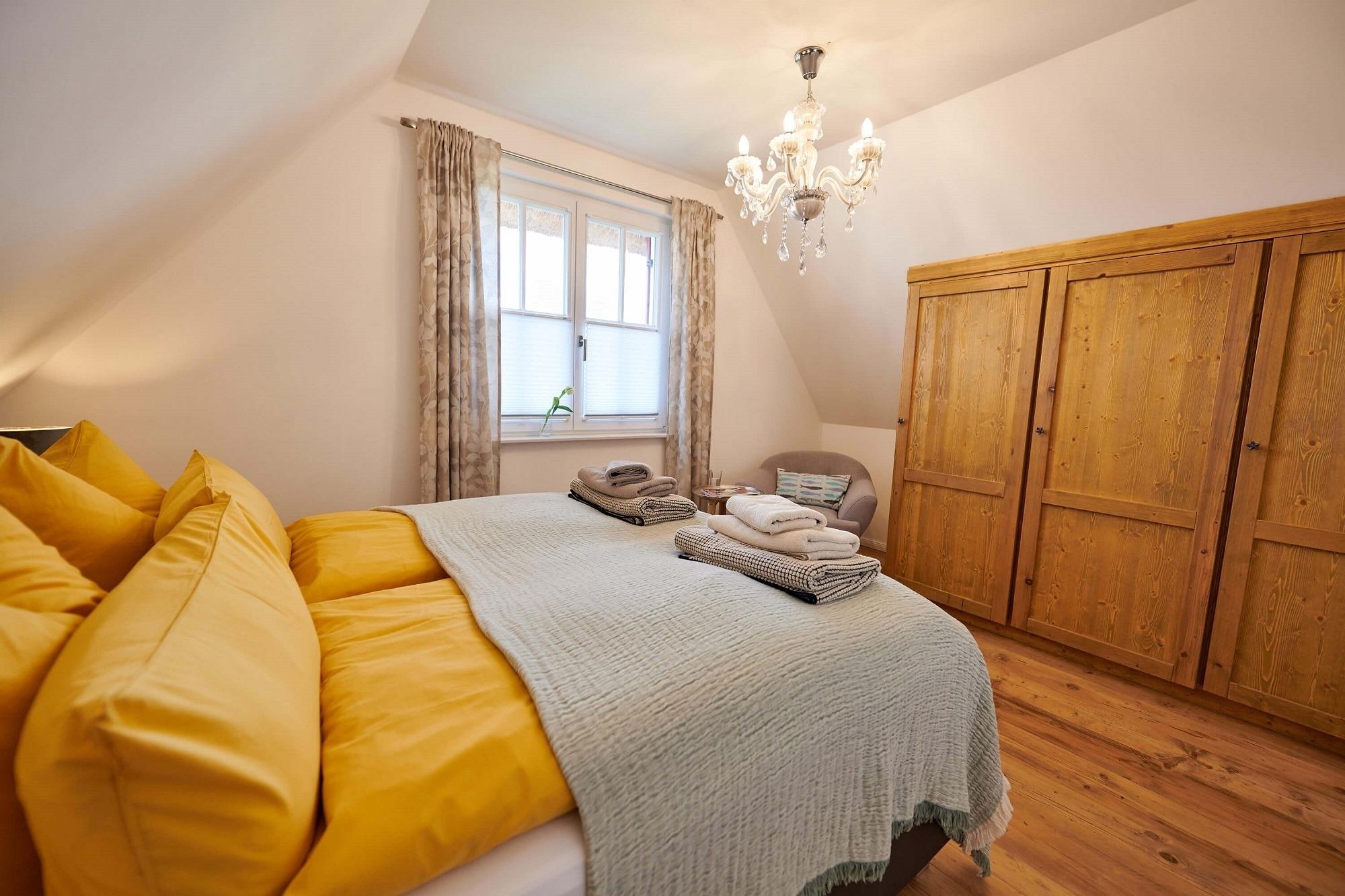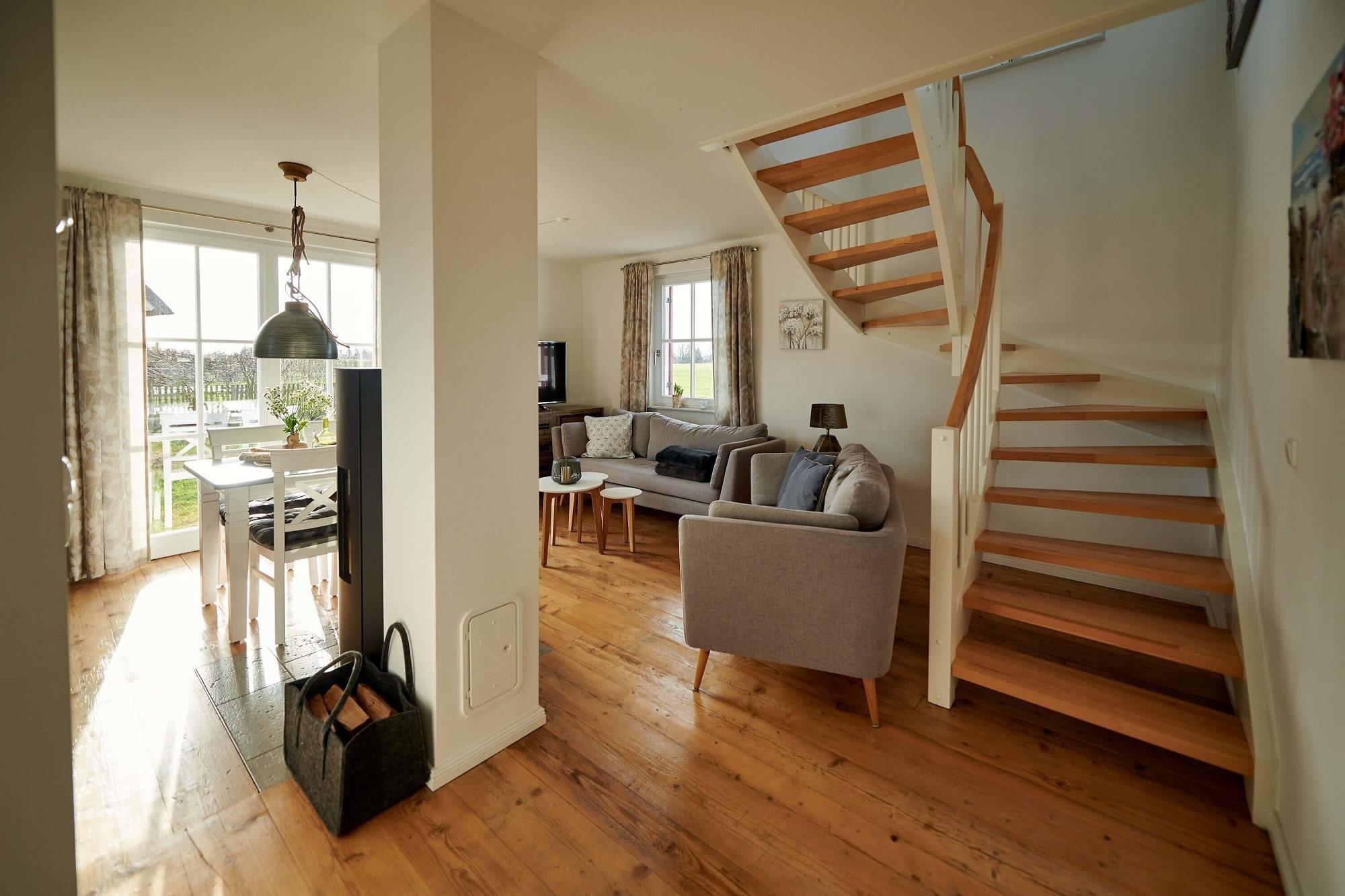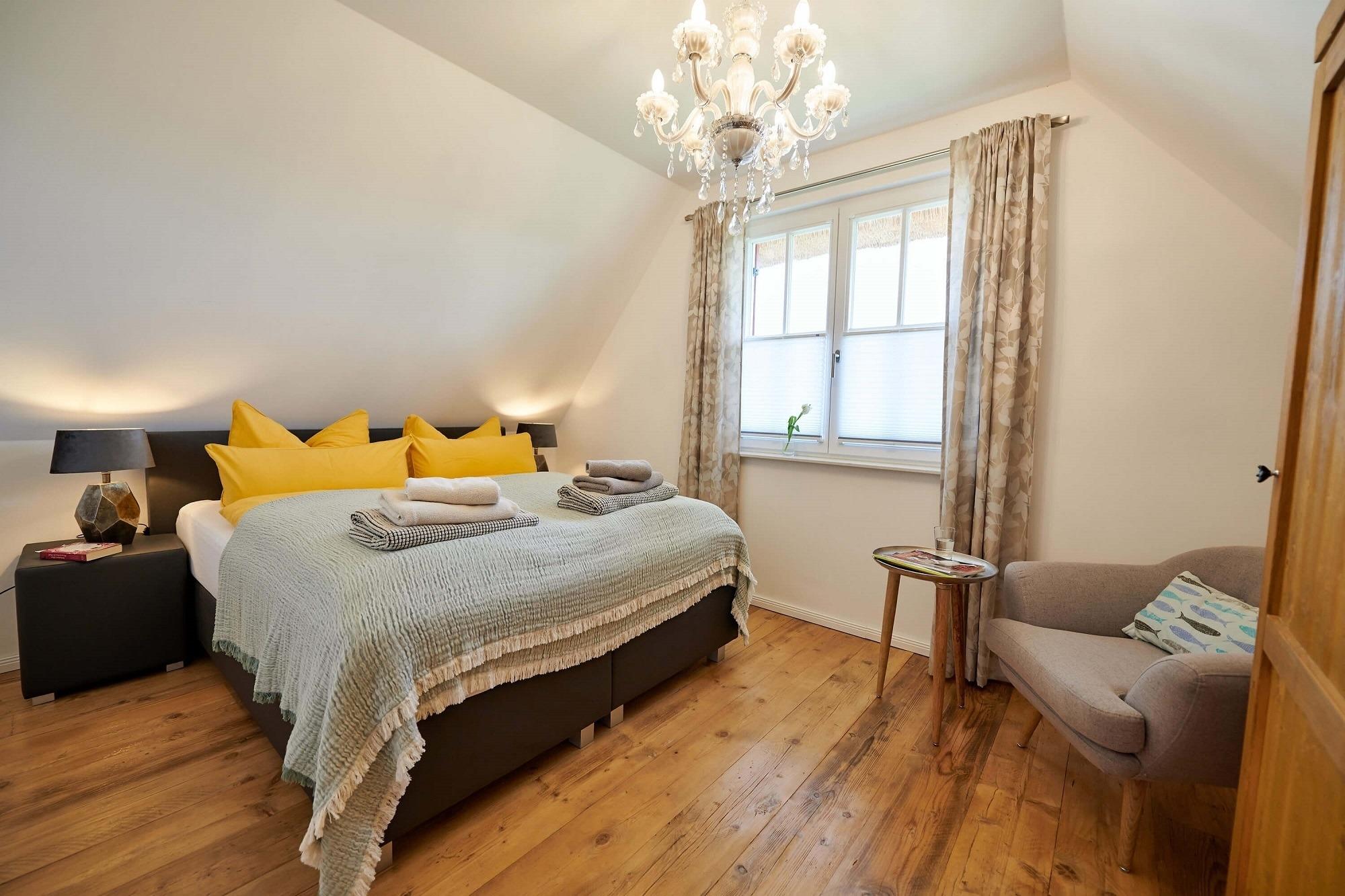 Im oberen Bereich stehen Ihnen zwei Schlafzimmer mit je einem Boxspringbett und Kommoden zur Verfügung. Ein 2. TV ist in einem Schlafzimmer vorhanden. Das Duschbad mit Echtglasduschabtrennung, Waschbecken und WC ist in der typischen Fledermausgaube des Reethauses eingerichtet. Im gesamten Haus ist eine Fußbodenheizung verlegt. Zum Sichtschutz sind Pliesses, Vorhänge und Fensterklappläden angebracht. Eine Waschmaschine und Trockner und diverse Putzutensilien sowie Bügelbrett und Bügeleisen sind im HWR verstaut. Im Garten zur Südseite können Sie es sich auf den Gartenmöbel bequem machen und Ihre Blicke über die Wiesen und Felder schweifen lassen. Ein Sonnenschirm ist vorhanden. Zusätzlich ist ein Strandkorb und Loungemöbel zum Entspannen im Garten vorhanden. Zum Grillen steht Ihnen ein Elektrogrill von Weber zur Verfügung. Zum Naturstrand sind es ca. 500 m. Zwei Stellplätze befinden sich direkt am Ferienhaus.