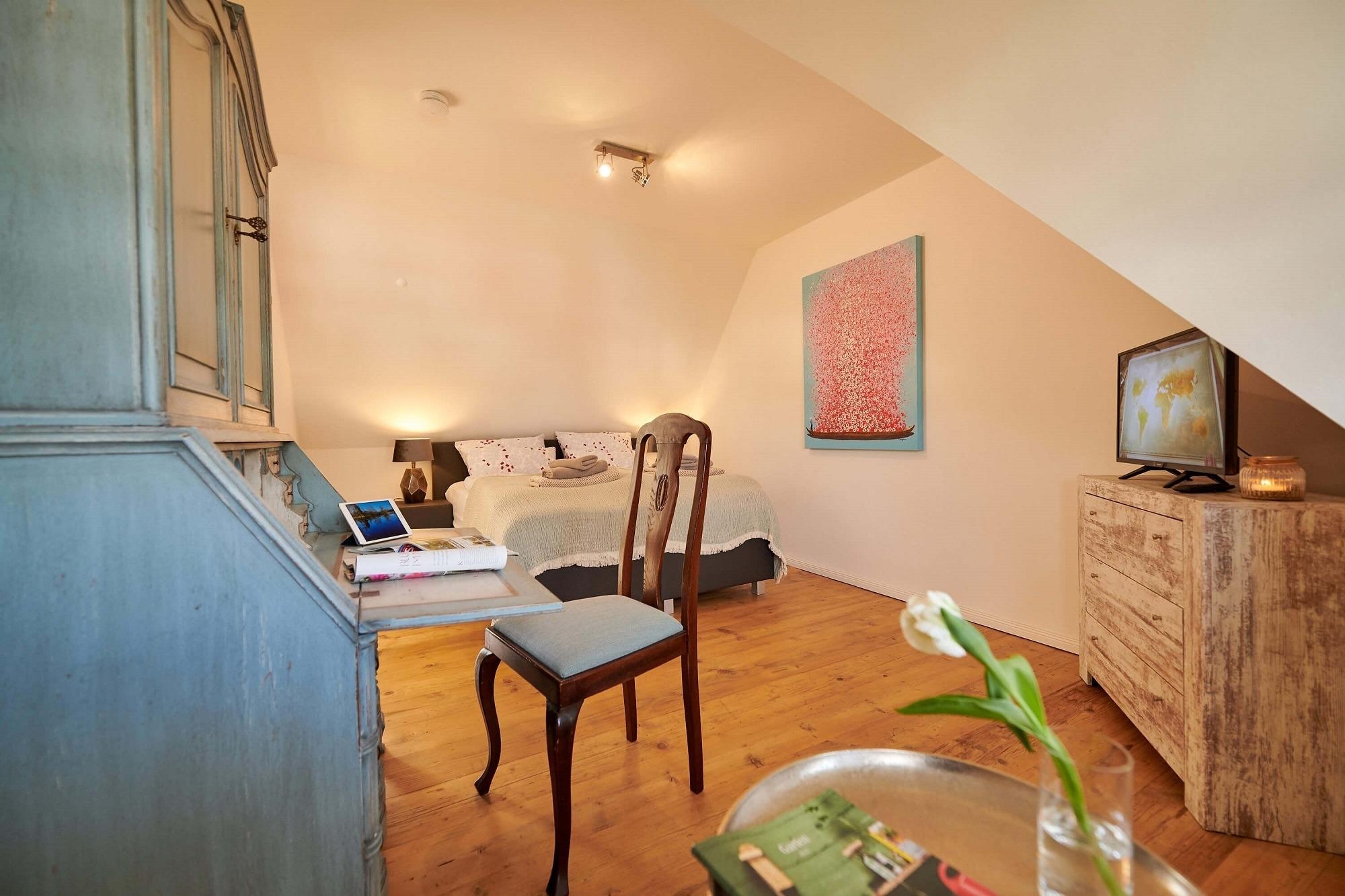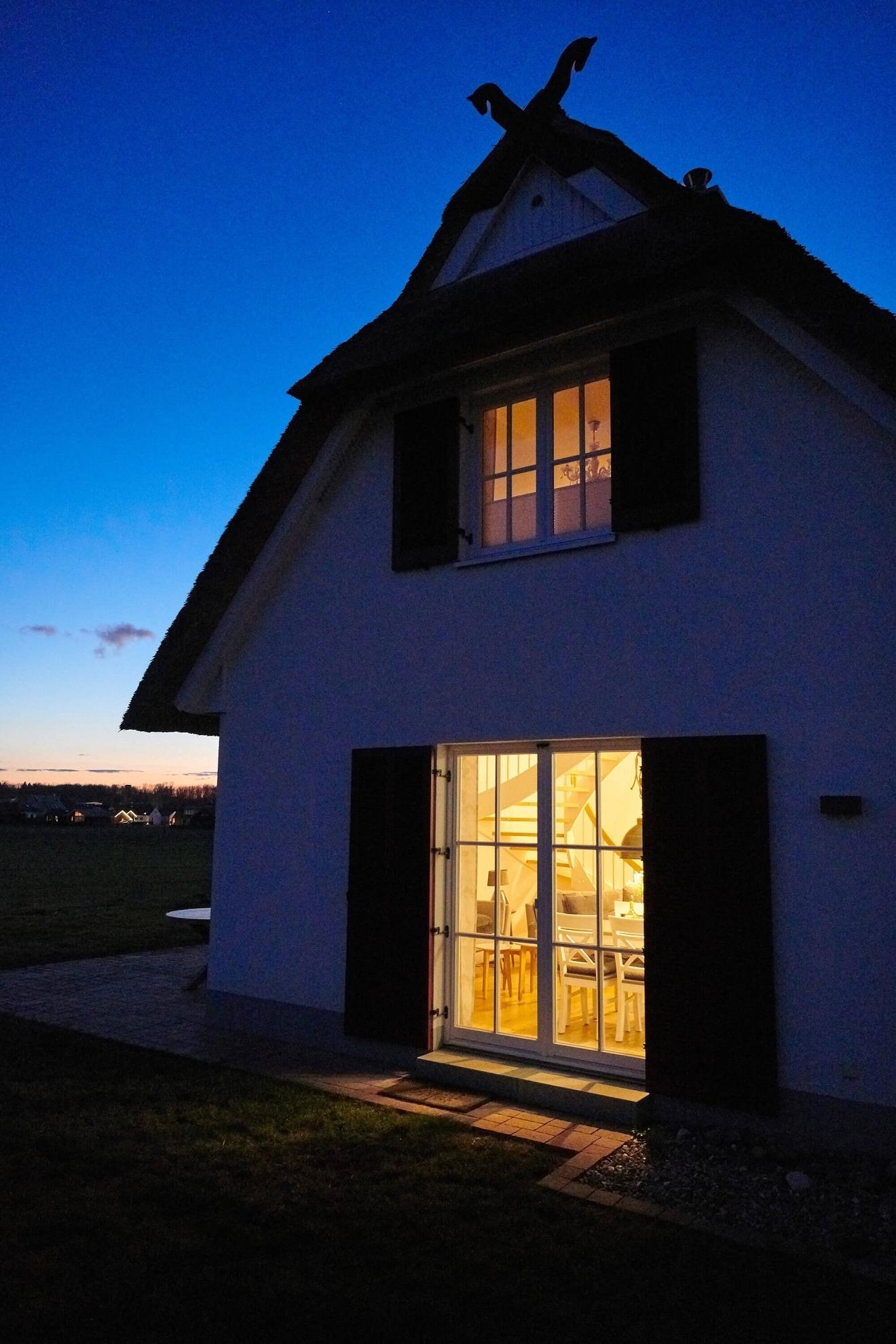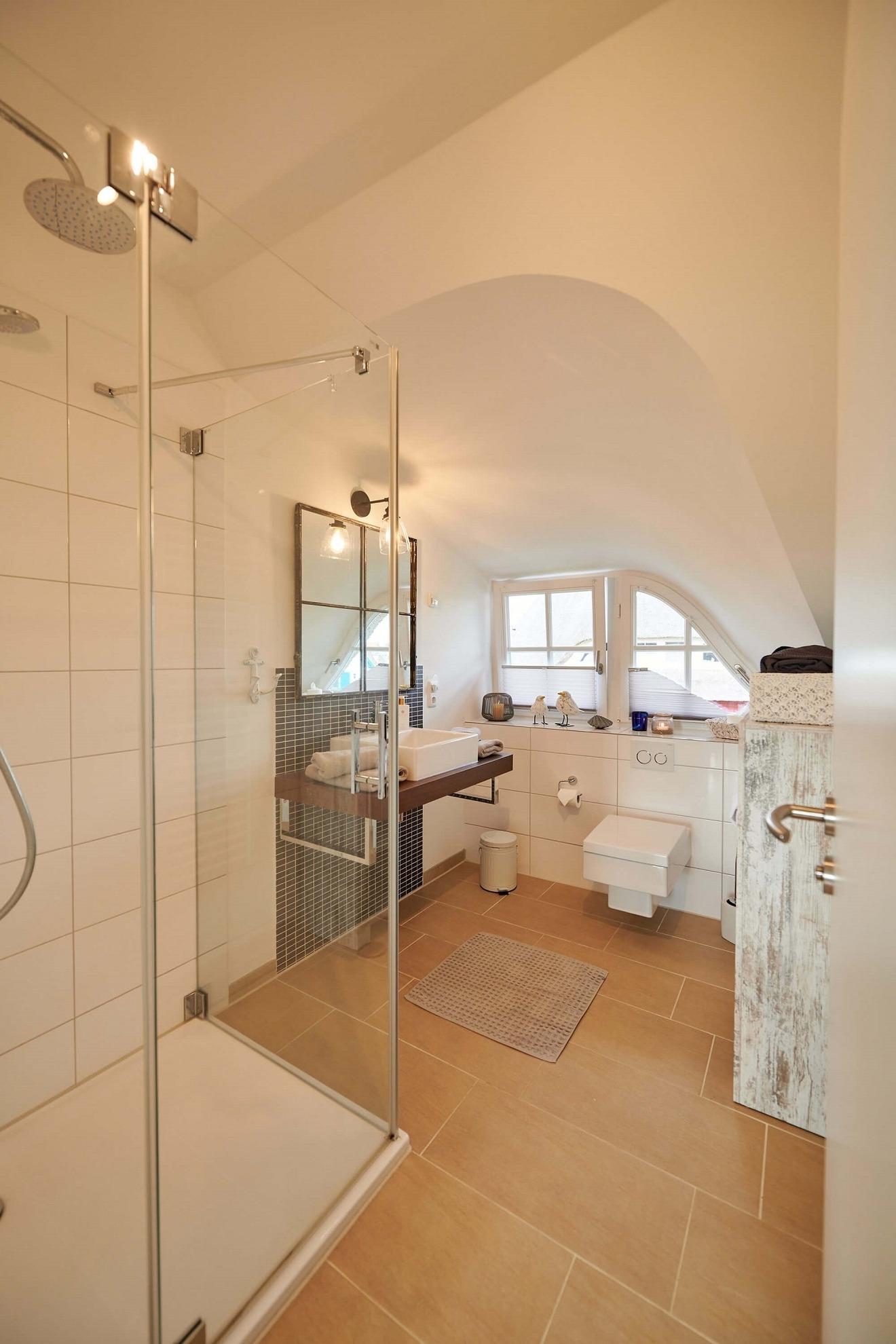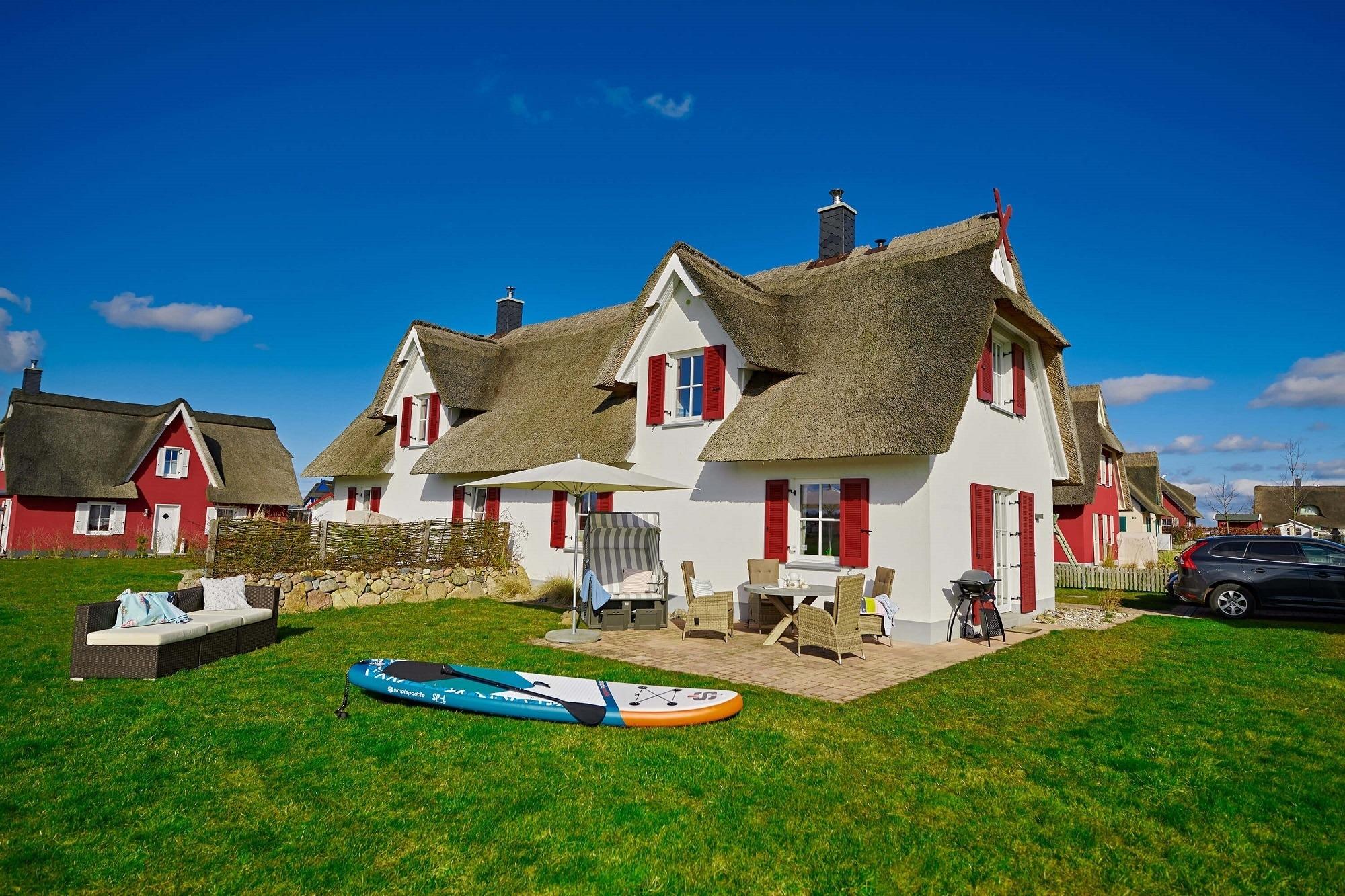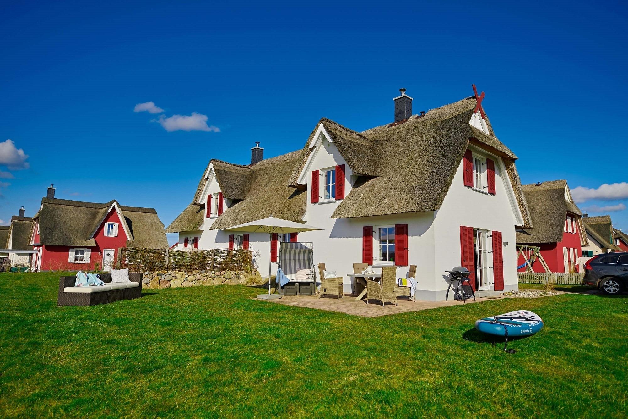 Im oberen Bereich stehen Ihnen zwei Schlafzimmer mit je einem Boxspringbett und Kommoden zur Verfügung. Ein 2. TV ist in einem Schlafzimmer vorhanden. Das Duschbad mit Echtglasduschabtrennung, Waschbecken und WC ist in der typischen Fledermausgaube des Reethauses eingerichtet. Im gesamten Haus ist eine Fußbodenheizung verlegt. Zum Sichtschutz sind Pliesses, Vorhänge und Fensterklappläden angebracht. Eine Waschmaschine und Trockner und diverse Putzutensilien sowie Bügelbrett und Bügeleisen sind im HWR verstaut. Im Garten zur Südseite können Sie es sich auf den Gartenmöbel bequem machen und Ihre Blicke über die Wiesen und Felder schweifen lassen. Ein Sonnenschirm ist vorhanden. Zusätzlich ist ein Strandkorb und Loungemöbel zum Entspannen im Garten vorhanden. Zum Grillen steht Ihnen ein Elektrogrill von Weber zur Verfügung. Zum Naturstrand sind es ca. 500 m. Zwei Stellplätze befinden sich direkt am Ferienhaus.