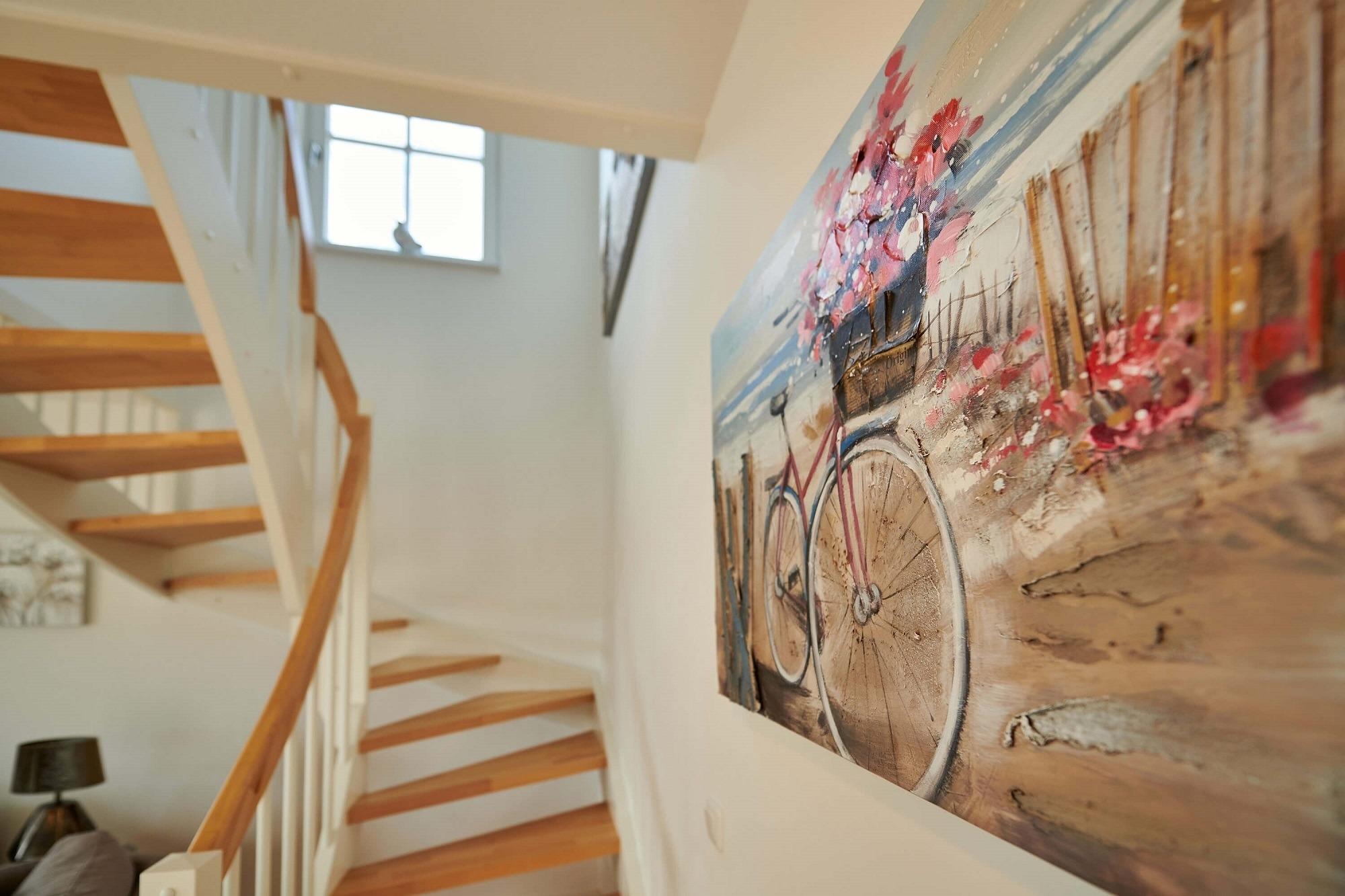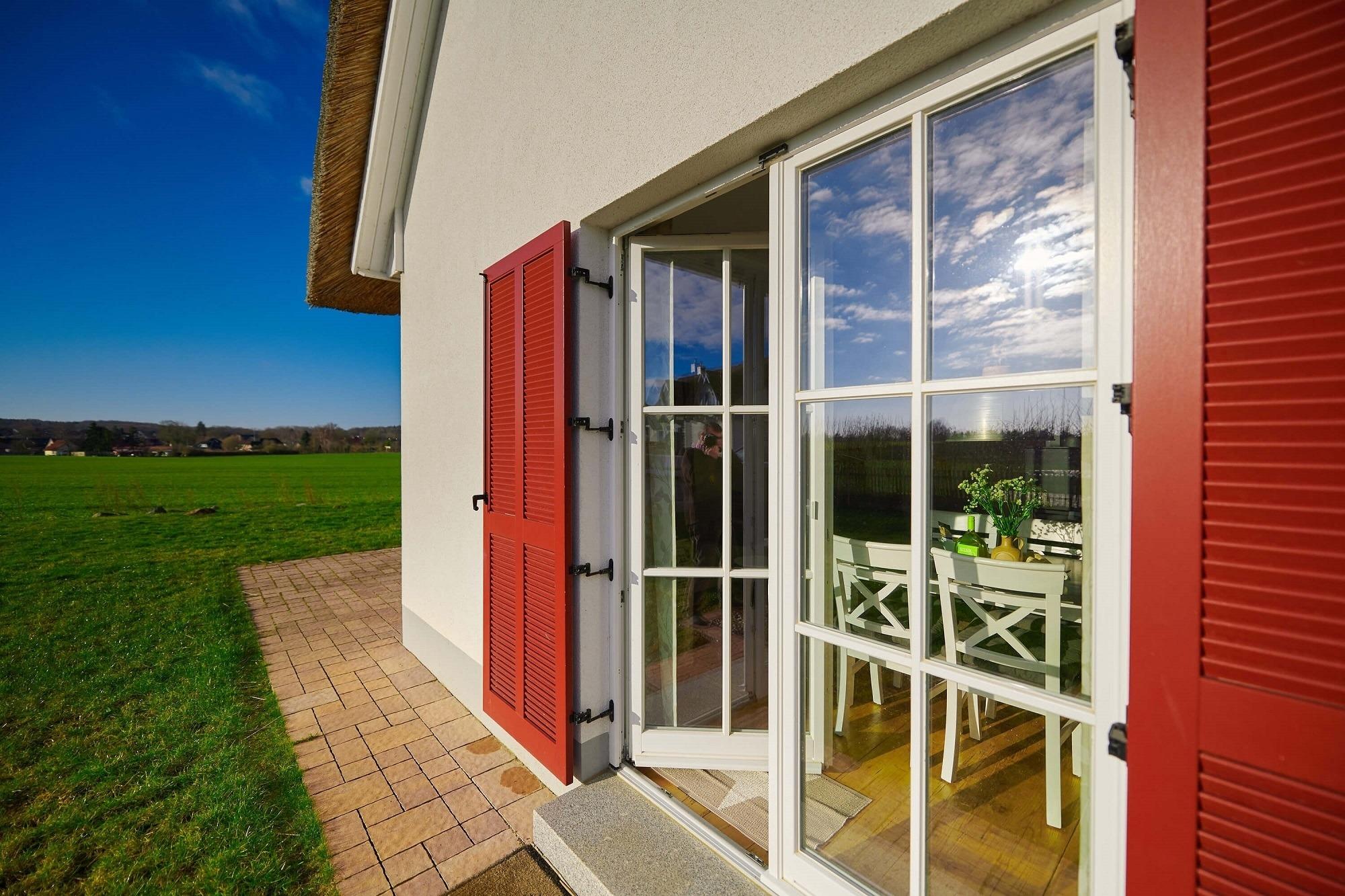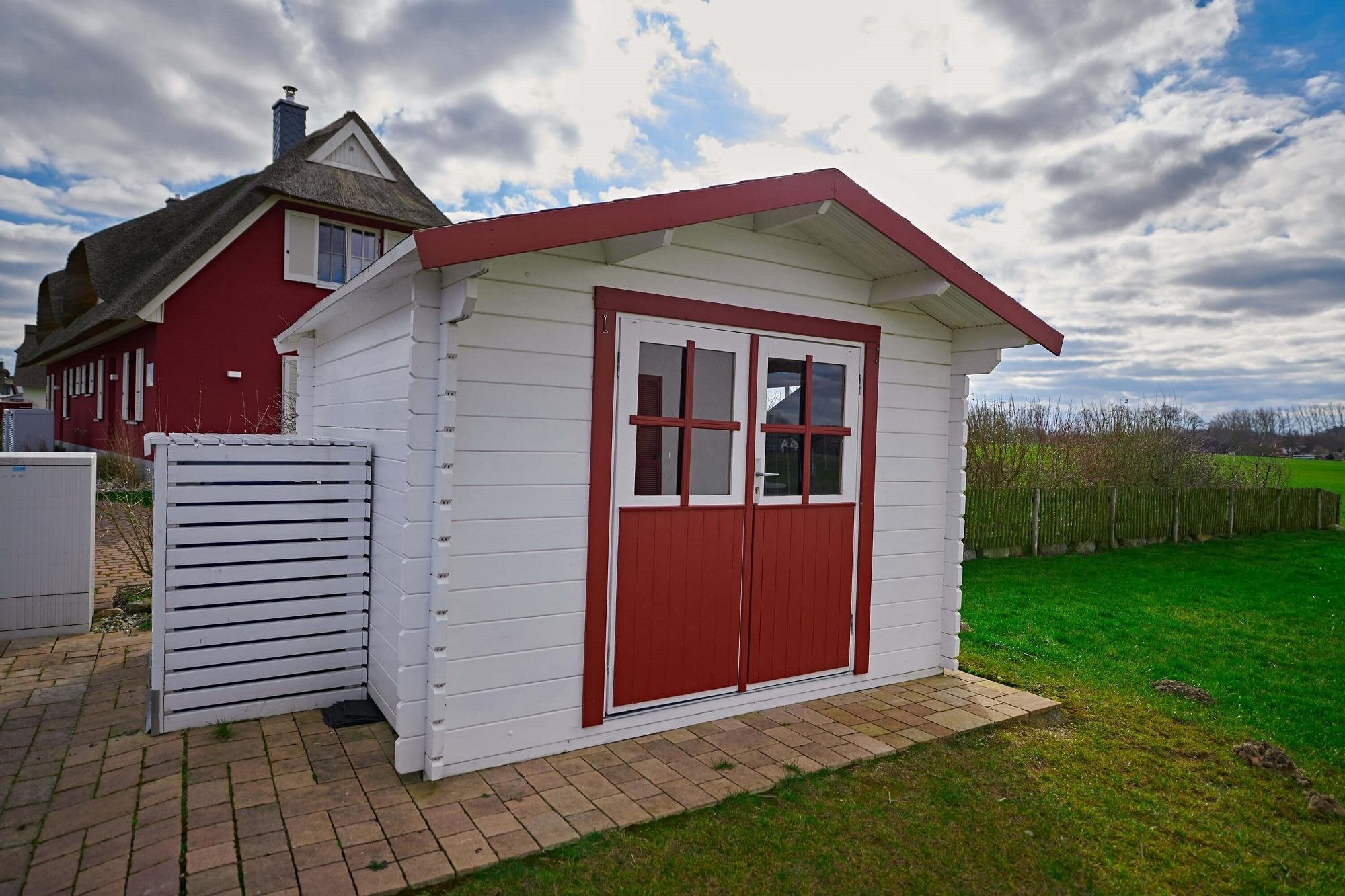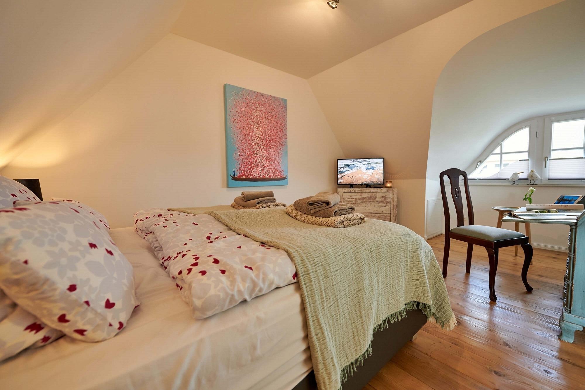 Im oberen Bereich stehen Ihnen zwei Schlafzimmer mit je einem Boxspringbett und Kommoden zur Verfügung. Ein 2. TV ist in einem Schlafzimmer vorhanden. Das Duschbad mit Echtglasduschabtrennung, Waschbecken und WC ist in der typischen Fledermausgaube des Reethauses eingerichtet. Im gesamten Haus ist eine Fußbodenheizung verlegt. Zum Sichtschutz sind Pliesses, Vorhänge und Fensterklappläden angebracht. Eine Waschmaschine und Trockner und diverse Putzutensilien sowie Bügelbrett und Bügeleisen sind im HWR verstaut. Im Garten zur Südseite können Sie es sich auf den Gartenmöbel bequem machen und Ihre Blicke über die Wiesen und Felder schweifen lassen. Ein Sonnenschirm ist vorhanden. Zusätzlich ist ein Strandkorb und Loungemöbel zum Entspannen im Garten vorhanden. Zum Grillen steht Ihnen ein Elektrogrill von Weber zur Verfügung. Zum Naturstrand sind es ca. 500 m. Zwei Stellplätze befinden sich direkt am Ferienhaus.
