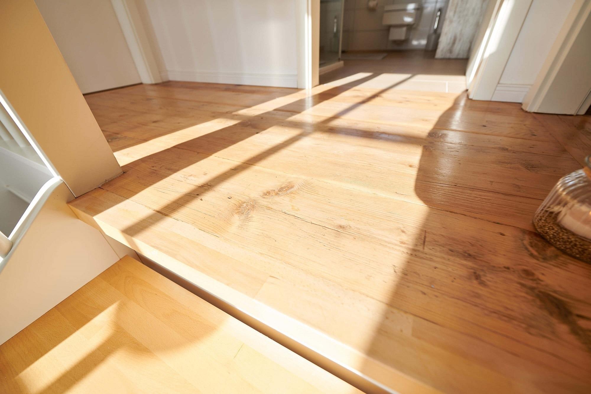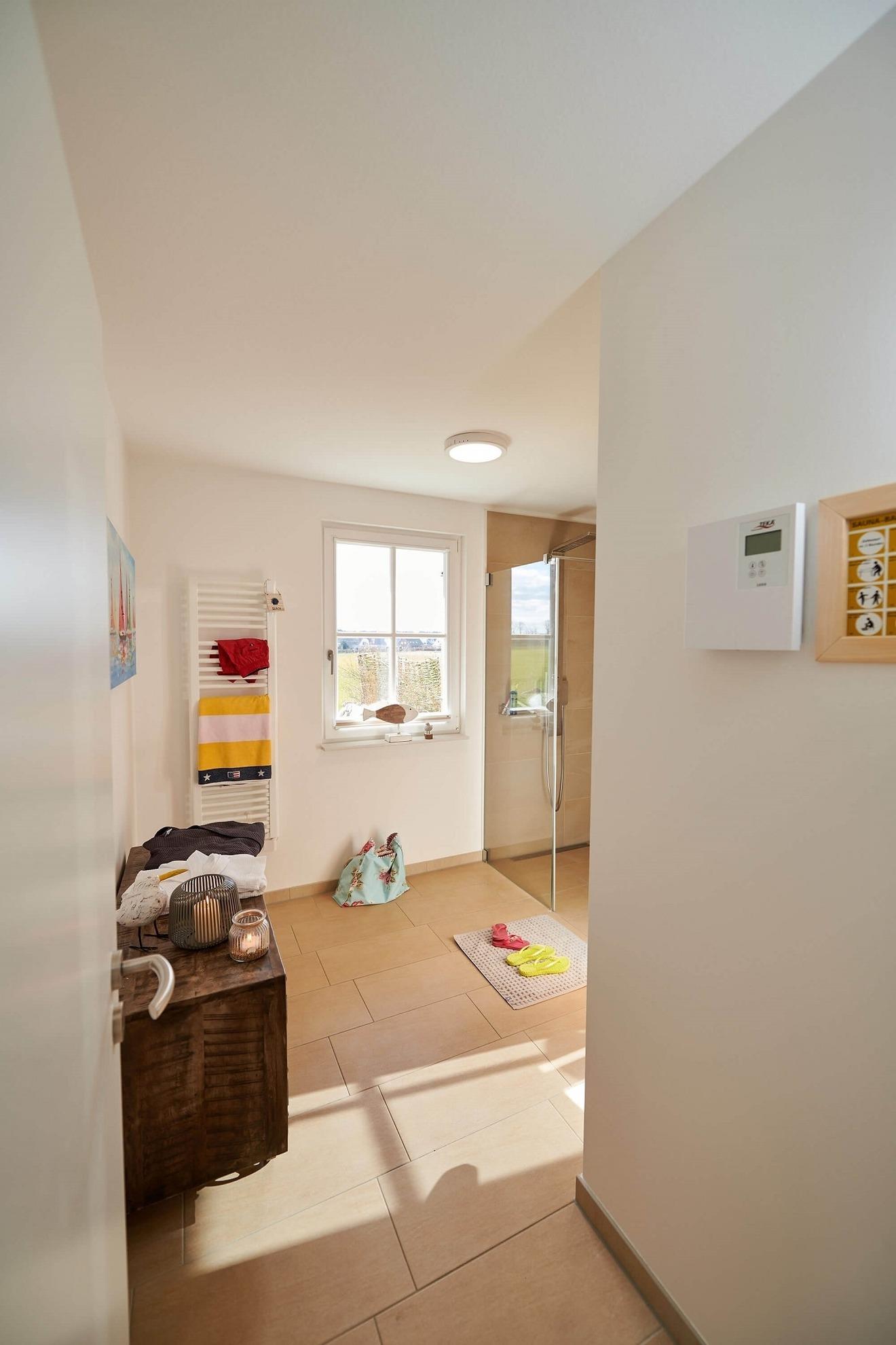 Der massive schwedische Echtholzfußboden und liebevoll ausgesuchte Details bestechen durch Ihre Einzigartigkeit. Die Küche ist modern mit vielen Extras ausgestattet und das von allen seitens sichtbare Kaminfeuer bringt gerade an kälteren Tagen eine wohlige Stimmung ins Haus. Die Sauna ist mit einer Wellnessdusche versehen und bietet angenehmen Platz zum Erholen. Das Gäste-WC mit Tageslicht befindet sich ebenfalls im Erdgeschoss.