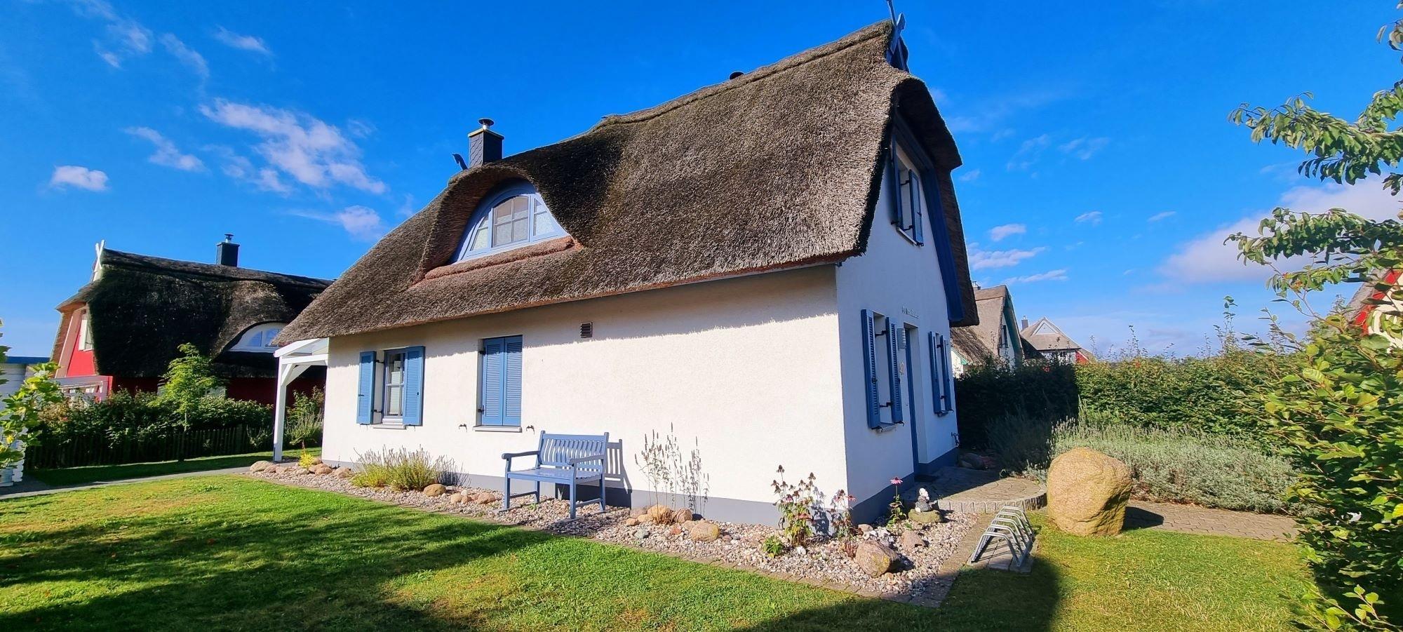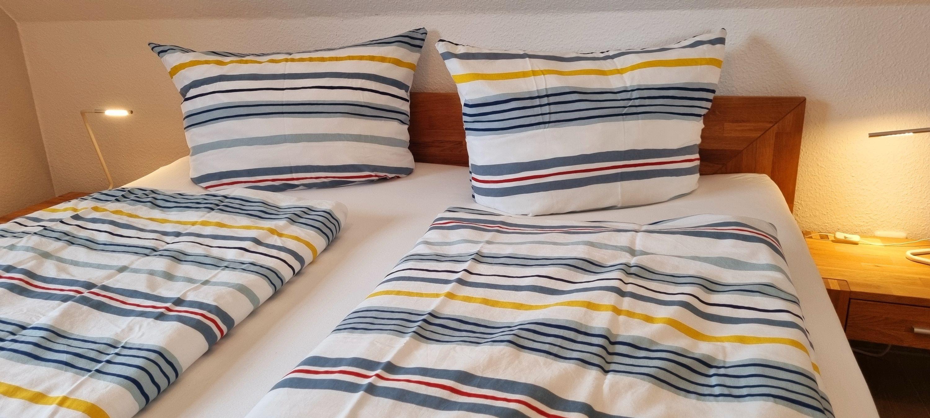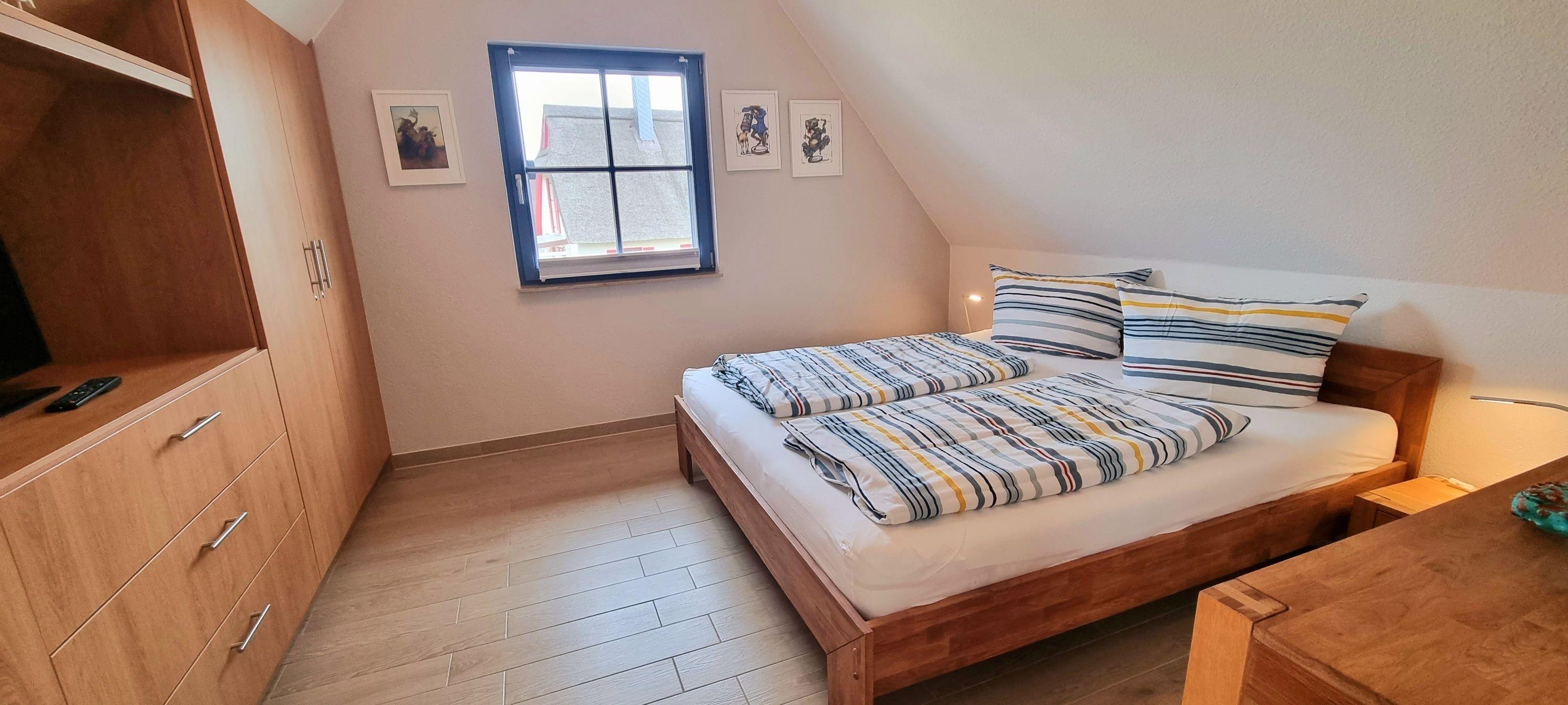 Im Obergeschoss finden Sie zwei großzügige Schlafzimmer (je 15 qm) und ein Bad vor. Das Schlafzimmer mit Seeblick ist mit einem Doppelbett (180x200), einem eingebauten Schlafzimme, einer Kommode, zwei Nachttischen und einem zweiten TV ausgestattet. Ein Kinderreisebett findet hier ebenfalls Platz und kann auf Anfrage zur Verfügung gestellt werden. Im Kinderzimmer befinden sich zwei Einzelbetten (90x200), ein Schrank, eine Kommode und zwei Nachttische. Fliegenschutzgitter zum Lüften sind angebracht. Zum Verdunkeln dienen die Klappläden des Reethauses. Ihr Urlaub beginnt sofort - die Bettwäsche ist inklusive und am Anreisetag bereits frisch bezogen. Das moderne Vollbad unter der charakteristischen Fledermausgaube sorgt für ein behagliches Wohngefühl. Es ist mit hochwertigen Sanitärelementen (eine[nbsp]Badewanne und einer Dusche) ausgestattet. Ein Fön ist ebenfalls vorhanden. Die überdachte Südterrasse ist mit Gartenmöbeln[nbsp]möbliert und der große Garten mit Außengrill lädt zum Entspannen und Spielen ein. Das Gartenhäuschen zum Unterstellen von mitgebrachten Fahrrädern steht im eingefriedetem Garten. Ein Fahrradständer und Parkplatz befinden sich direkt auf dem Grundstück. Der Naturstrand ist in ca. 500 m zu erreichen.