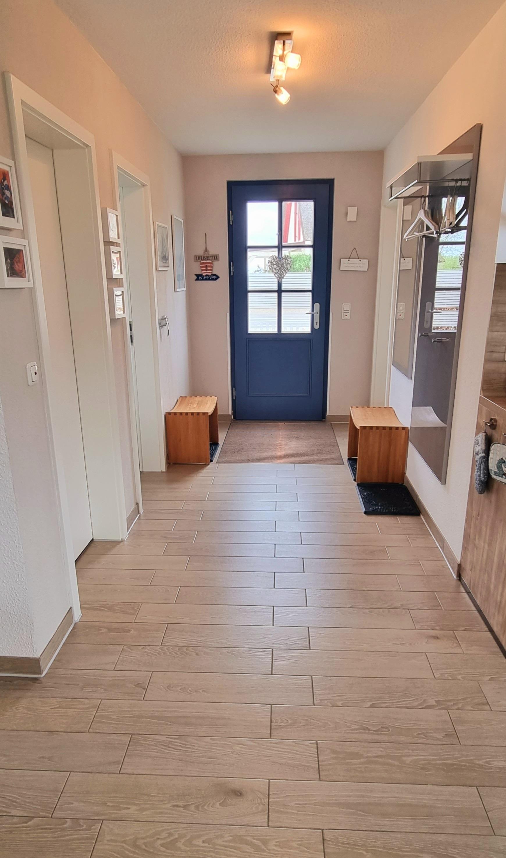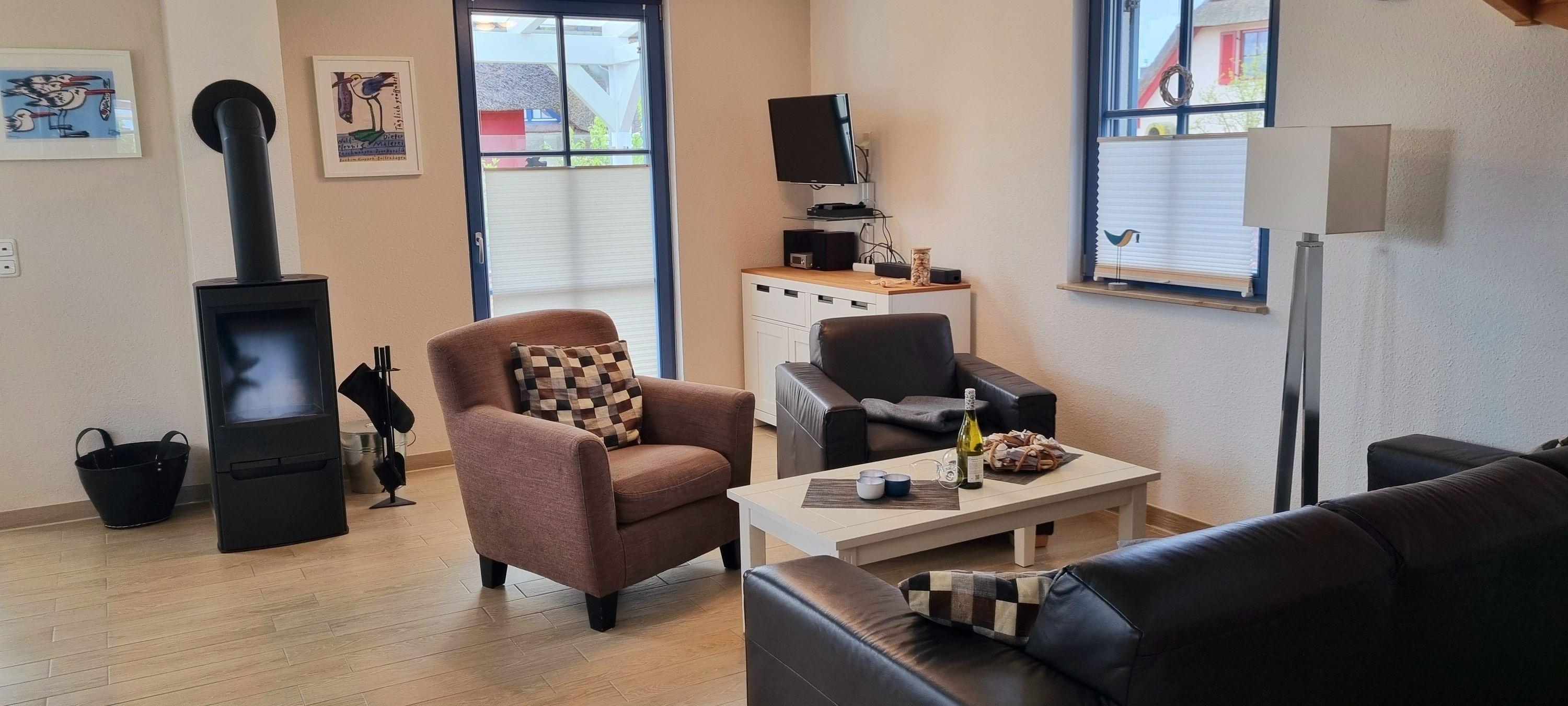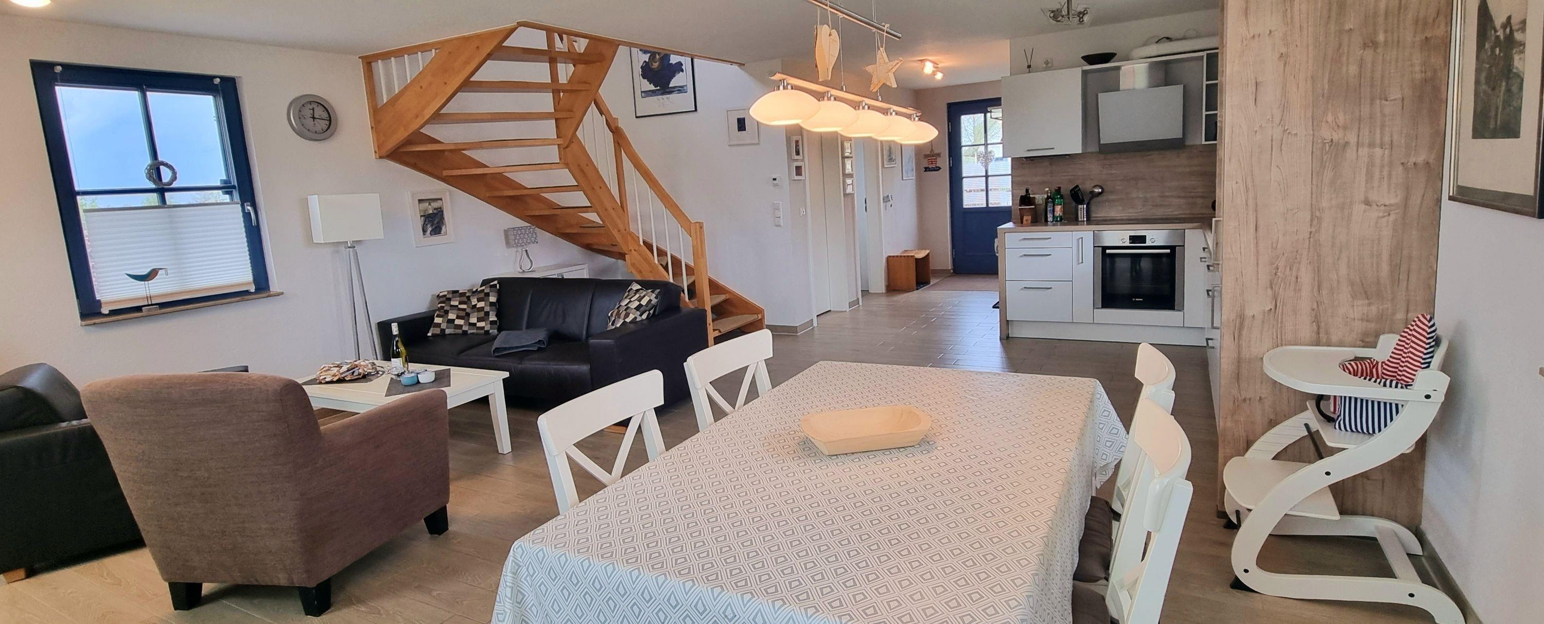 Das in 2014 errichtete Reetdachhaus mit einer Wohnfläche von 97 qm befindet sich in der neuen Ferienhaussiedlung „De Poeler Drift“ in Zierow. Das mit Echtholzmöbeln, Sprossenfenstern und Fensterläden ausgestattete Feriendomizil lädt zu jeder Jahreszeit an die mecklenburgische Ostsee ein. Ob im schönen Sommer, denn der Strand ist nicht weit, zudem gibt es einen umlaufenden Garten, aber auch in der kälteren oder auch schmuddeligen Jahreszeit, denn sowohl eine Sauna als auch ein Kaminofen sind vorhanden. Es erwartet Sie ein komplett gefliestes, mit Fußbodenheizung ausgestattetes Reetdachhaus. Eine hochwertige Innenausstattung lässt keine Wünsche offen. Das Erdgeschoss empfängt Sie mit einem großen Wohn-/Essbereich mit offener Küche und bietet ausreichend Platz für die ganze Familie. Die integrierte Küche ist voll ausgestattet mit einem hochwertigen Backofen mit Induktionskochfeld, einem Kühlschrank mit Gefrierfach, einem Geschirrspüler, Kaffeemaschine, Toaster und Wasserkocher, aber auch ein Eierkocher und Mixer sind vorhanden. Eine Ledercouchgarnitur und Sessel laden zu einem gemütlichen Abend ein. Ein Flach-TV, Blue-Ray-Player und Bluetooth-Stereoanlage bieten Unterhaltung, zudem stehen einige Bücher, Reiseführer und Spiele zur Verfügung. Im Wohnbereich steht der Kaminofen, der wohlige Wärme in der kalten Jahreszeit schenkt. Kaminholz ist mitzubringen. Der Essbereich bietet Platz für 4 Personen, ein Kinderhochstuhl ist zusätzlich vorhanden. Weiterhin befinden sich im EG ein Tageslicht-Gäste-WC, eine Sauna mit Komfortdusche und ein Hauswirtschaftsraum mit Waschmaschine, Wäscheständer, Staubsauger, Bügeleisen, Bügelbrett und Putzutensilien.