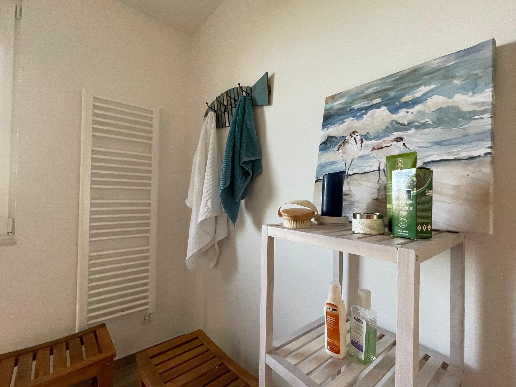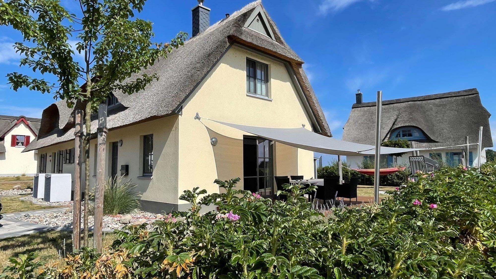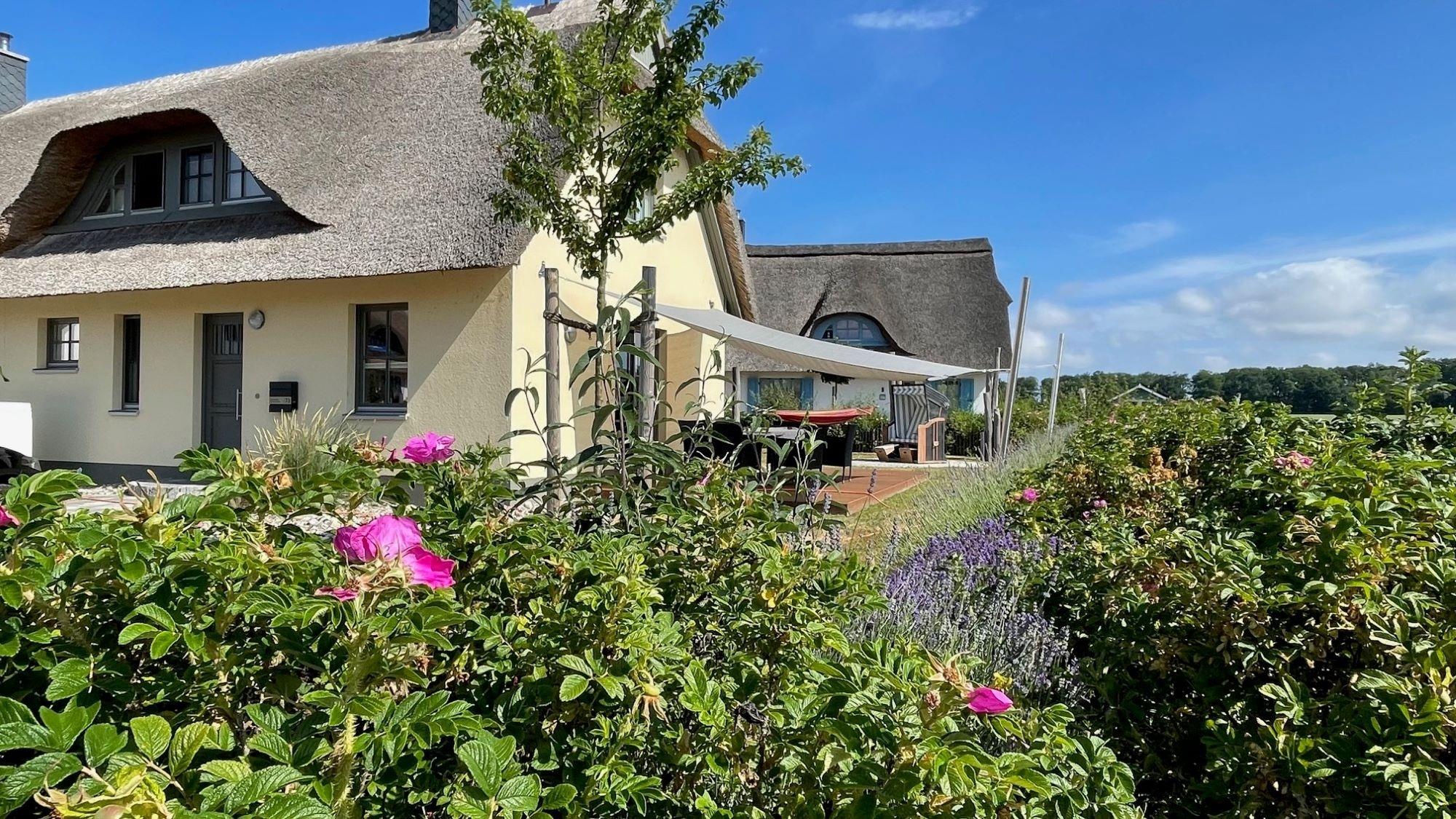 Im Garten stehen bequeme Gartenmöbel, ein eigener Strandkorb und eine Hängematte bereit. Die sonnengeschützte Holzterrasse lädt zum barfußlaufen ein. Auf der den Garten umgebenden Natursteinmauer sind Wildrosen gepflanzt. Im Mai zieht ein zarter Duft ums Haus. Im Herbst und Winter finden die Vögel in den Hagebutten Nahrung und Unterschlupf. Zum Grillen steht ein Elektrogrill von Weber zur Verfügung. Zum Naturstrand sind es ca. 400 m.