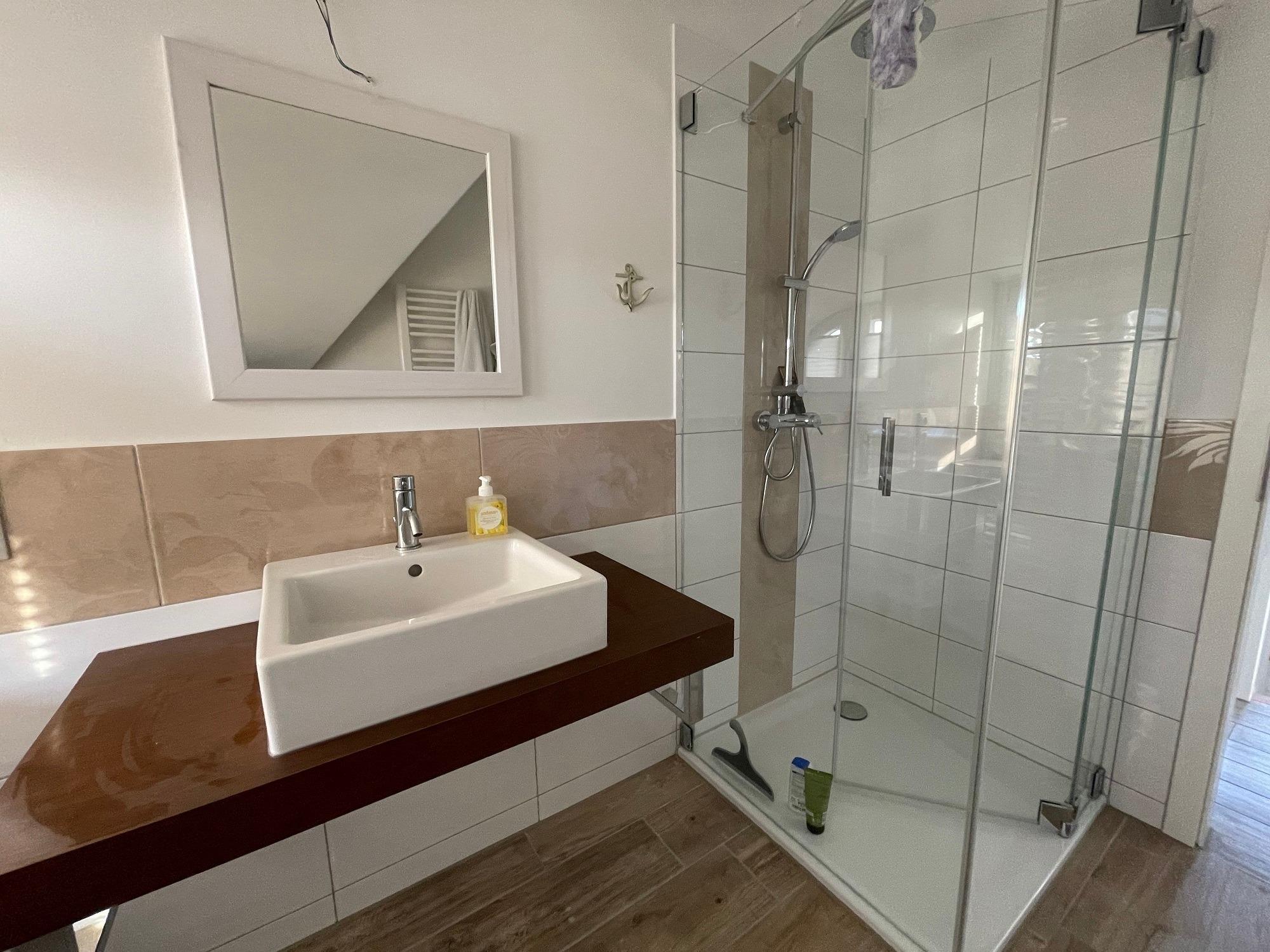 Das Duschbad mit Echtglasduschabtrennung, Waschbecken und WC ist in der typischen Fledermausgaube des Reethauses eingerichtet. Zum Sichtschutz sind Plissees und Vorhänge angebracht.