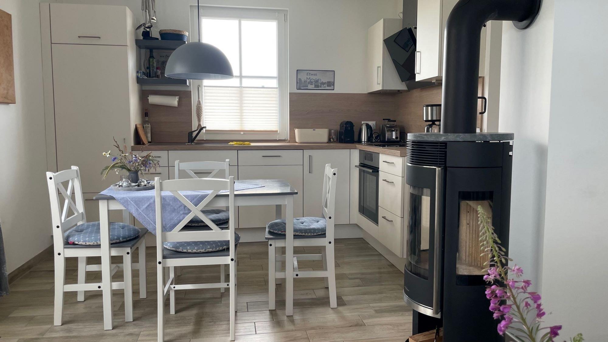 Das ganze Haus ist im skandinavischen Stil eingerichtet und mit Fußbodenheizung ausgestattet. Die Küche ist modern und mit vielen Extras ausgestattet. Das von allen Seiten sichtbare Kaminfeuer bringt eine wohlige Stimmung ins Haus. Die Sauna mit Wellnessdusche im Erdgeschoss bietet angenehm Platz zum Erholen. Durch das Fenster des Ruheraumes kann der Blick über die Felder bis zum Meer schweifen. Das Gäste-WC mit Tageslicht befindet sich ebenfalls im Erdgeschoss.