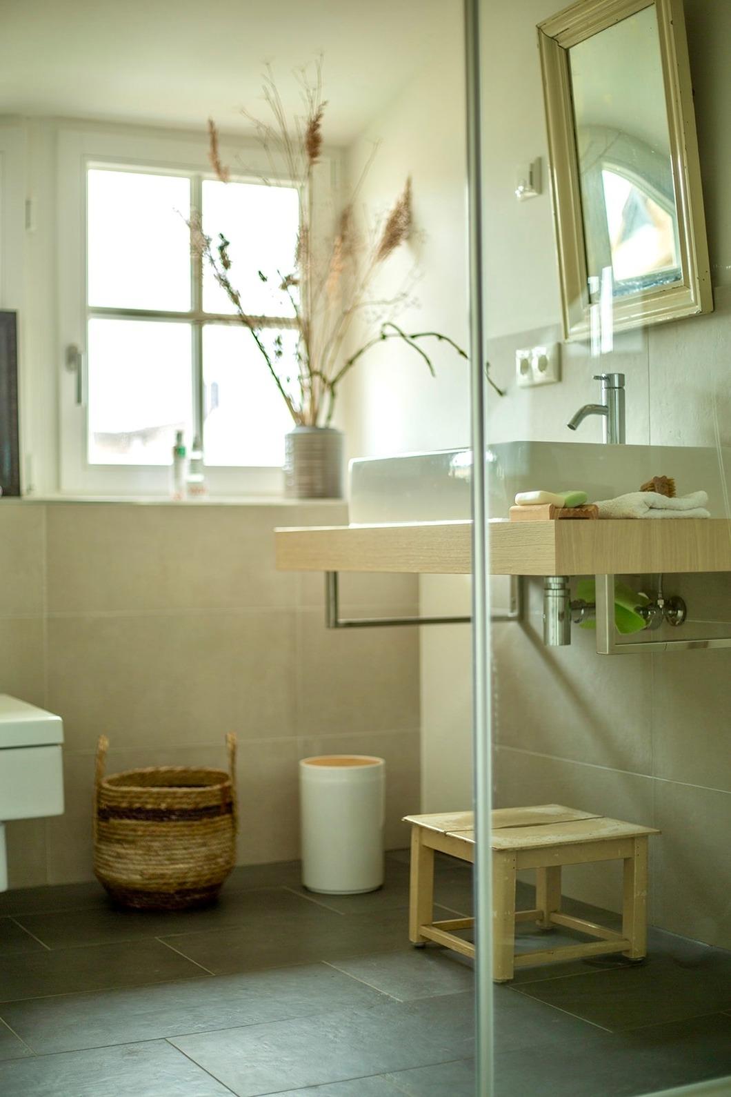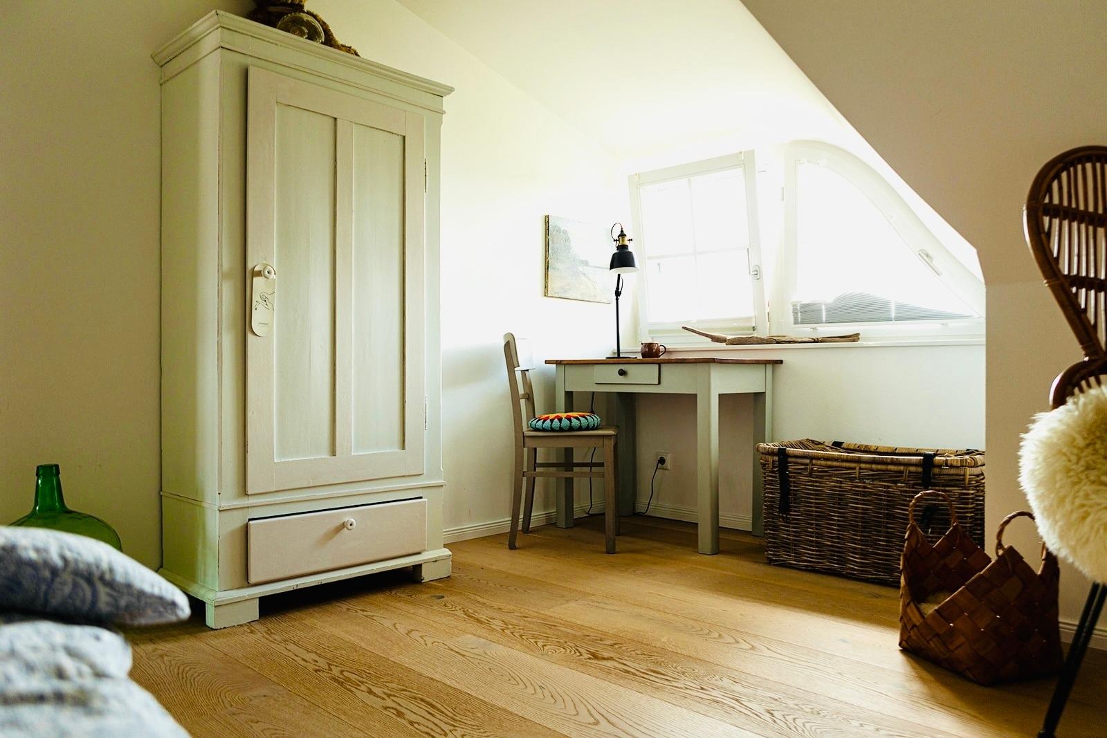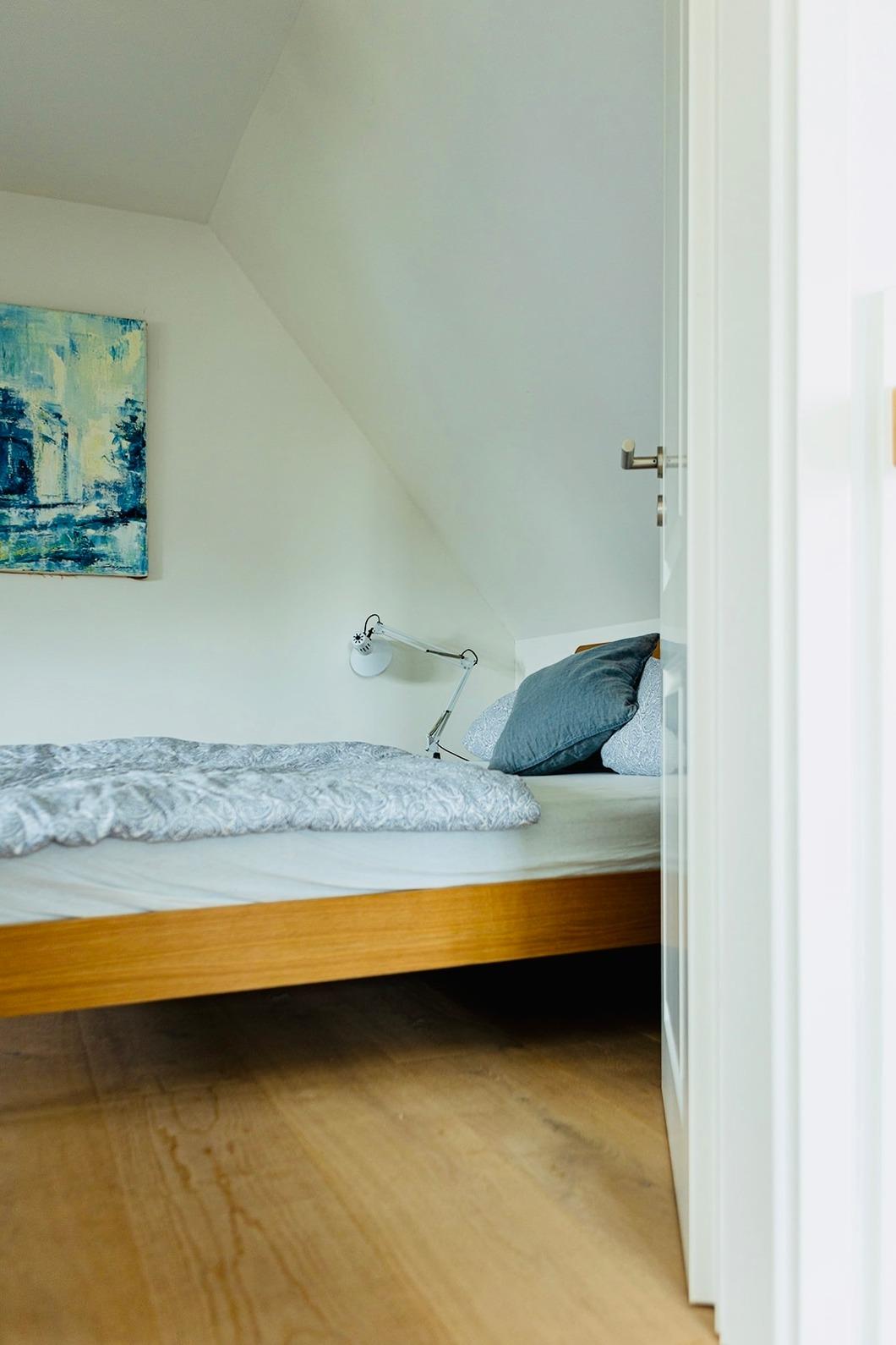 Die Treppe hinauf geht es zu den beiden gemütlichen Schlafzimmern und einem großzügigen Duschbad mit Handtuchheizung. Ein Schlafzimmer ist mit einem 160er Doppelbett ausgestattet, in dem zweiten Schlafzimmer finden Sie zwei Einzelbetten. Insgesamt bietet das Haus Platz für bis zu 4 Personen.