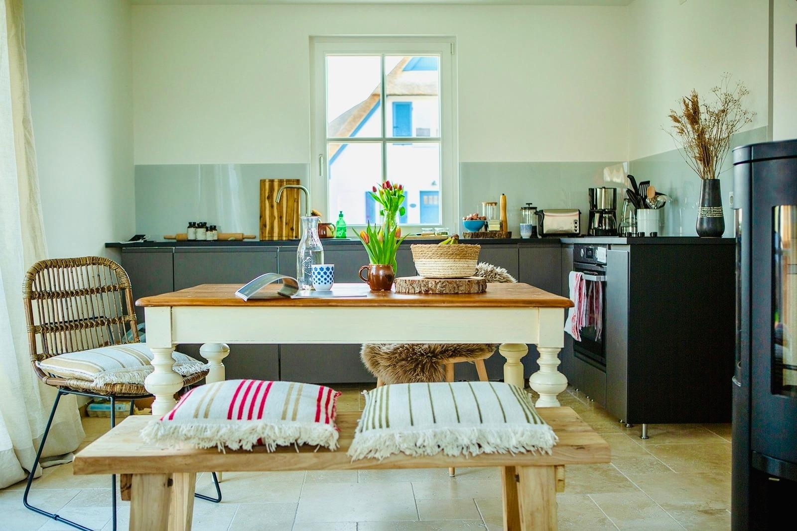Die 2021 fertiggestellte Reetdach-Doppelhaushälfte wurde von uns liebevoll eingerichtet und ausgestattet. Im Erdgeschoss empfängt Sie die offen gestaltete Wohnküche mit einer voll ausgestatteten Küchenzeile (Backofen, Cerankochfeld, Geschirrspüler, Kaffeemaschine, SodaStream, Toaster, Wasserkocher u.v.m.), einem wunderbaren Essplatz mit Blick in den Garten und eine gemütliche Sofaecke mit Kaminofen. Hier finden Sie alles, um gemeinsam den Tag zu beginnen oder mit einem Kochabend und einem Glas Wein vor dem Kamin ausklingen zu lassen. Eine Auswahl an Gesellschaftsspielen, Spielzeug und (Kinder)Büchern ist ebenfalls vorhanden. Auf derselben Ebene befindet sich auch ein Hauswirtschaftsraum mit Waschmaschine sowie kleinem Gefrierschrank, ein separates WC und ein kleiner, aber feiner Wellnessbereich mit Sauna und begehbarer Rainshower-Dusche.