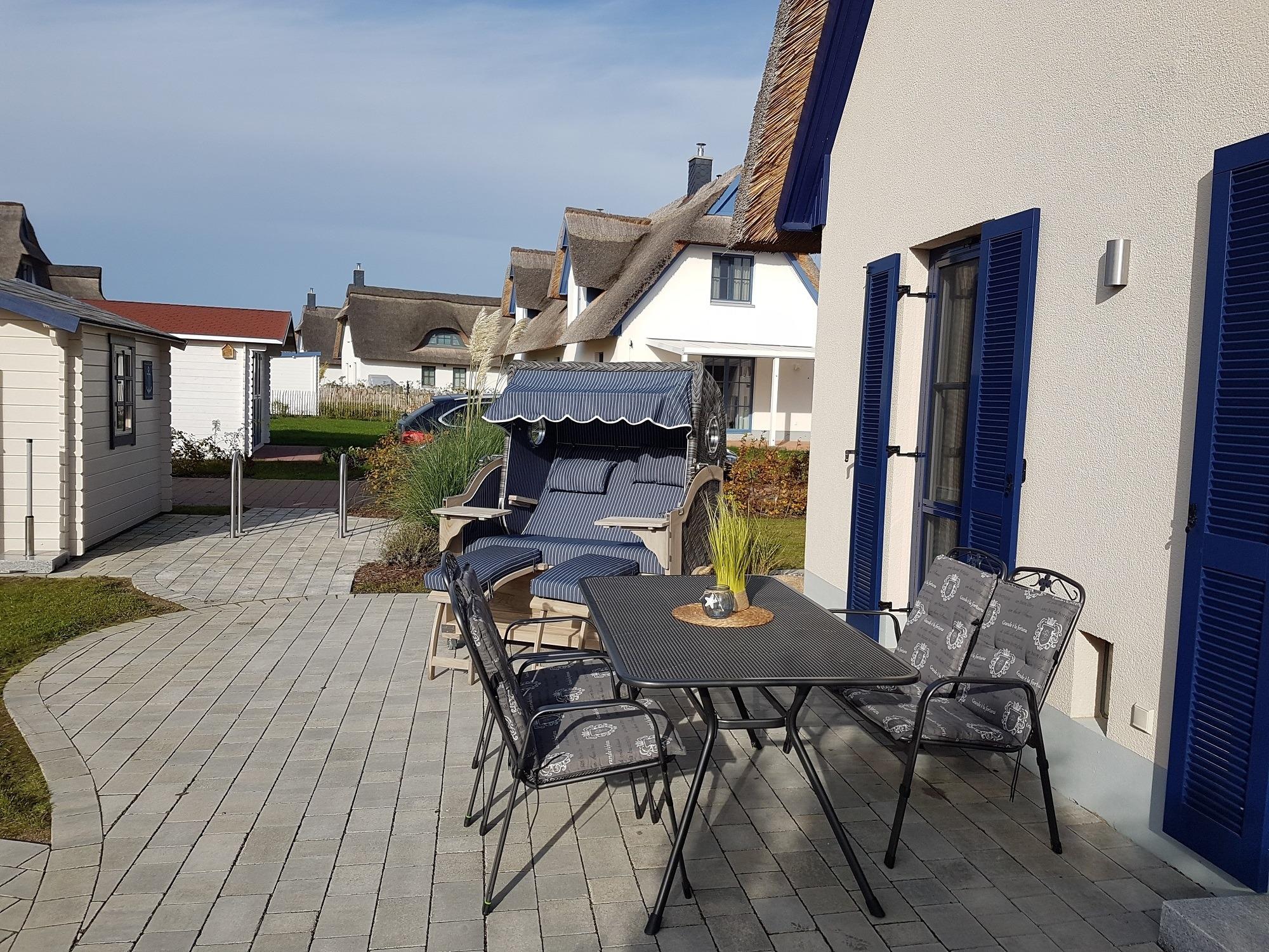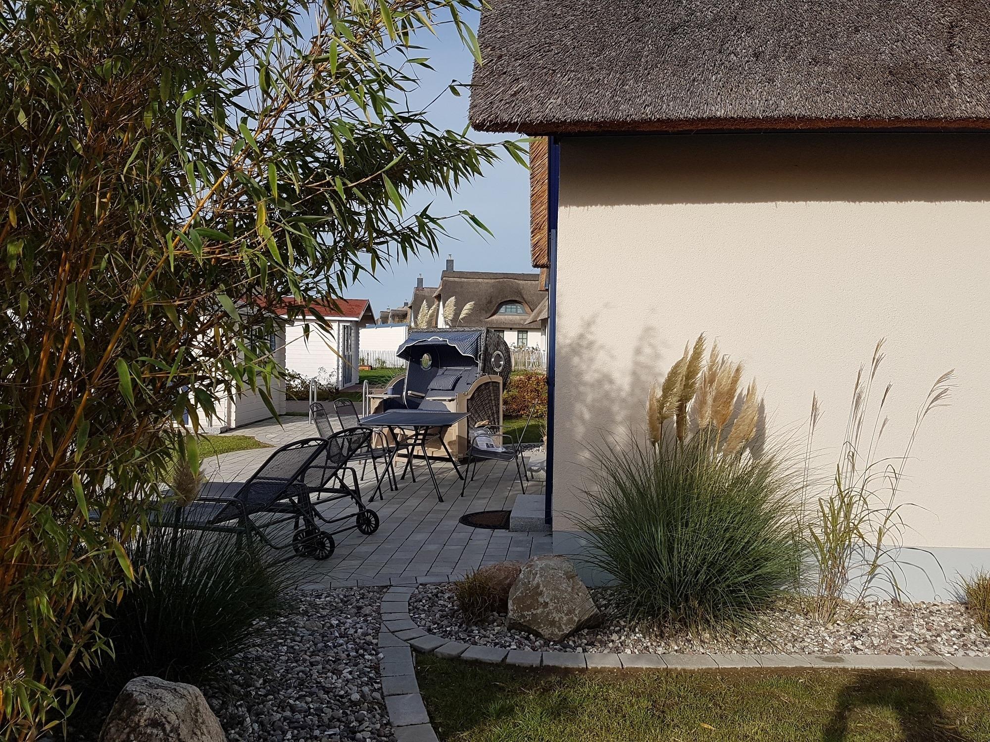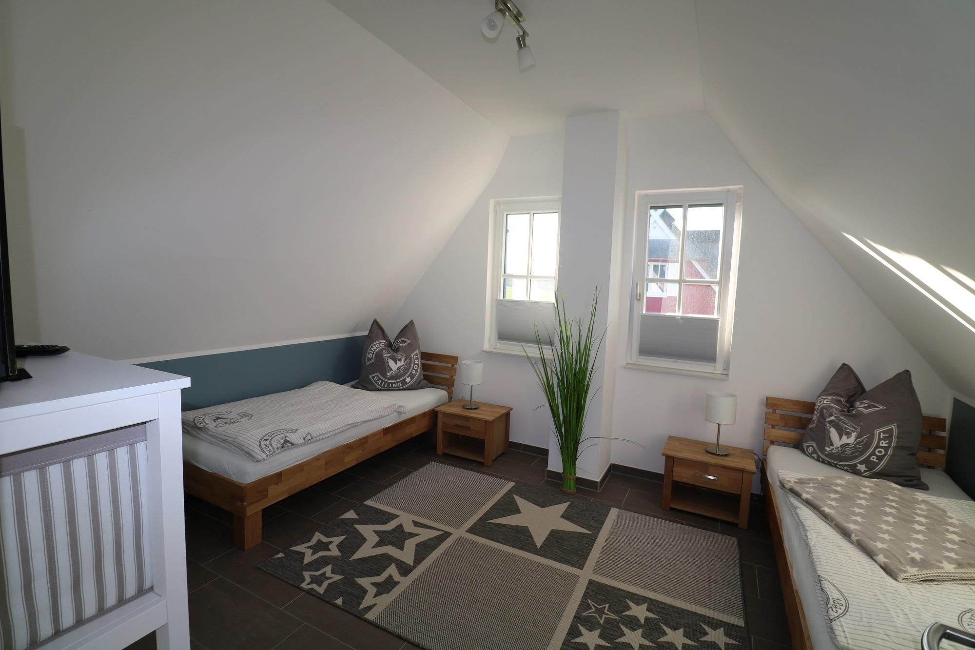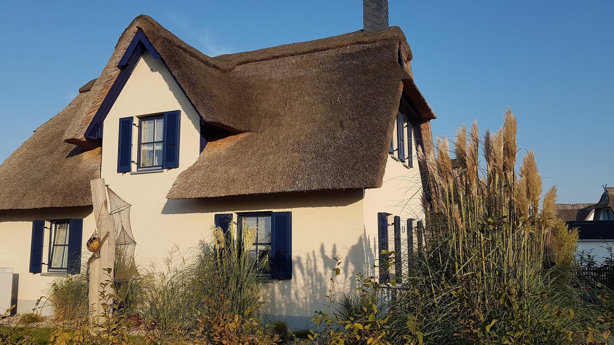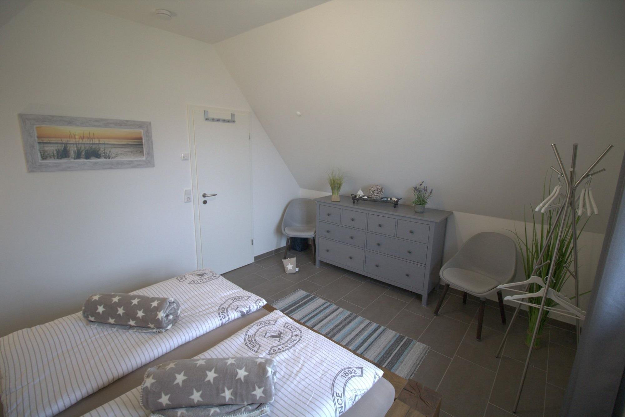 Im Obergeschoss befindet sich das Vollbad mit typischer Fledermausgaube und zwei Schlafzimmern. Im Elternschlafzimmer steht ein Doppelbett, sowie eine große Kommode und ein Garderobenständer zur Verfügung. Von hier aus haben Sie einen schönen Blick über das Reethausgebiet bis hin zur Insel Poel und der Ostseeküste. Im Kinderschlafzimmer stehen zwei Einzelbetten, eine Kommode, ein 2. TV, eine Sitztruhe und ein Regal. So haben Ihre Kinder viel Platz um Ihre Ferien an der Ostsee zu genießen. Alle Schlafräume, die Badezimmer und eine Terrassentür im Wohnzimmer sind mit Fliegengitter ausgestattet. Auf der möblierten Südterrasse stehen Gartenmöbel, 2 Sonnenliegen und ein sehr gemütlicher XL-Strandkorb bereit und laden zum Verweilen und Entspannen ein.