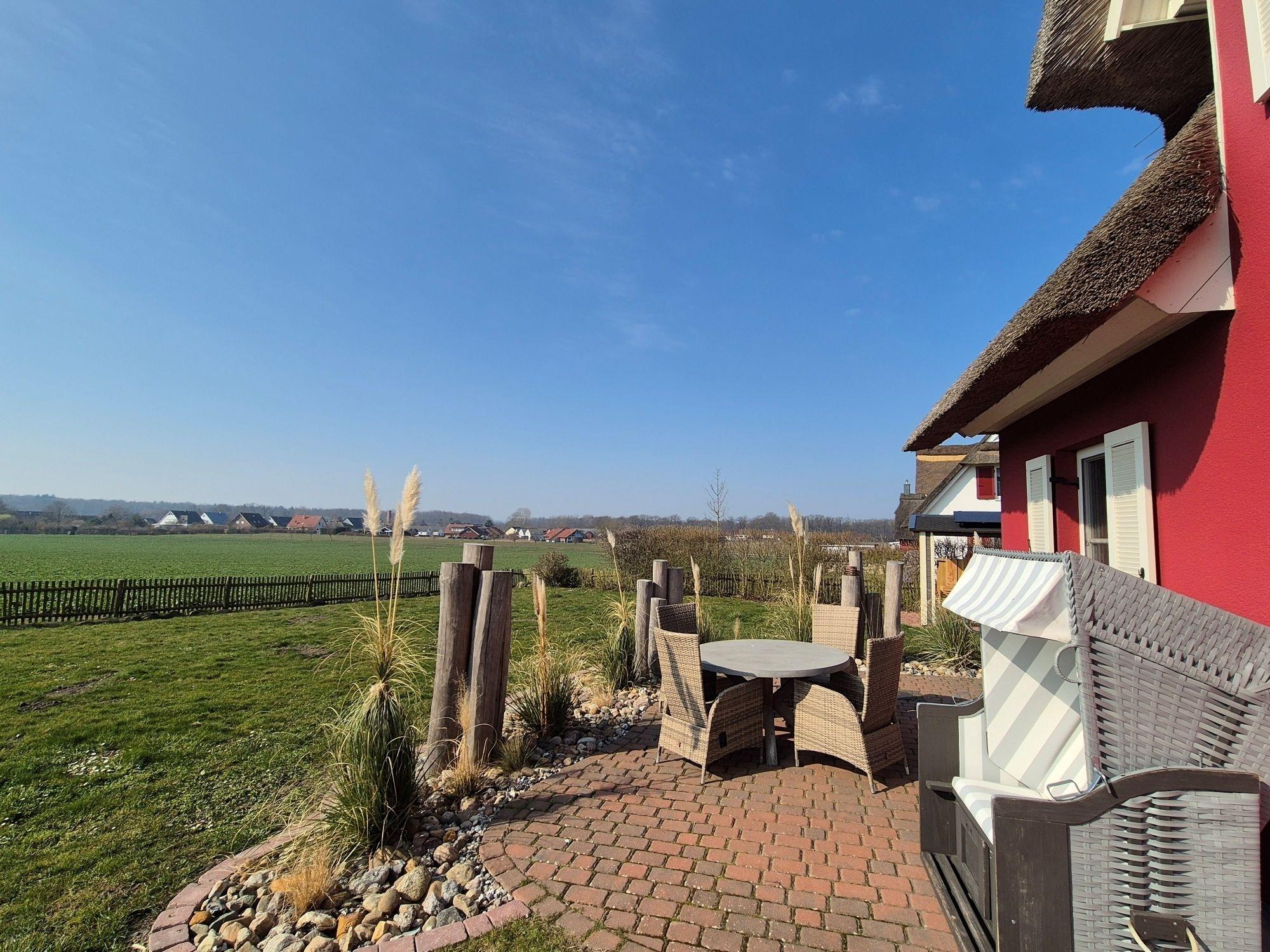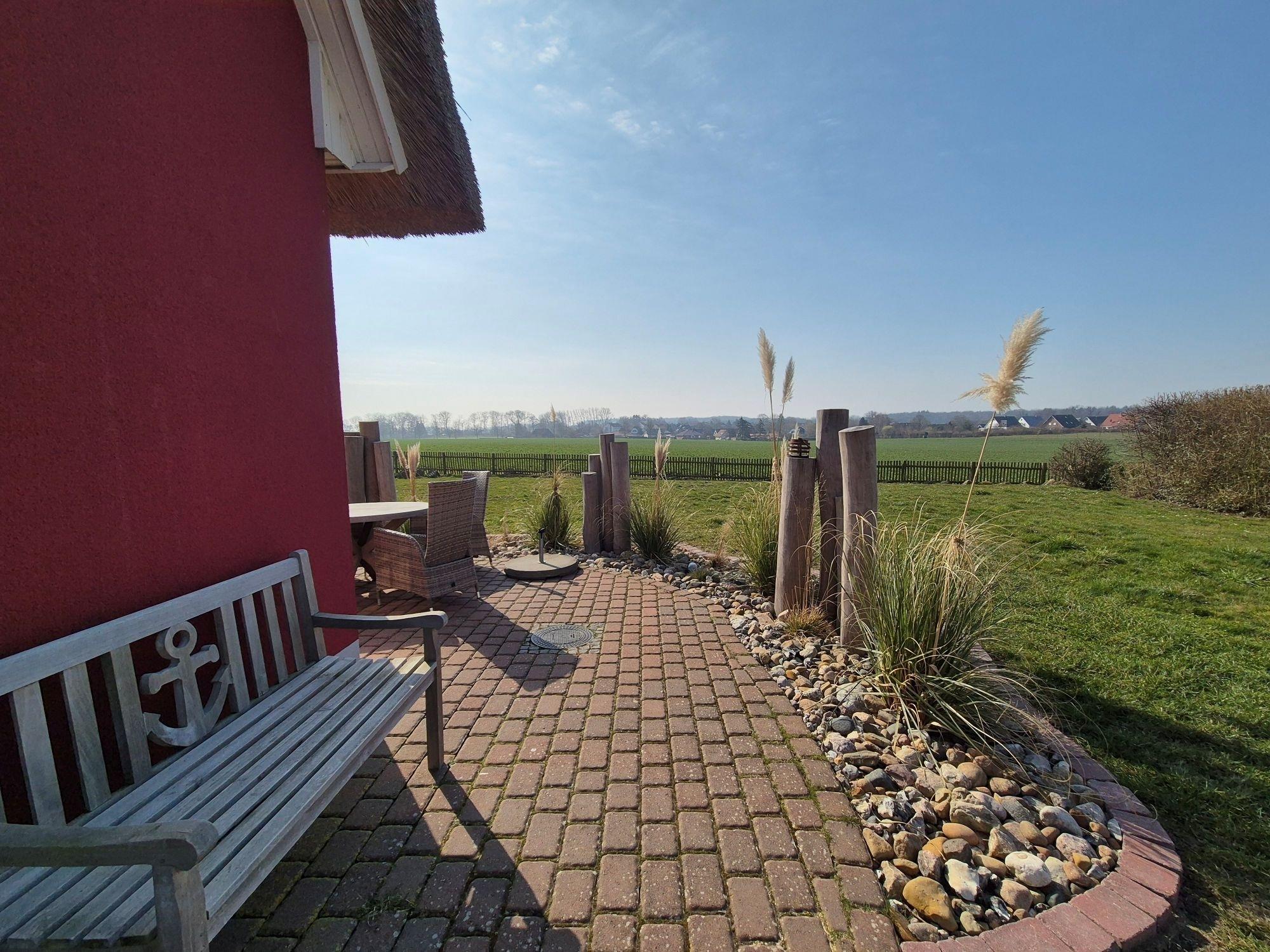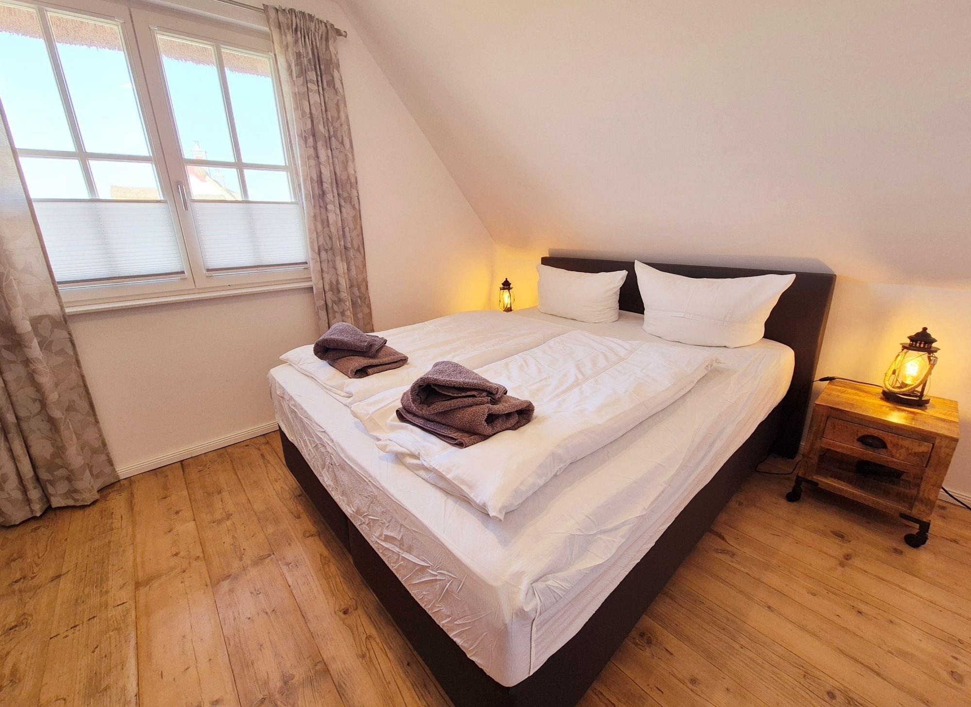 Im oberen Bereich stehen Ihnen zwei Schlafzimmer mit je einem Boxspringbett und Kommoden zur Verfügung. Ein 2. TV ist in einem Schlafzimmer vorhanden. Das Duschbad mit Echtglasduschabtrennung, Waschbecken und WC ist in der typischen Fledermausgaube des Reethauses eingerichtet. Im gesamten Haus ist eine Fußbodenheizung verlegt. Zum Sichtschutz sind Pliesses, Vorhänge und Fensterklappläden angebracht. Ein Waschmaschine und Trockner und diverse Putzutensilien sowie Bügelbrett und Bügeleisen sind im HWR verstaut. Im Garten zur Südseite können Sie es sich auf den Gartenmöbel bequem machen und Blicke über die Wiesen und Felder Ihre Blicken schweifen lassen. Ein Sonnenschirm ist vorhanden. Zusätzlich ist ein Strandkorb und Loungemöbel zum Entspannen im Garten vorhanden. Zum Grillen steht Ihnen ein Elektrogrill von Weber zur Verfügung. Zum Naturstrand sind es ca. 500 m. Hier sind Hunde erlaubt. Zwei Stellplätze befinden sich direkt am Ferienhaus.