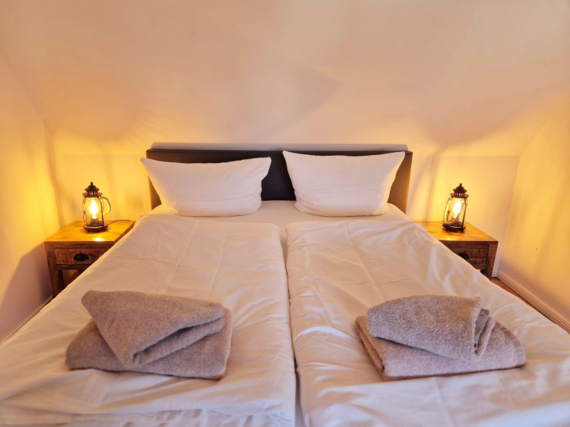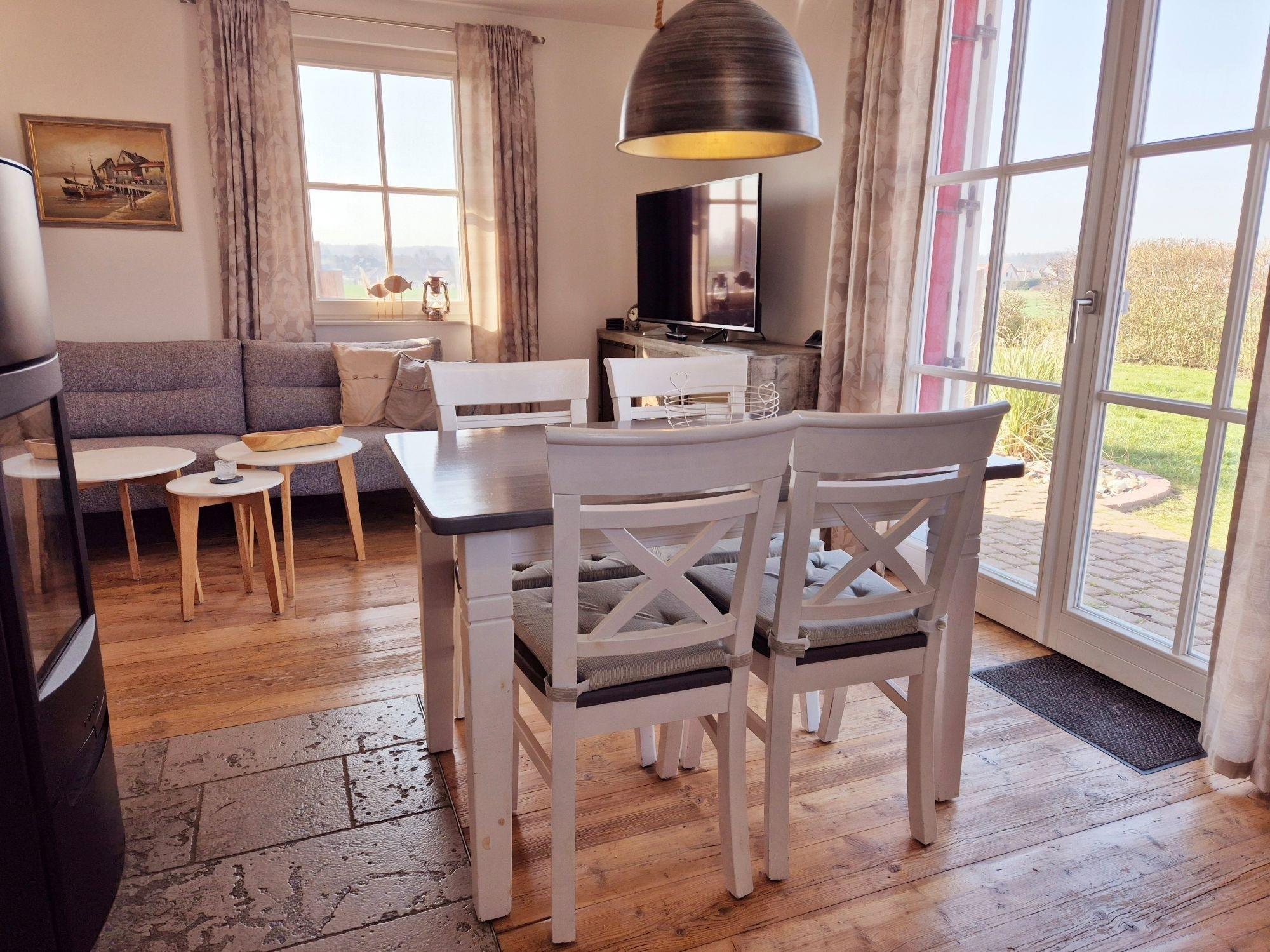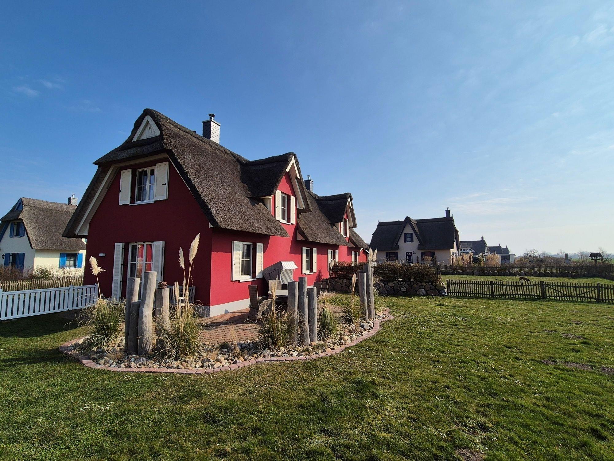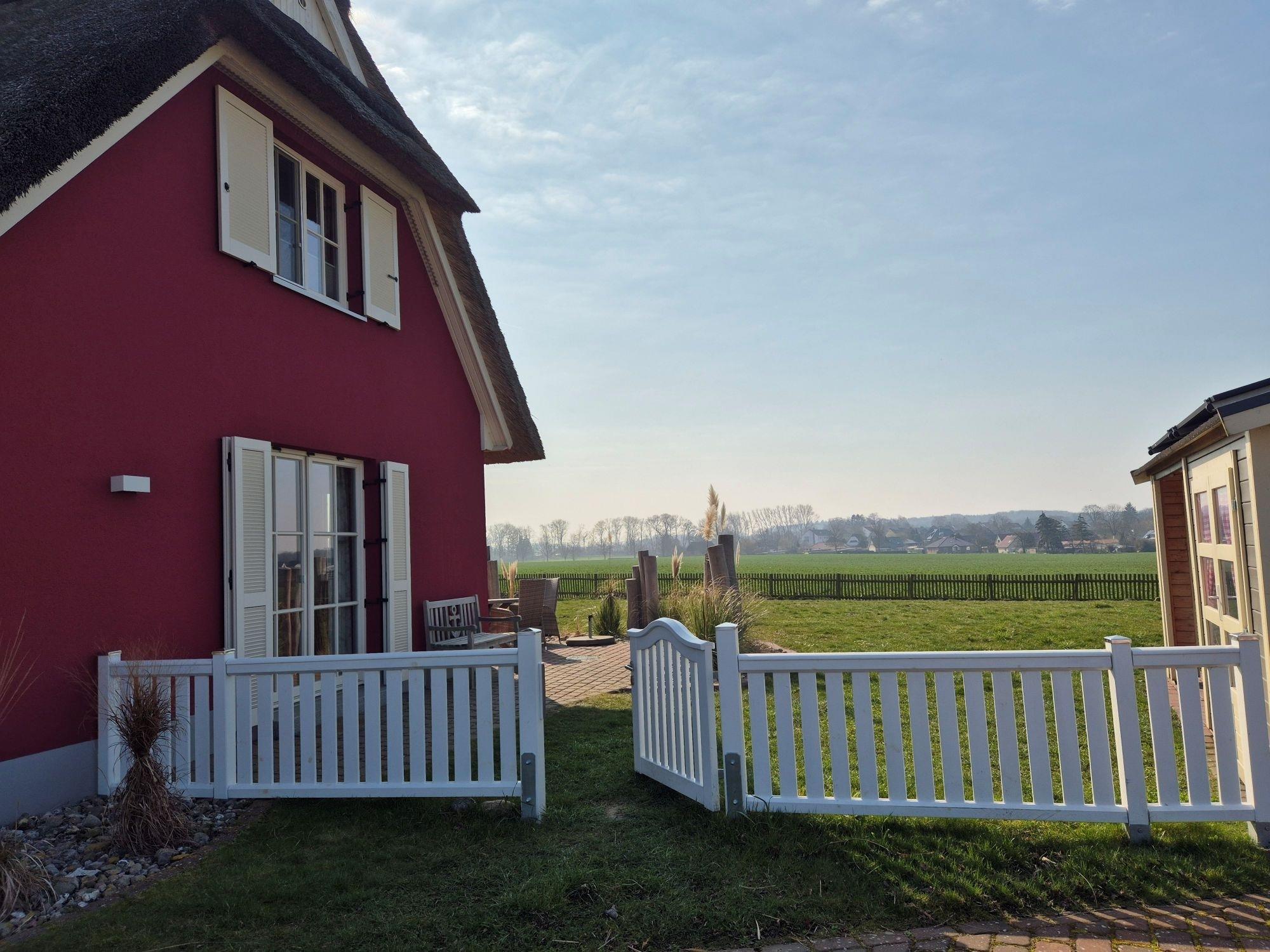 Im oberen Bereich stehen Ihnen zwei Schlafzimmer mit je einem Boxspringbett und Kommoden zur Verfügung. Ein 2. TV ist in einem Schlafzimmer vorhanden. Das Duschbad mit Echtglasduschabtrennung, Waschbecken und WC ist in der typischen Fledermausgaube des Reethauses eingerichtet. Im gesamten Haus ist eine Fußbodenheizung verlegt. Zum Sichtschutz sind Pliesses, Vorhänge und Fensterklappläden angebracht. Ein Waschmaschine und Trockner und diverse Putzutensilien sowie Bügelbrett und Bügeleisen sind im HWR verstaut. Im Garten zur Südseite können Sie es sich auf den Gartenmöbel bequem machen und Blicke über die Wiesen und Felder Ihre Blicken schweifen lassen. Ein Sonnenschirm ist vorhanden. Zusätzlich ist ein Strandkorb und Loungemöbel zum Entspannen im Garten vorhanden. Zum Grillen steht Ihnen ein Elektrogrill von Weber zur Verfügung. Zum Naturstrand sind es ca. 500 m. Hier sind Hunde erlaubt. Zwei Stellplätze befinden sich direkt am Ferienhaus.
