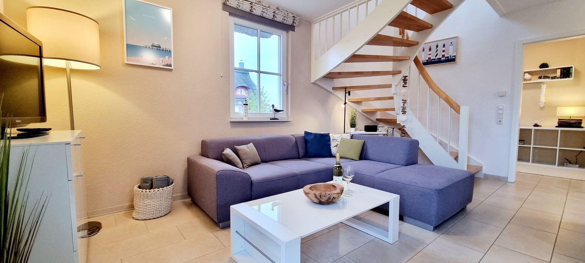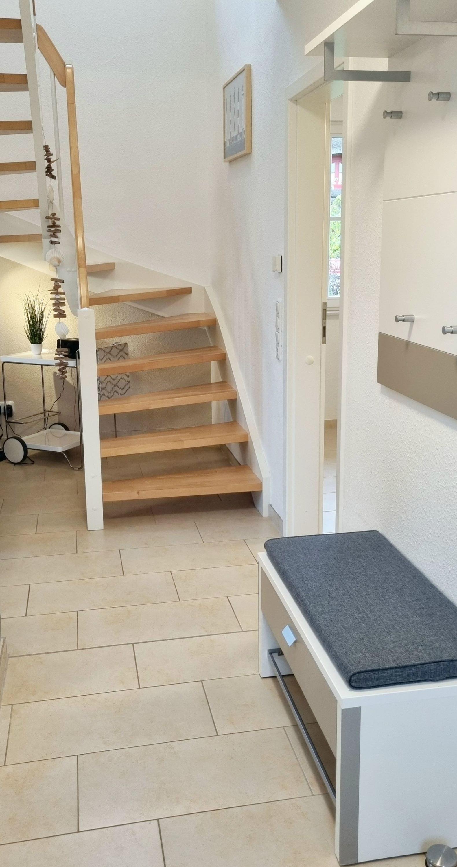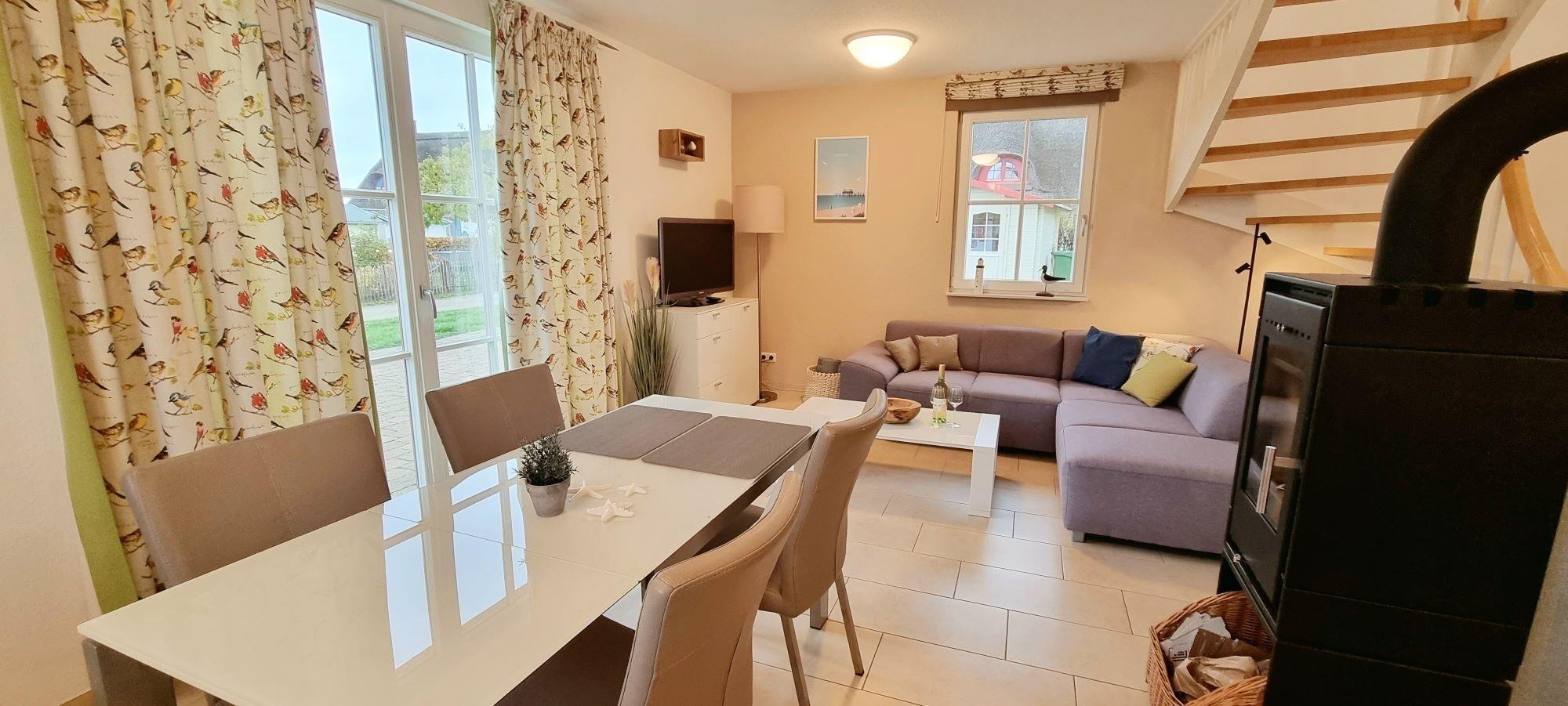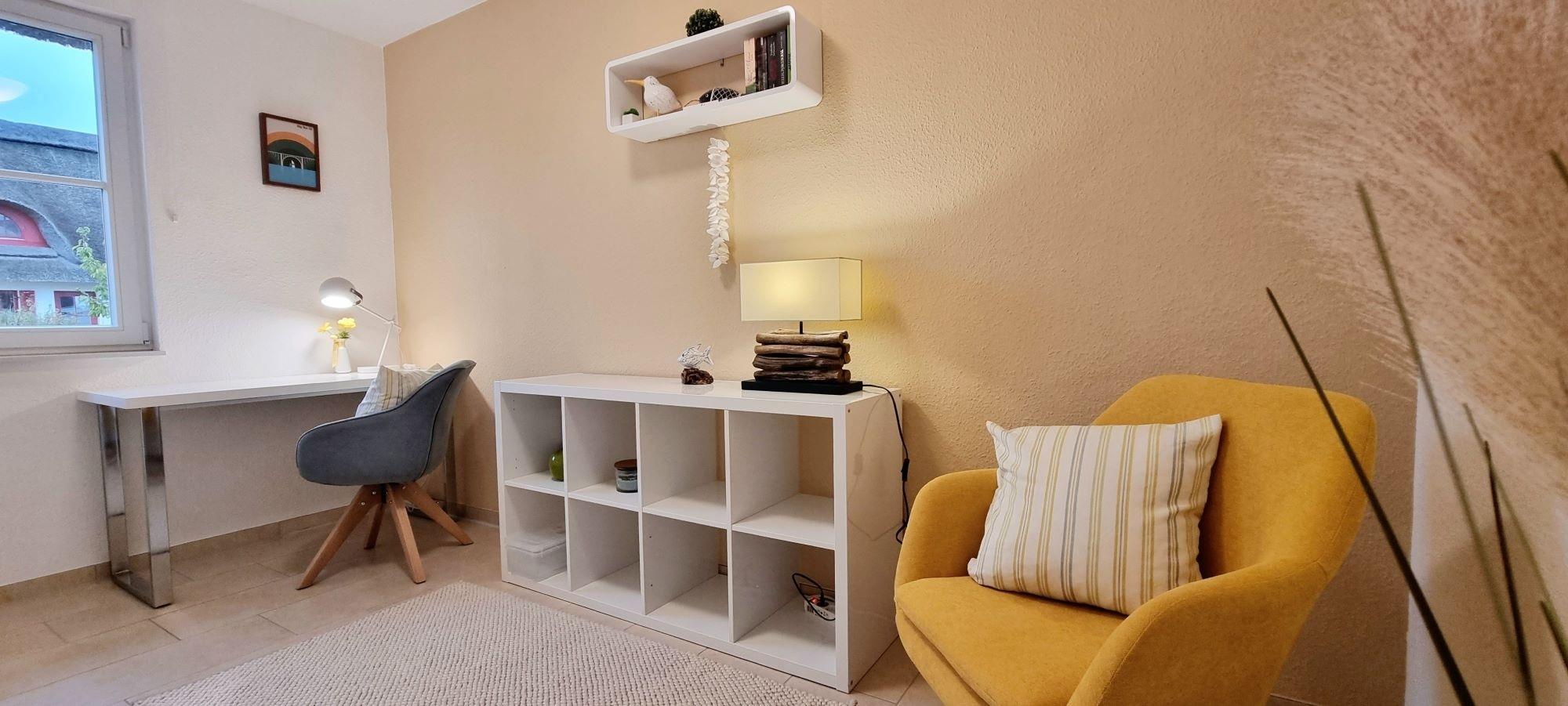 Das beschauliche Zierow ist ein staatlich anerkannter Erholungsort. Die Lage ist ideal für Badeurlauber, Naturliebhaber und Sportbegeisterte. Es bietet sich die Gelegenheit zum Surfen, Reiten in Zierow, Golfen im nahegelegenen Club oder ausgedehnte Wander- und Fahrradtouren. Alle Zimmer des Ferienhauses verfügen über einen gefliesten Boden mit Fußbodenheizung. Im Erdgeschoss finden Sie den Wohn-Essbereich. Hier sorgt der Kaminofen an kalten Tagen für ein angenehmes Ambiente. Ein kostenloses Glasfaser-WLAN ist installiert. Daneben finden Sie im Erdgeschoss noch das Arbeitszimmer mit Schreibtisch. Dies bietet für Ihren Workation-Aufenthalt die ideale Lösung Freizeit und Arbeit zu verbinden. Ein bequemer Schaukelstuhl sorgt im Arbeitszimmer für erholsame Pausen, kann aber auch einfach als gemütlicher Lesesessel genutzt werden.
