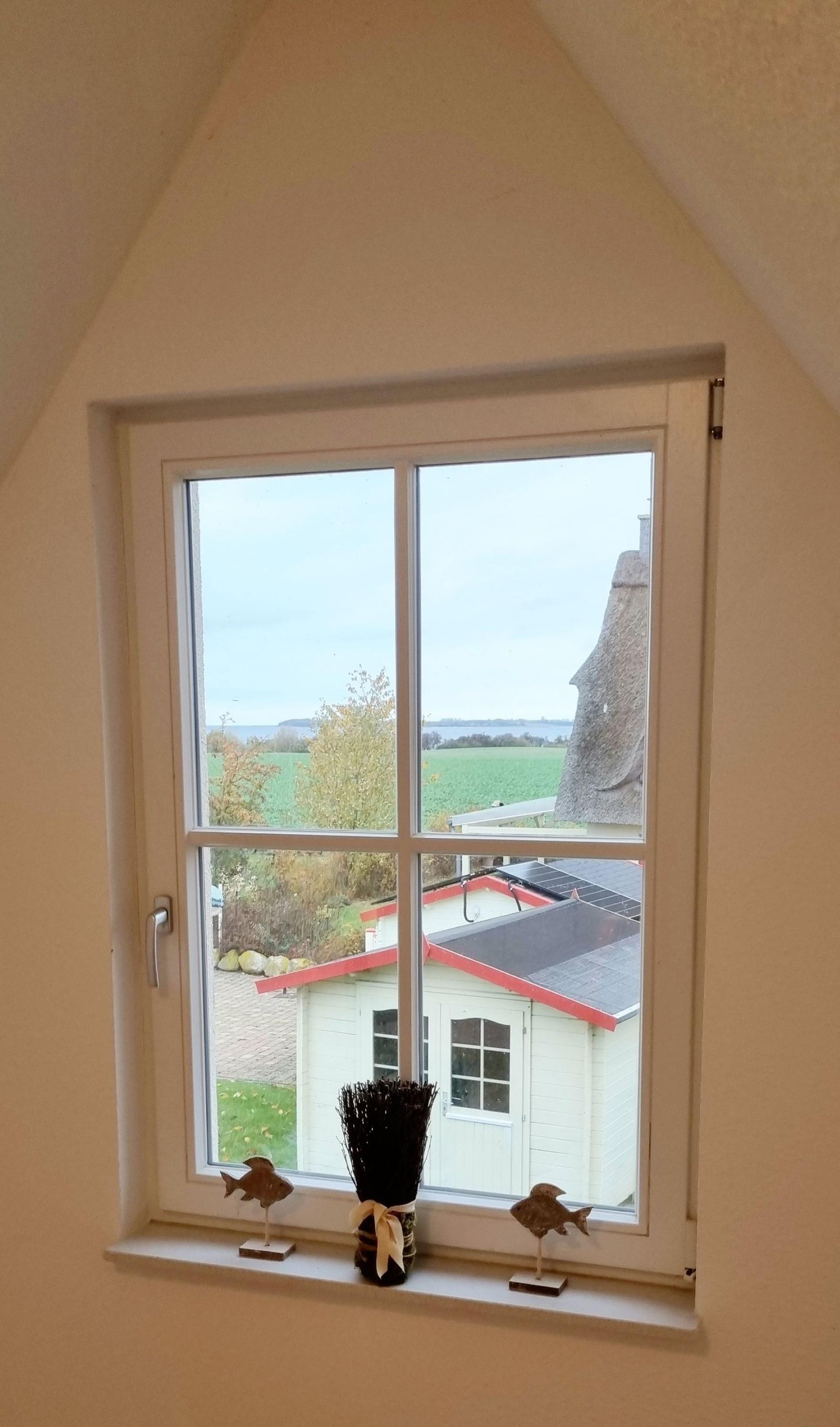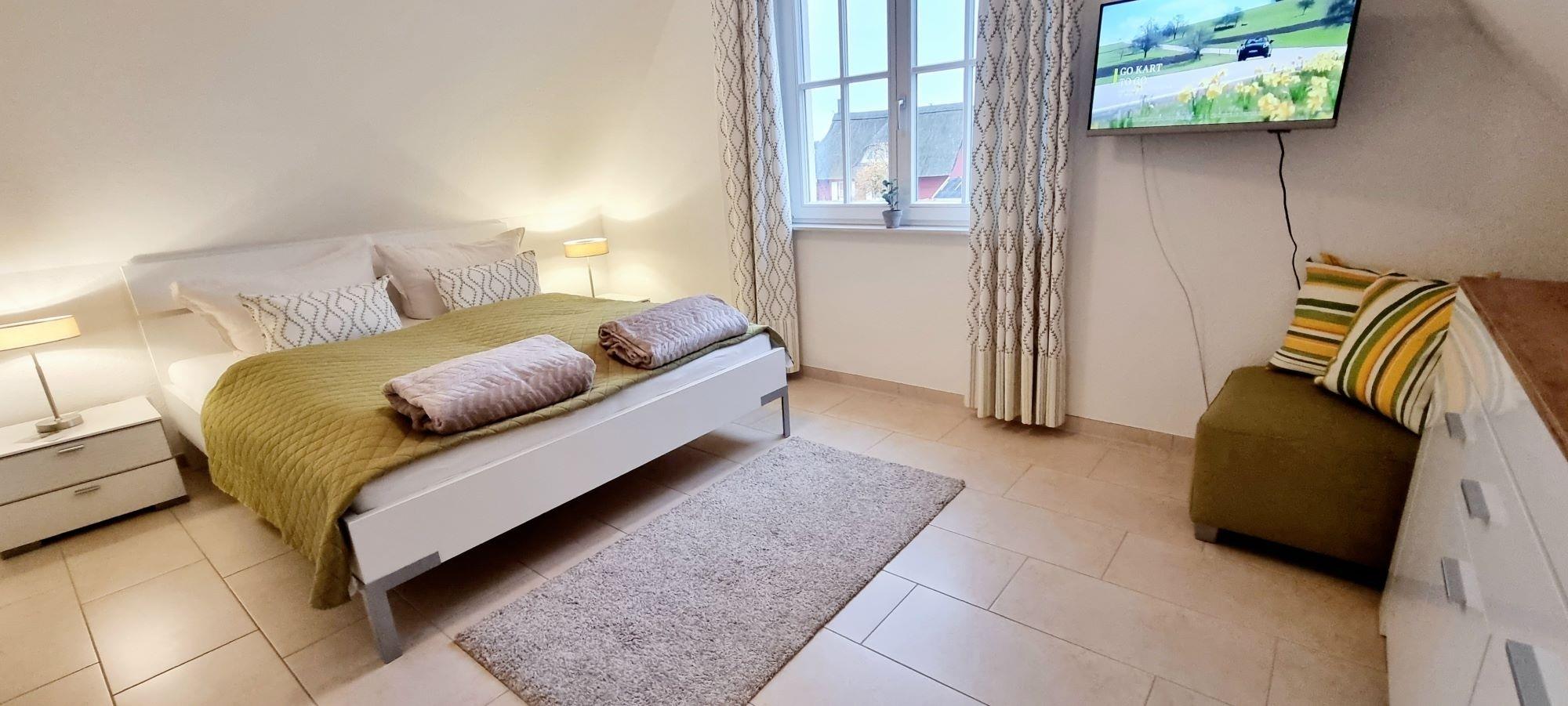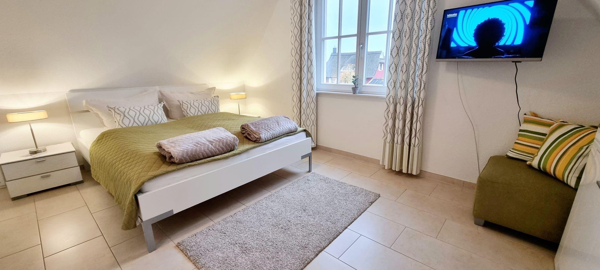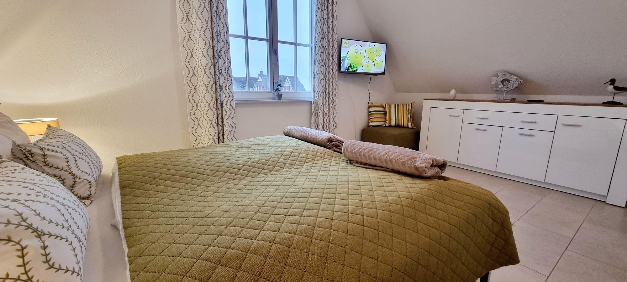 Im Obergeschoss ist das moderne Schlafzimmer mit Doppelbett und Kommode sowie ein zweites TV-Gerät. Vom Flur aus erreichen Sie das Ankleidezimmer mit einer großen Recamiere. Das großzügige Duschbad ist modern ausgestattet und verfügt über Tageslicht. Im Garten können Sie auf der sonnigen überdachten Westterrasse gemütlich Speisen oder Ihren Urlaubstag am Grill und fantastischem Seeblick ausklingen lassen. Ein Strandkorb zum Relaxen steht direkt am Ferienhaus. Auf der Terrasse wurden Holzbuhnen aufgestellt und bieten einen wunderbaren Sicht- und Windschutz. Vor dem Haus können Sie Ihren PKW abstellen.