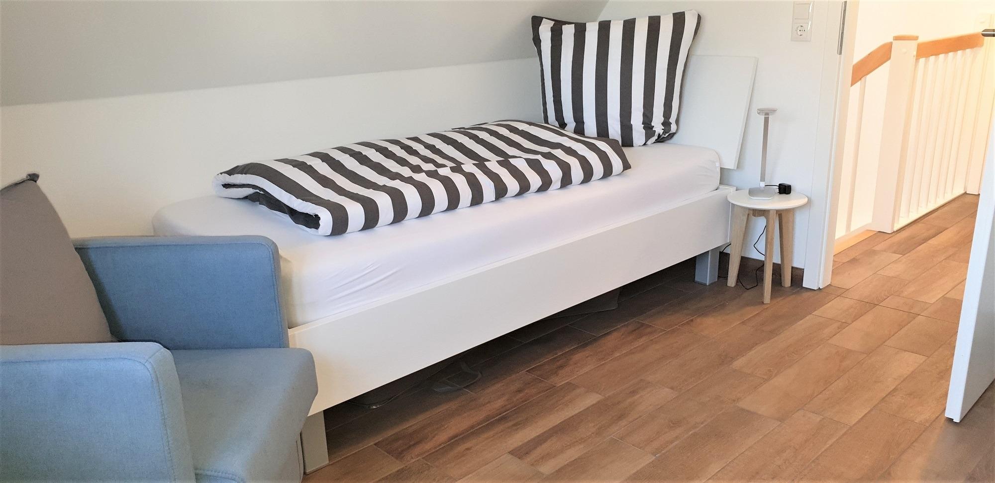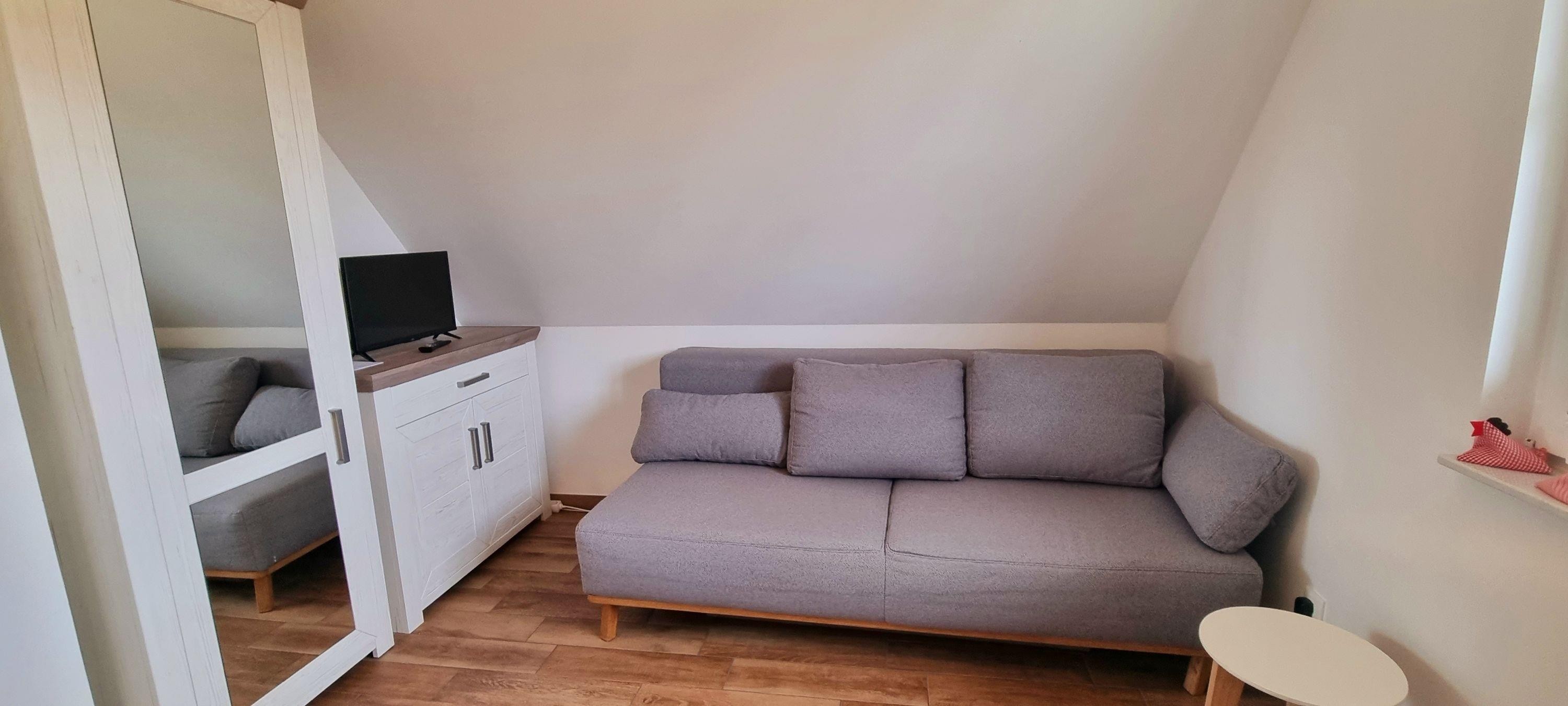 Im Obergeschoss befinden sich zwei Schlafzimmer und ein weiteres Badezimmer mit Dusche. Das erste Schlafzimmer ist mit einem Doppelbett, Schreibtisch und Schrank ausgestattet. Ein Kinderreisebett steht für die kleinen Gäste zur Verfügung. Das zweite Schlafzimmer bietet eine komfortable Schlafcouch, ein Einzelbett und einen zusätzlichen Fernseher.