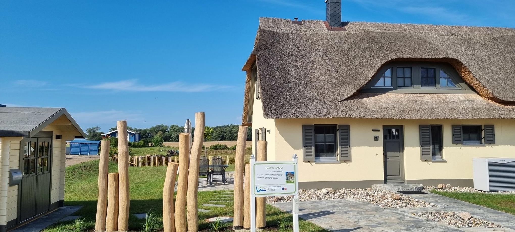 Das Ferienhaus mit dem Namen "MOOI" befindet sich unter einem Reetdach und bietet einen Blick auf den See. Es ist modern eingerichtet und bietet Platz für bis zu 5 Personen. Das Doppelhaus verfügt über einen geräumigen Wohn- und Essbereich mit Zugang zur Westterrasse. Die moderne Küche ist detailliert ausgestattet. Ein Kinderhochstuhl steht bereit. Im Erdgeschoss gibt es außerdem ein Gäste-WC und ein Badezimmer mit Wellnessdusche und Sauna, um sich vom Alltag zu erholen. Im Hauswirtschaftsraum befinden sich nützliche Utensilien für einen unbeschwerten Urlaub an der Ostsee, wie eine Waschmaschine und ein Elektrogrill.