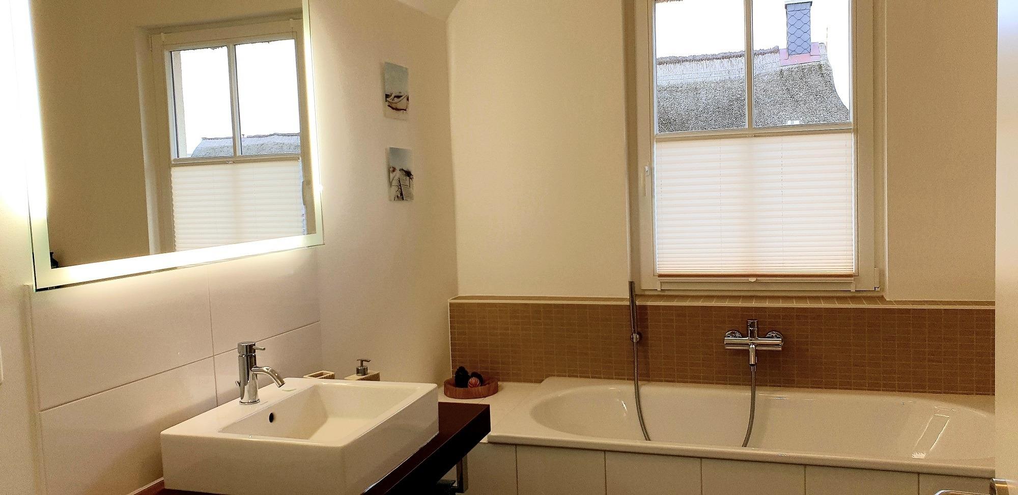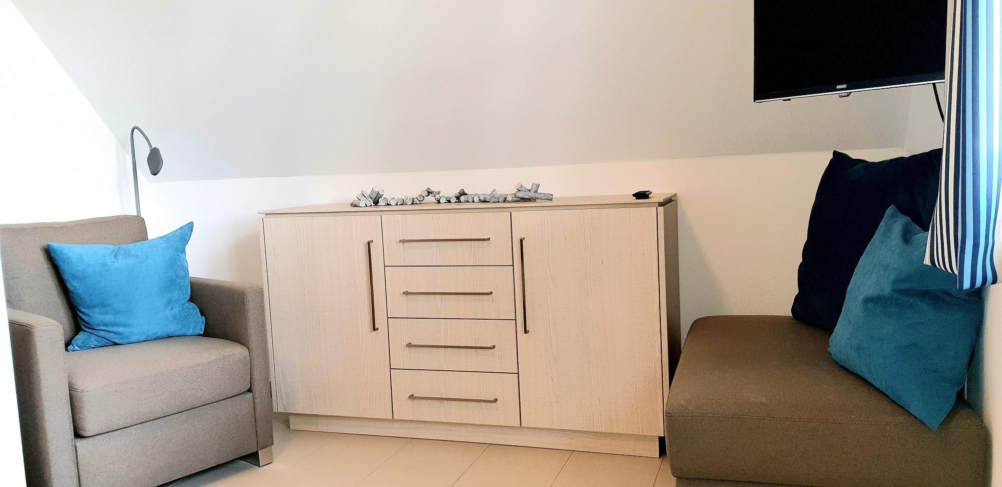 Im Obergeschoss der Ostseemuschel finden Sie das Schlafzimmer mit Lesesessel und TV, ein großzügiges Badezimmer mit Badewanne und separater Dusche und einen begehbaren Kleiderschrank. Im Schlafzimmer kann auf Anfrage ein Kindereisebett aufgestellt und hinzugebucht werden.[nbsp] Ein großer und offen gestalteter Wohn- und Essbereich mit gemütlicher Sitzgruppe befindet im Erdgeschoss. Hier spendet der Kaminofen im Winter wohlige Wärme.