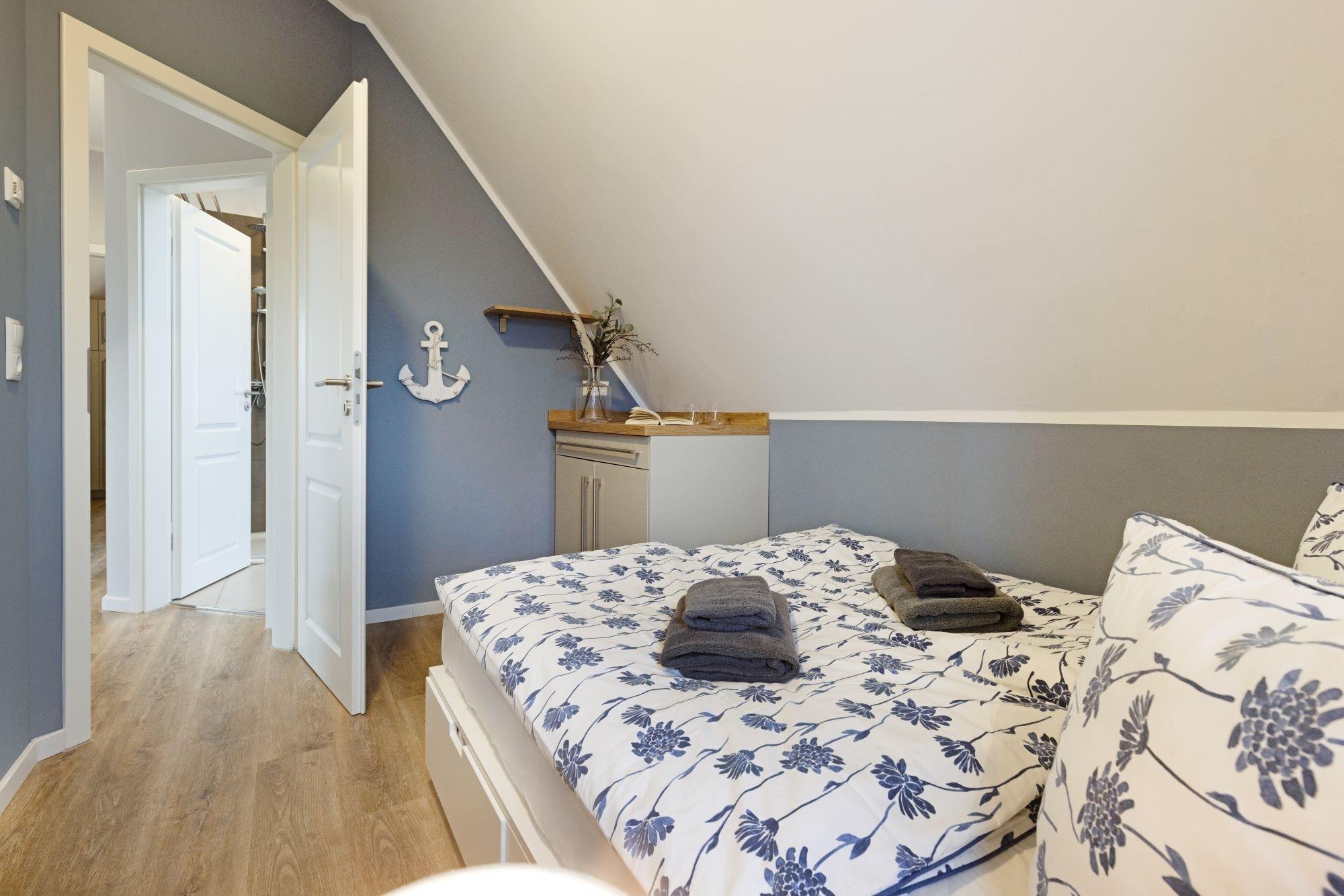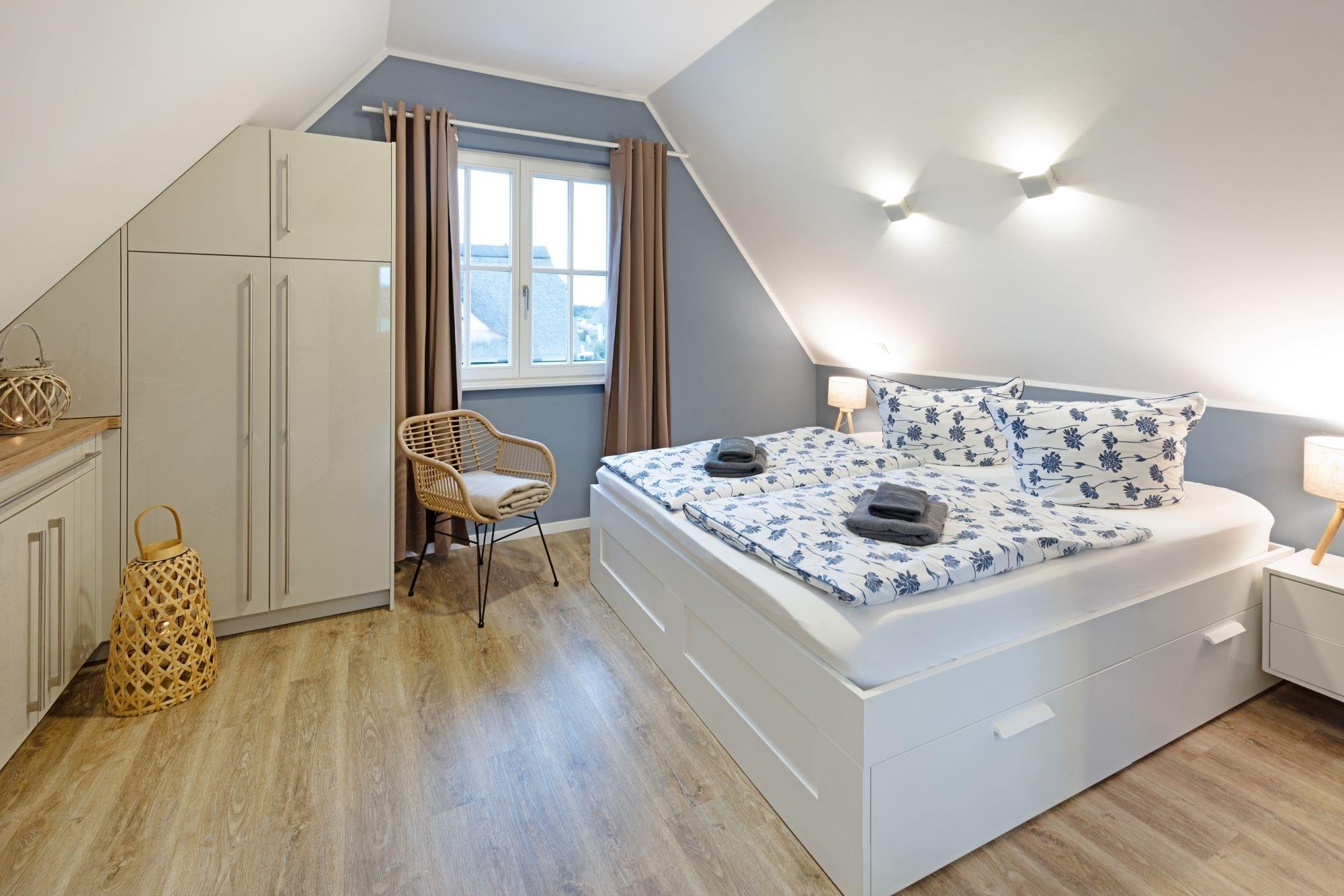Die Schlafzimmer sind mit je einem Doppelbett (davon ein ausziehbares Einzelbett max. 170x200) sowie ausreichend Stauraum in Form von maßgefertigten Kommoden und Einbauschränken ausgestattet.