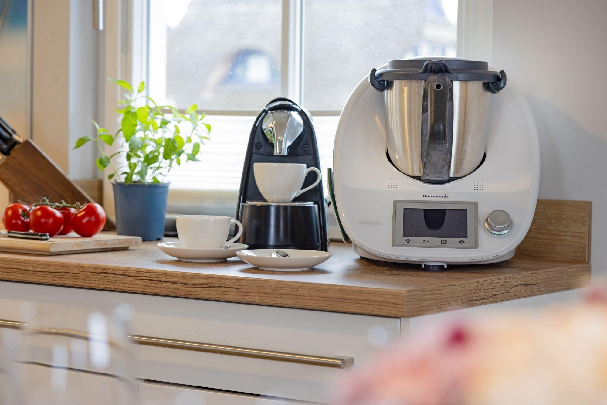 Insbesondere die Wohnküche ist mit hochwertigen Design-Markengeräten ausgestattet. Kleine Highlights sind z.B. der separate 60l-Gefrierschrank, die zusätzliche Mikrowelle, eine Nespresso-Kapselmachine als Ergänzung zur Filter-Kaffeemaschine sowie ein elektrischer Milchschaumbereiter.