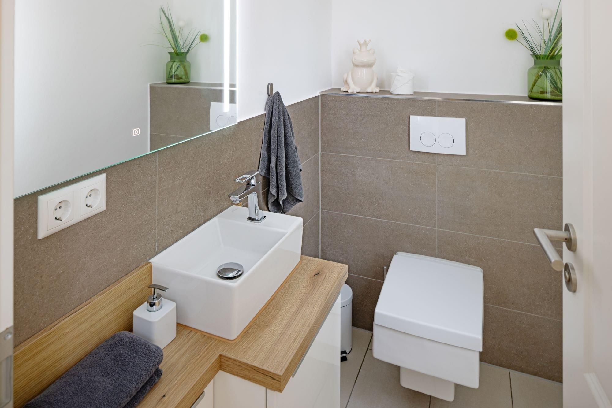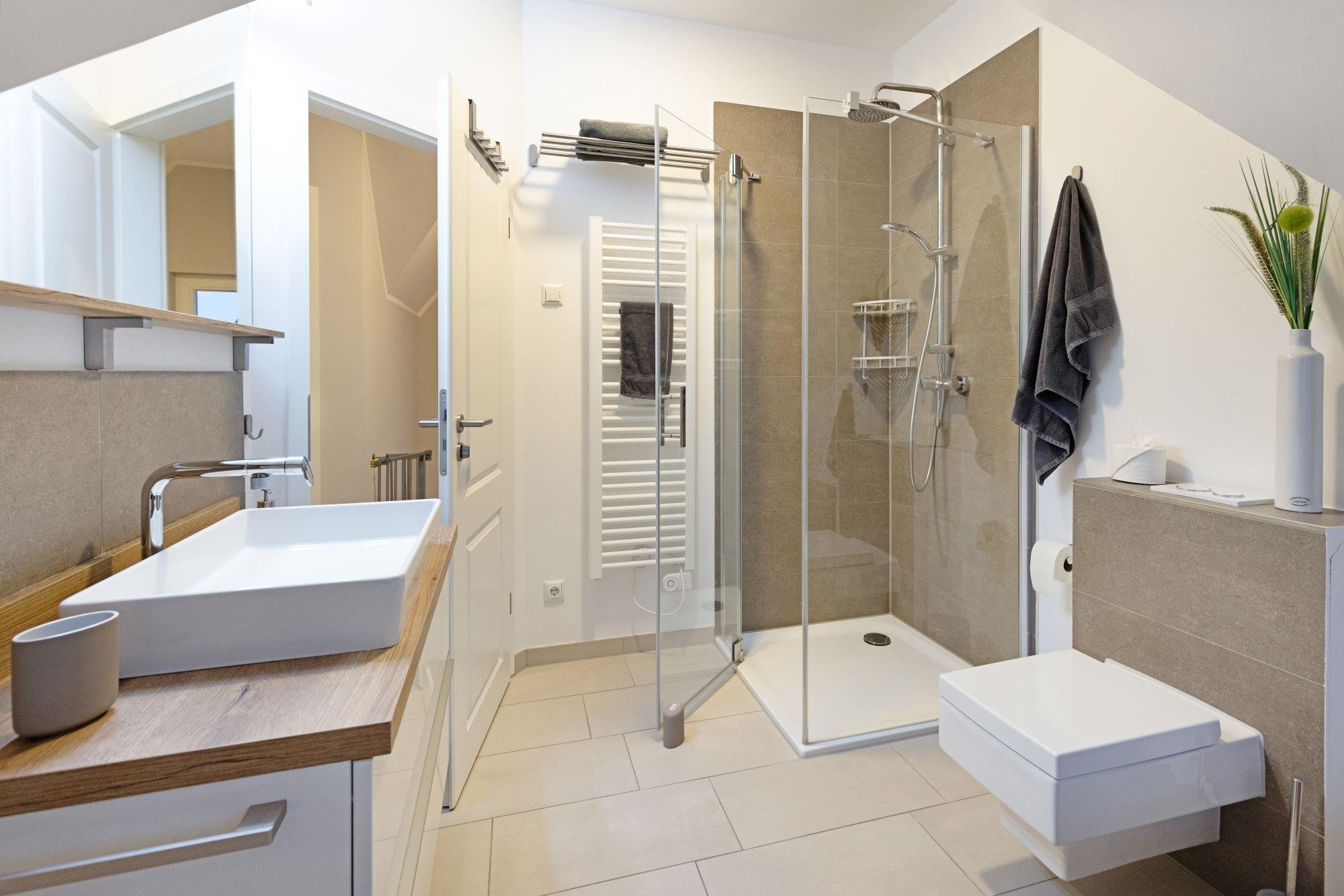Die bodengleiche Wellnessdusche ist im Saunabereich integriert. Ein Gäste-WC und der HWR mit Waschmaschine, Trockner und Haushaltsartikeln runden das Angebot im Erdgeschoss ab.