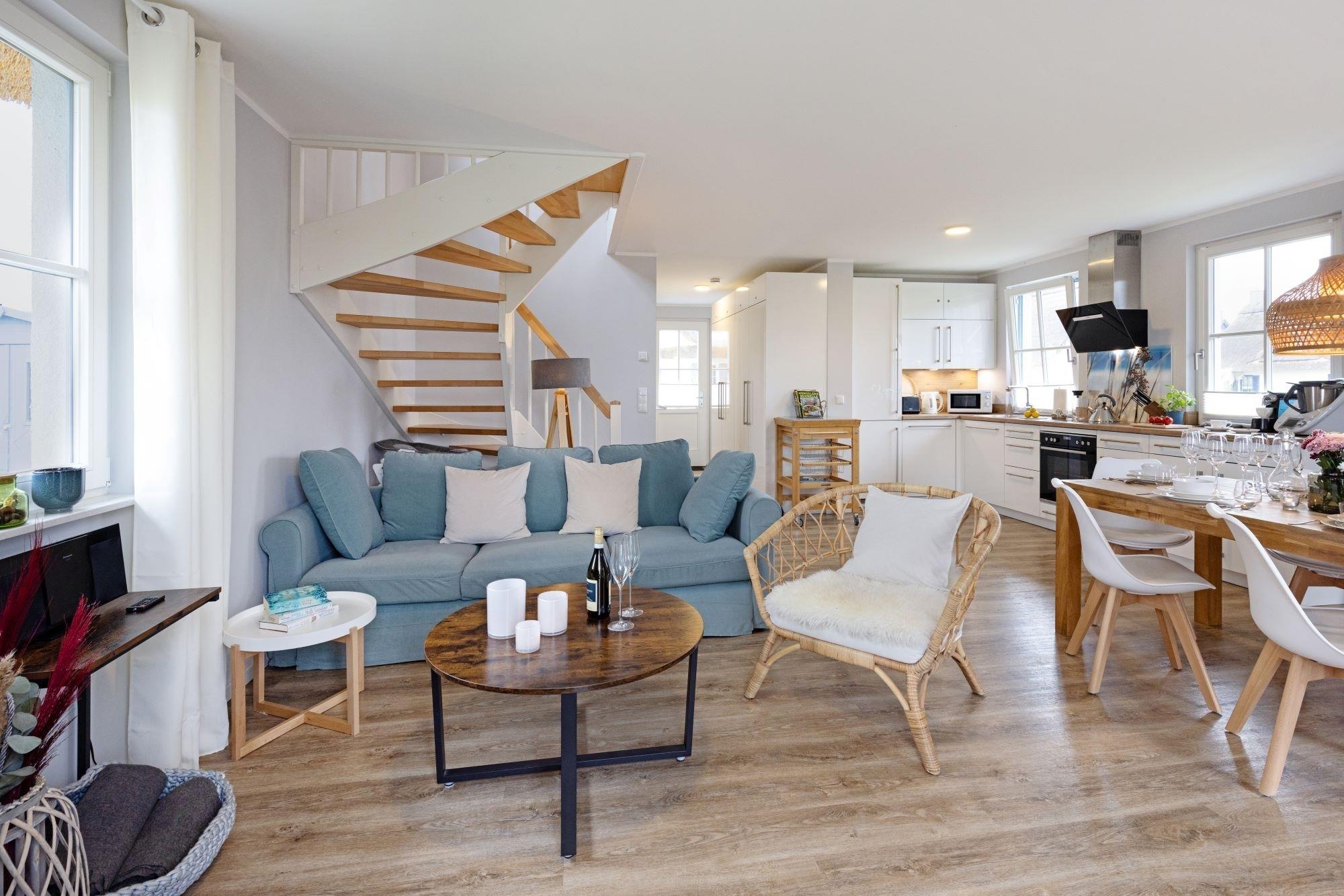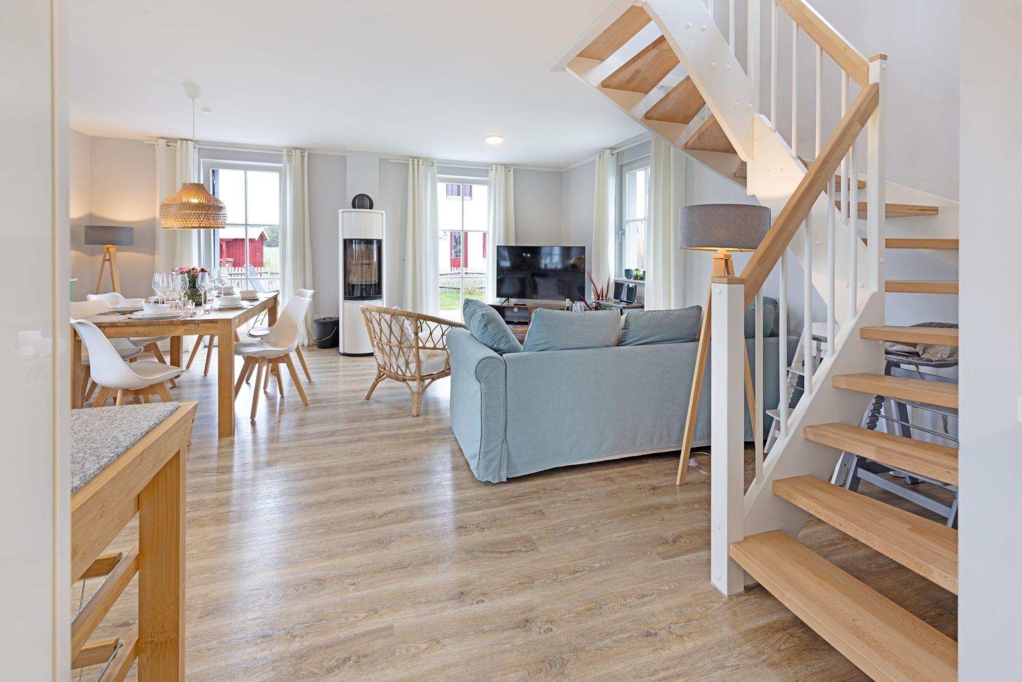 Der charmante Wohnbereich besticht durch das gemütliche Relax-Sofa und lädt zum entspannten Verweilen ein. Das hochwertige 55 Zoll-SAMSUNG-Smart-TV sorgt für Information und Unterhaltung. Genießen Sie unser kostenfreies WLAN-Internet und loggen Sie sich wie zu Hause jederzeit in Ihre bevorzugten Streamingportale von Prime, Sky, Netflix usw. ein. Für Regentage im geselligen Kreis von Freunden und Familie steht Ihnen eine Auswahl von Gesellschaftsspielen und Unterhaltungsliteratur zur Verfügung.