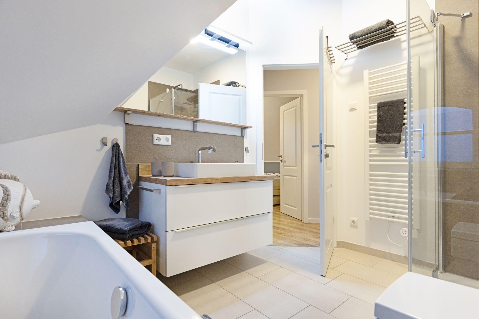 Im Obergeschoss befinden sich die 3 Schlafzimmer und das moderne Vollbad mit Fledermausgaube, Komfort-Badewanne und bodengleicher Dusche.
