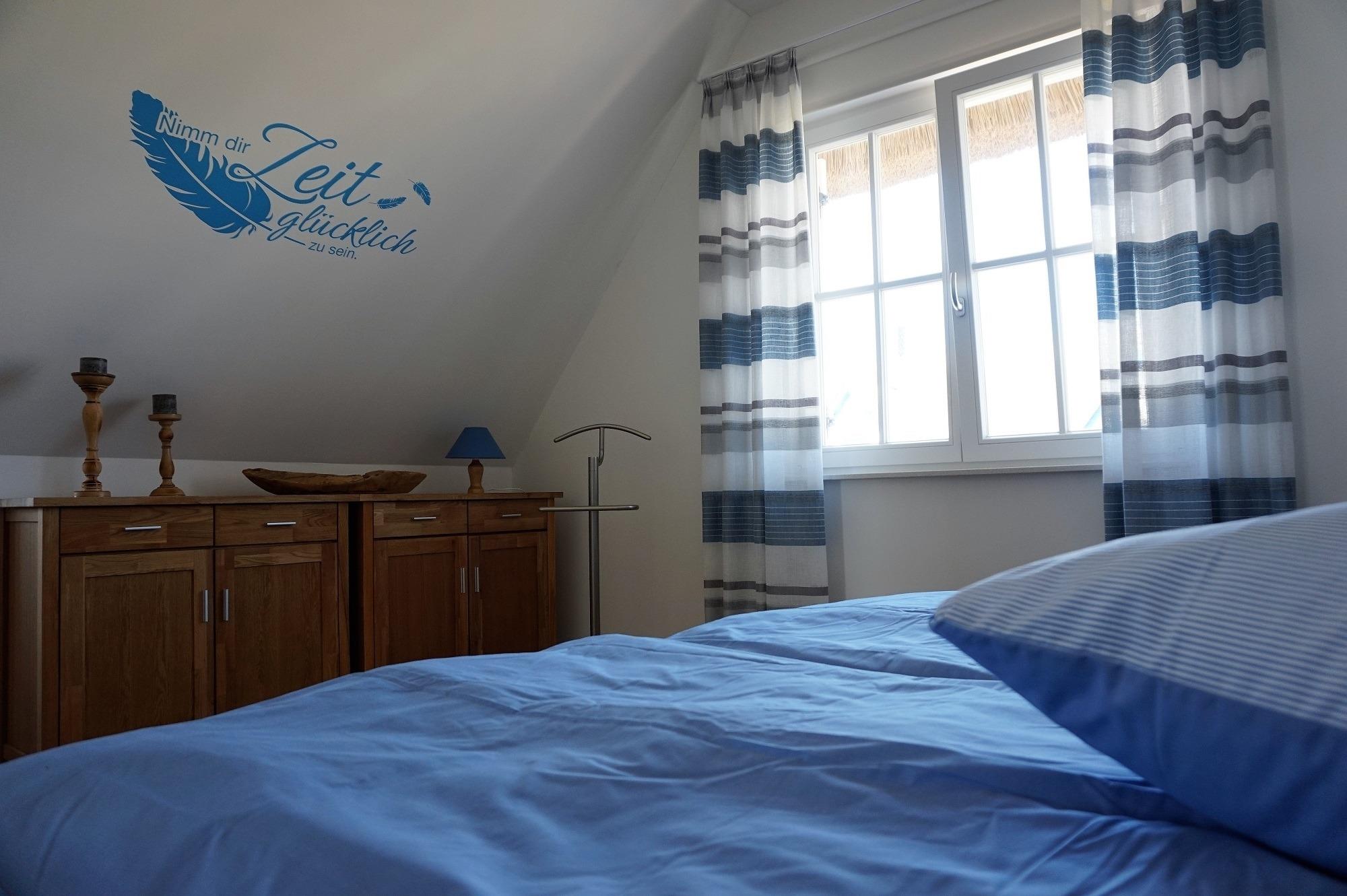 Desweiteren befindet sich im Erdgeschoss die Sauna mit Wellness-Dusche und WC. Im Obergeschoss sind zwei Schlafzimmer eingerichtet. Das Elternschlafzimmer mit Echtholzmöbeln ist mit einem Doppelbett und Kommoden ausgestattet. In den Schlafzimmern sind Fliegenschutzgitter angebracht. Zur Verdunkelung und Sichtschutz dienen die Fensterklappläden und Gardinen. Im 2 Schlafzimmer befindet sich ein weiteres Doppelbett, ein Kleiderschrank, 2. TV sowie Sitzsack und ein Zustellbett für die 5. Person eingerichtet. Das Vollbad im Obergeschoss bietet einen wunderbaren Start in den Tag. Es ist mit einer Badewanne, Echtglasdusche, Waschbecken und WC sowie Spiegelschrank hochwertig ausgestattet. Das Reethaus ist ideal für Ihren Familienurlaub an der Ostseeküste. Am Haus sind zwei Stellplätze. Im Abstellschuppen befinden sich 2 Fahrräder. Diese können auf auf eigene Gefahr genutzt werden. Zum Strand sind es ca. 600 m.