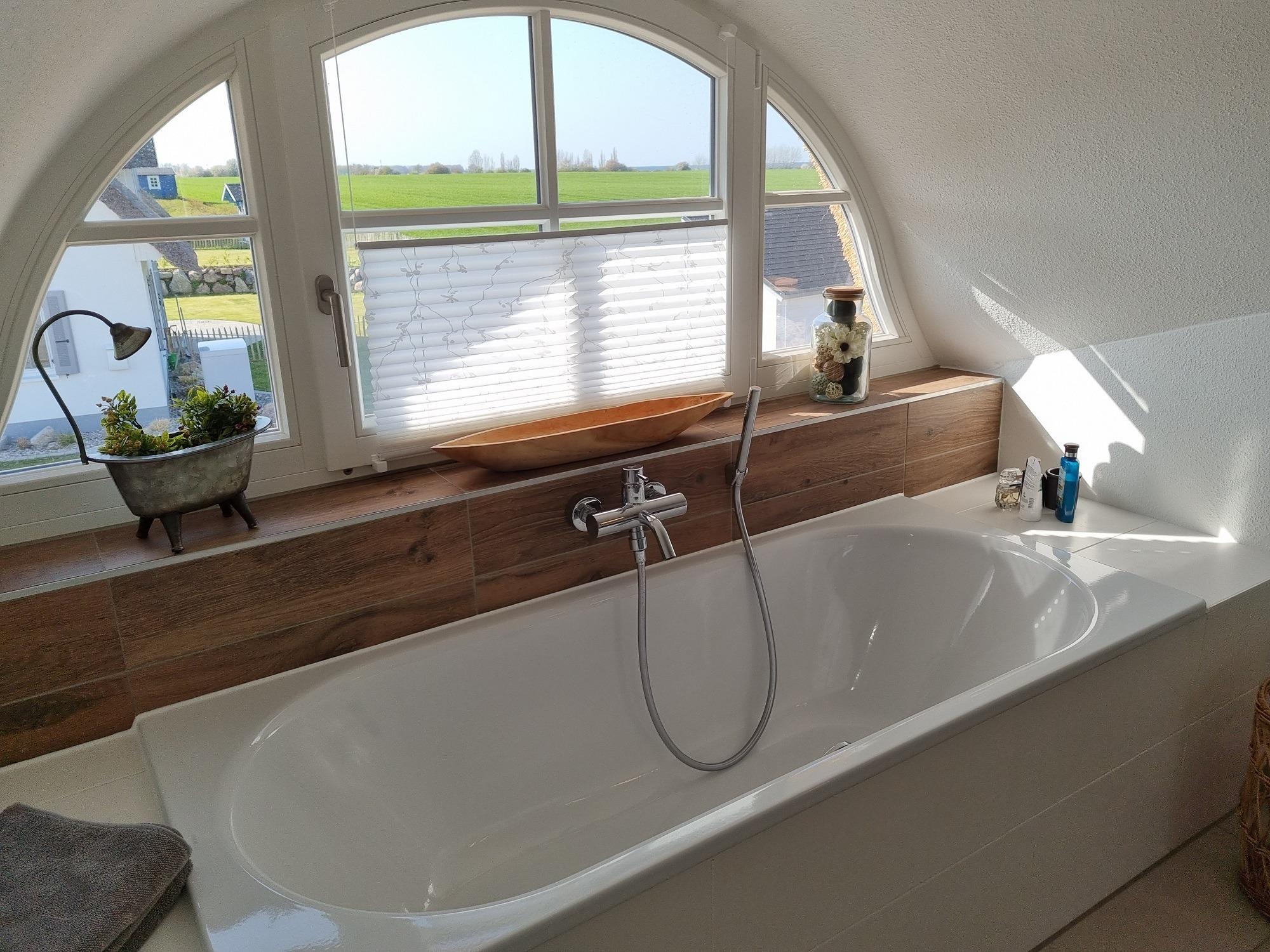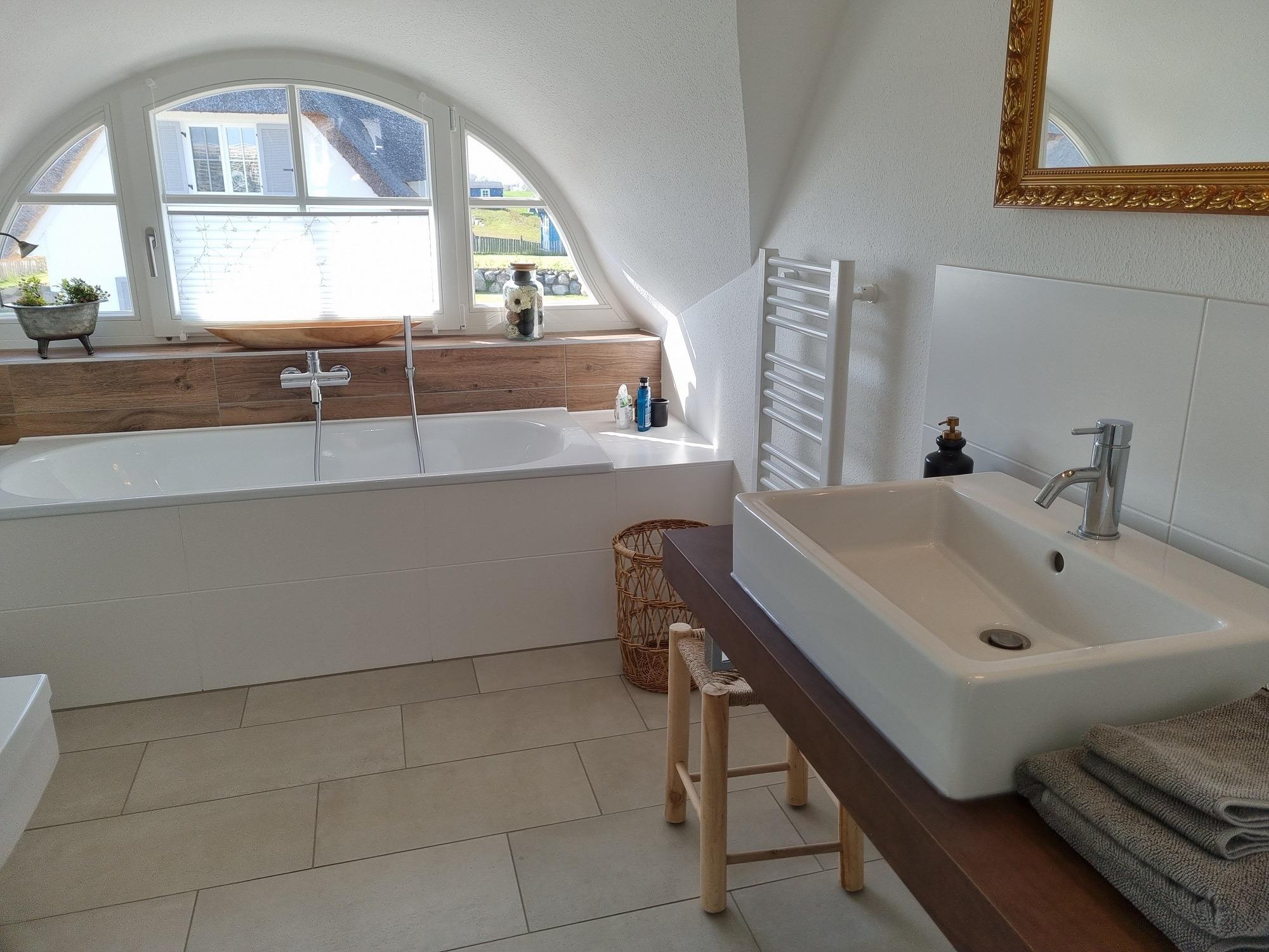 Das helle und moderne Vollbad mit Badewanne und Dusche befindet sich zwischen den beiden Schlafzimmern.