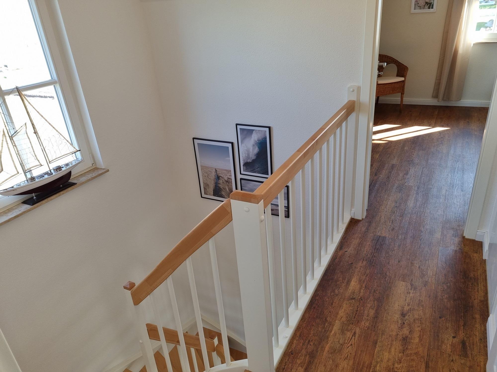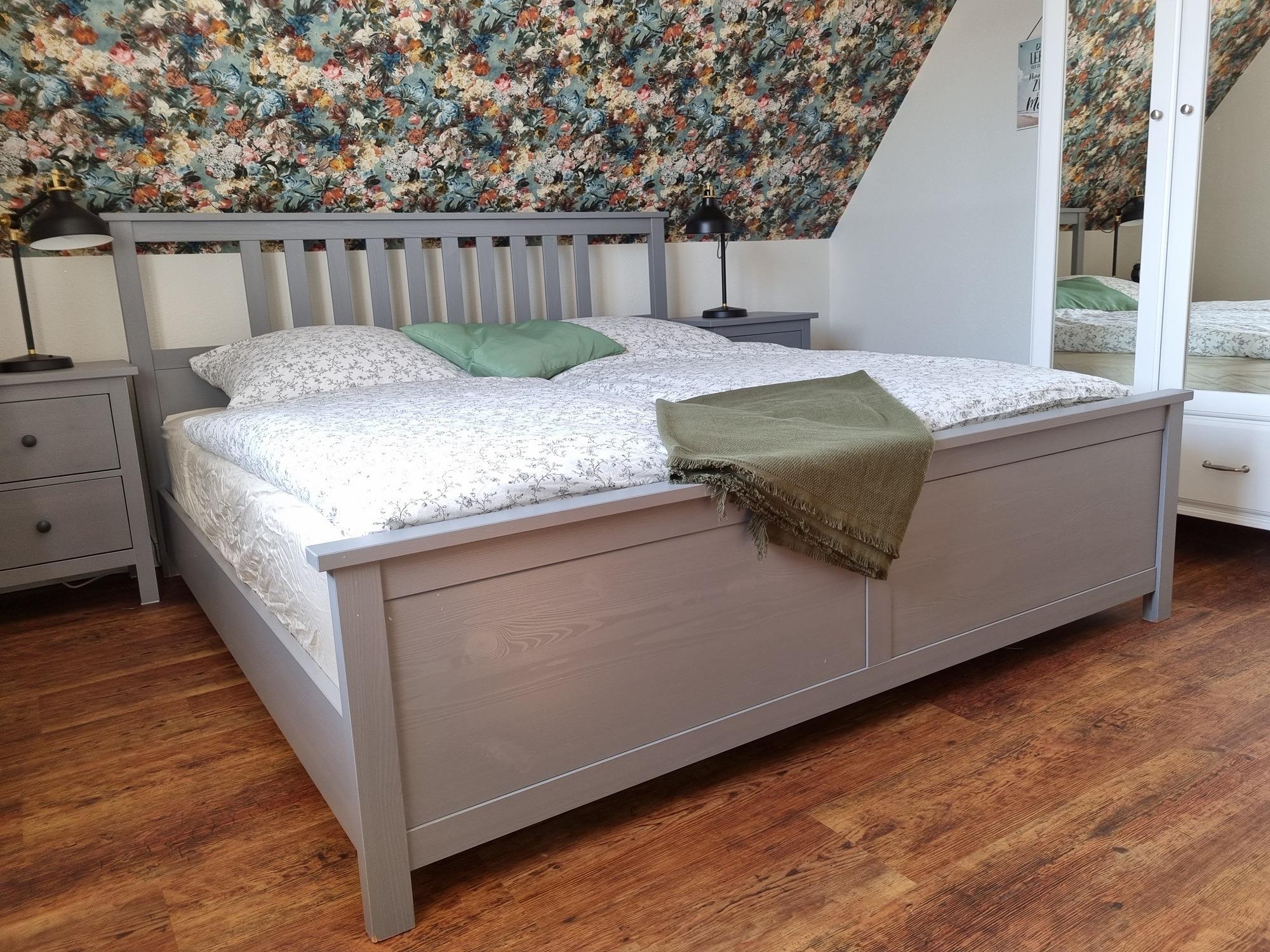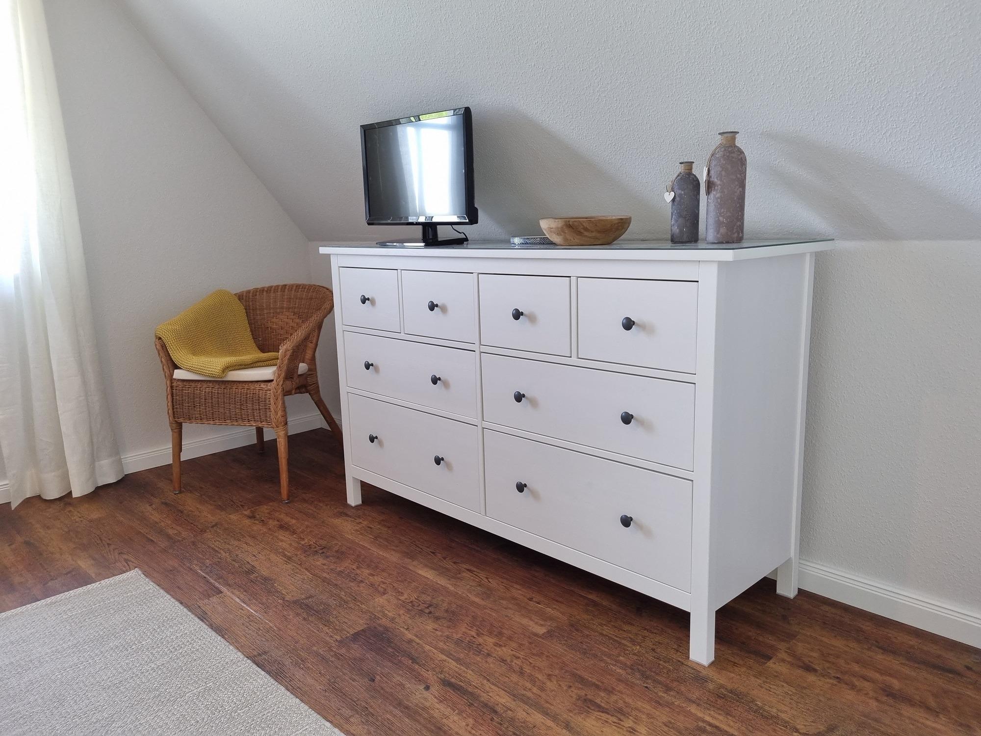 Im Obergeschoss gibt es zwei weitere Schlafzimmer, die jeweils mit einem Doppelbett, ausreichend Stauraum und einem Fernseher ausgestattet sind. Das Schlafzimmer auf der rechten Seite bietet einen traumhaften Blick auf die Ostsee. Bettwäsche und Handtücher sind bereits im Preis inbegriffen, sodass Sie sich um diese Dinge nicht kümmern müssen. Für kleine Kinder steht ein Reisebett und ein Hochstuhl zur Verfügung.