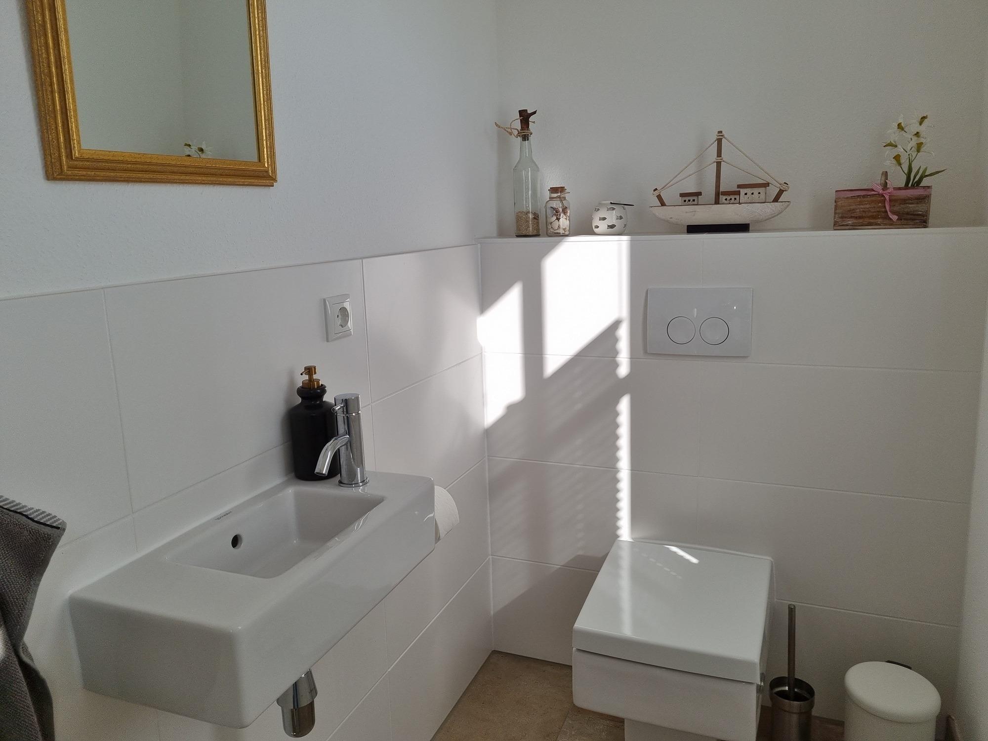 Im Erdgeschoss befinden sich außerdem ein Gäste-WC und ein Hauswirtschaftsraum mit Waschmaschine, Trockner und Mikrowelle.