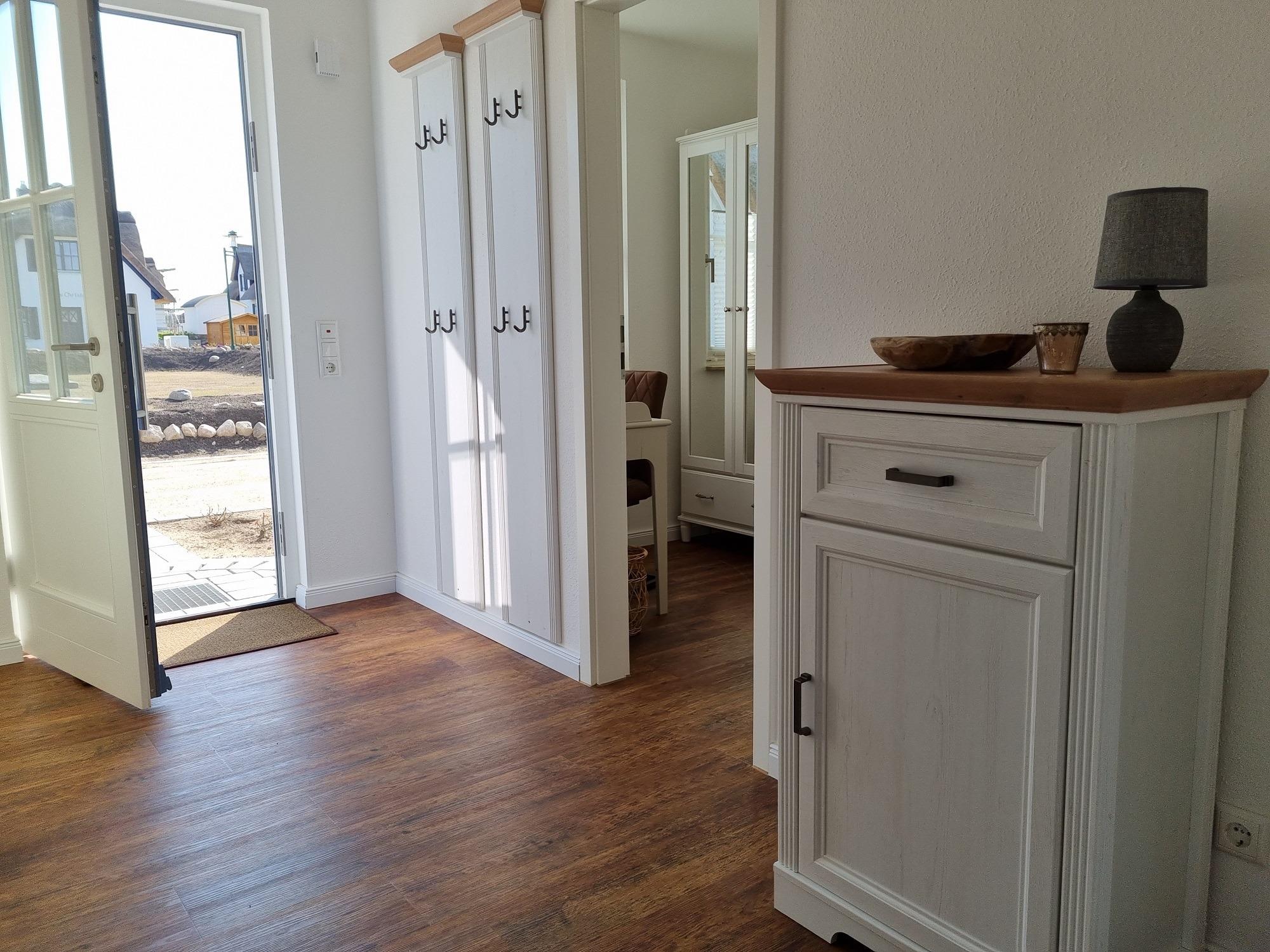 Das Haus ist im gemütlichen Landhausstil eingerichtet. Im Erdgeschoss befindet sich ein kleineres Gästezimmer mit einem Etagenbett, Schreibtisch und Kleiderschrank. Der große Wohnbereich mit Kamin bietet einen schönen Ausblick auf Felder und Wiesen und lädt zu entspannten Stunden im Urlaub ein. Für Mahlzeiten steht ein großer Esstisch zur Verfügung, an dem bis zu 6 Personen Platz finden. Die offene Küchenzeile ist modern ausgestattet und bietet viele Extras.