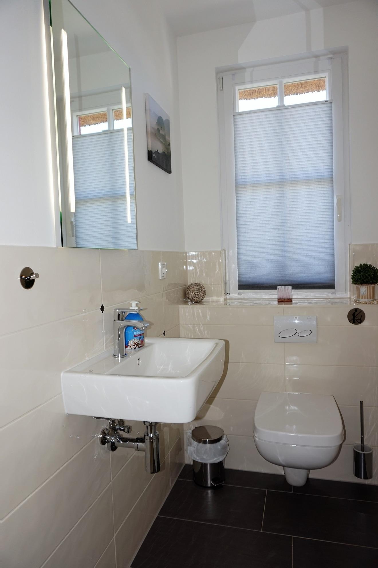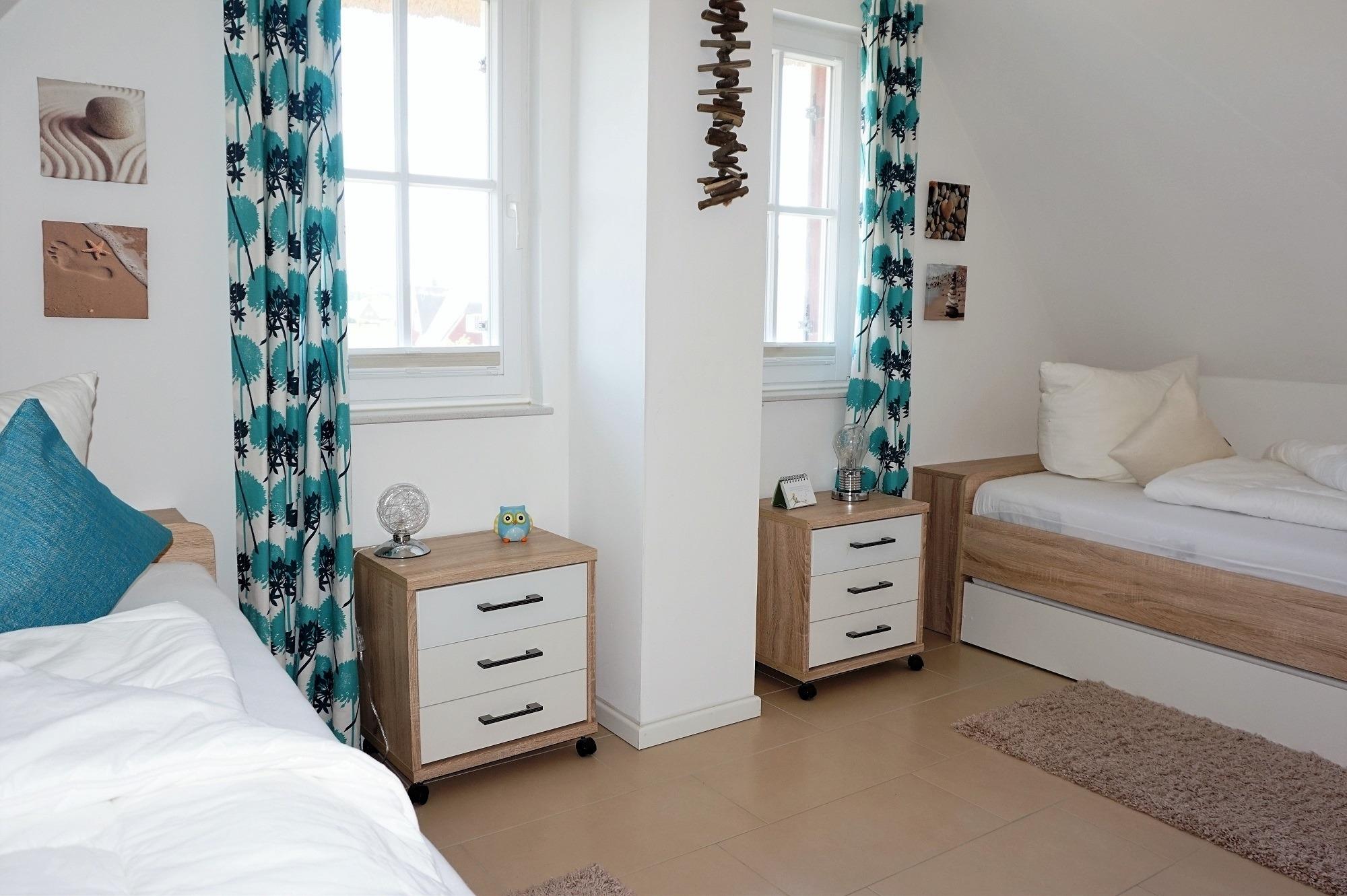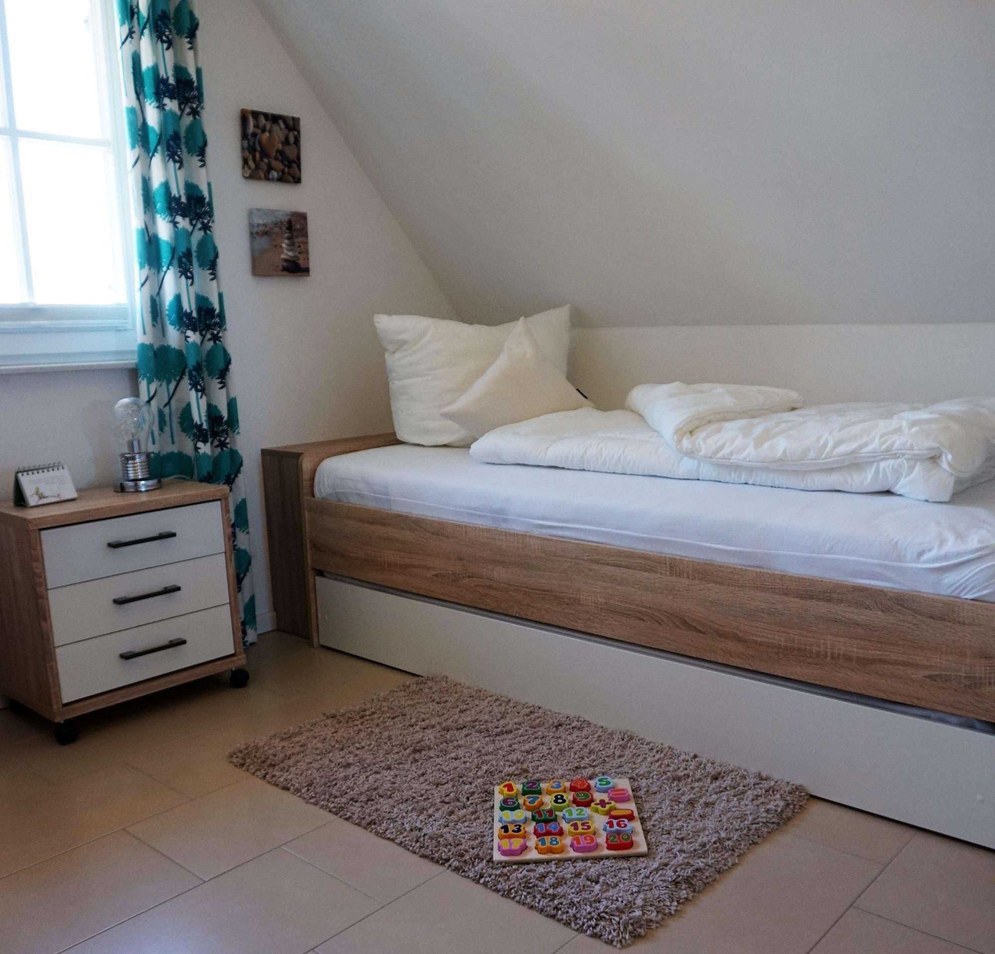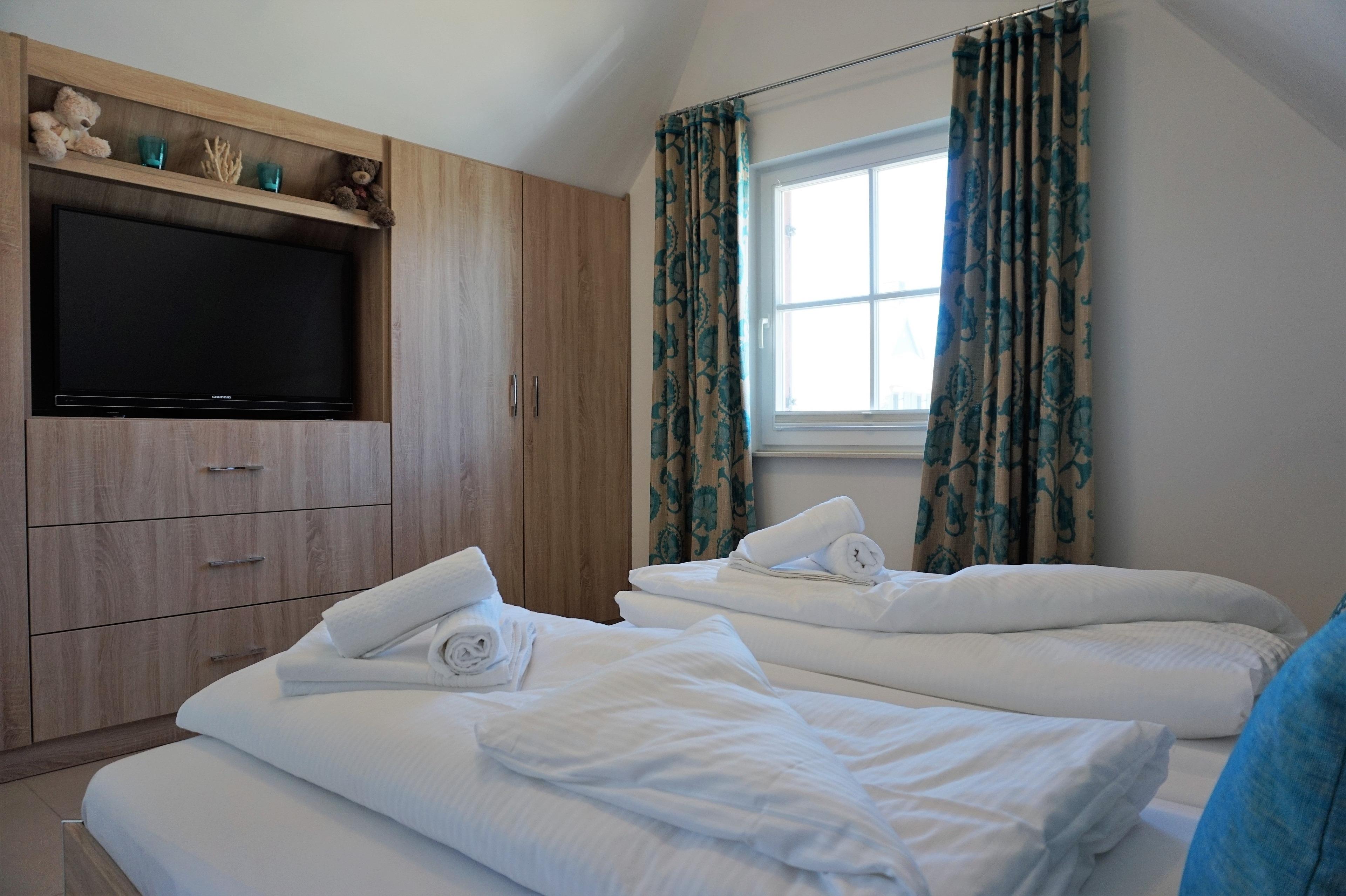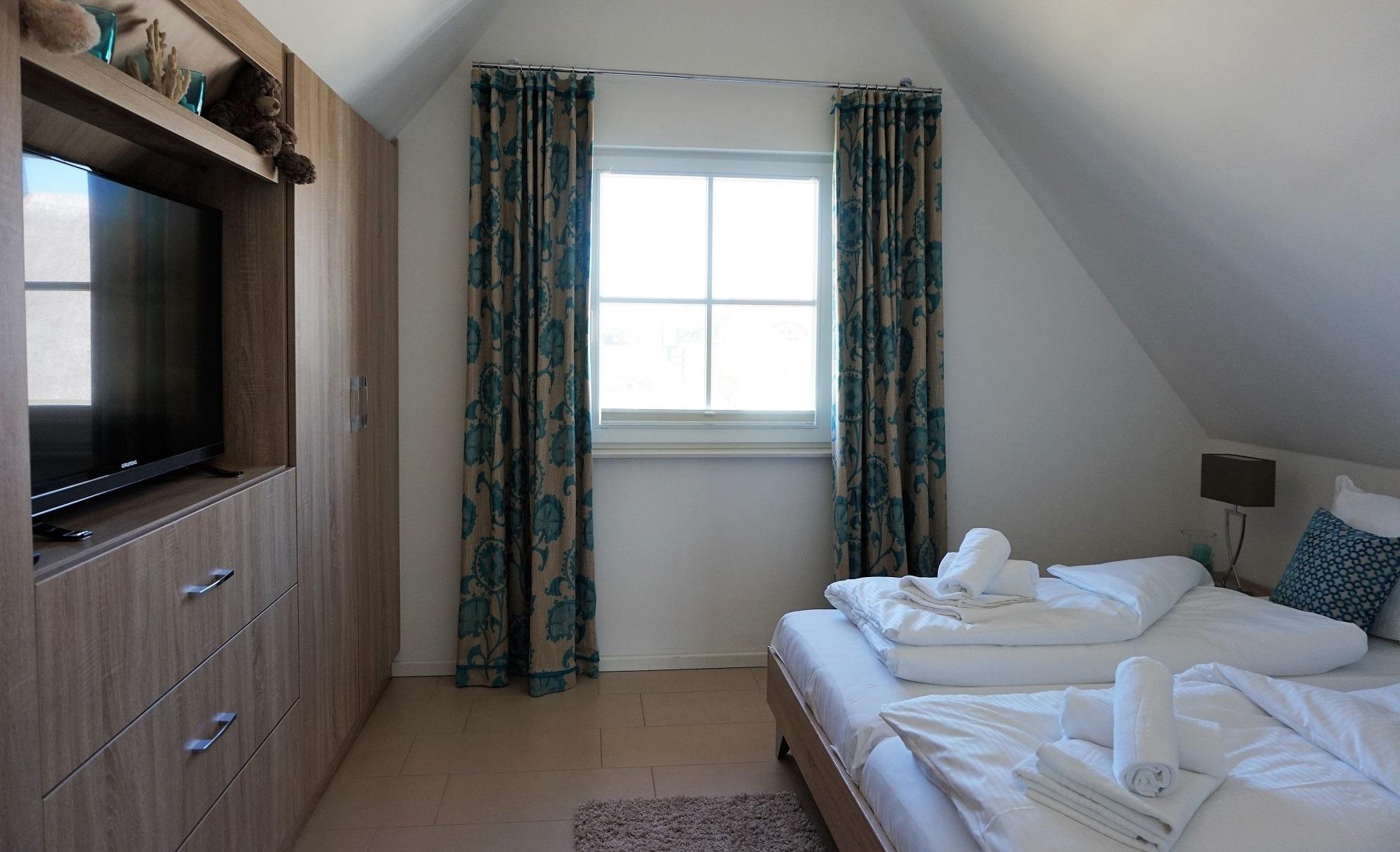 Für den Hund steht ein Lederkorb und Hundenäpfe unter der Treppe. Bitte lassen Sie den Vierbeiner im Erdgeschoss! Ein Gäste-WC mit Tageslicht befindet sich zudem im Erdgeschoss. Zwei separate Schlafzimmer sowie ein hochwertiges Vollbad sind im Obergeschoss vorhanden. Im Elternschlafzimmer befinden sich ein großer eingebauter Kleiderschrank mit 2. TV und Doppelbett. Von hier aus haben Sie einen wunderbaren Blick auf die Ostsee. Im Kinderschlafzimmer sind drei Einzelbetten nutzbar. Ein Kinderreisebett steht bereit. Ihr Urlaub kann direkt beginnen - die Bettwäsche ist bei Anreise bereits bezogen und Handtücher liegen bereit. Im Haus sind Fliegenschutzgitter und Gardinen bzw. Pliesses als Sichtschutz angebracht. Im Hauswirtschaftsraum stehen eine Wasch- Trocknerkombi und ein Bügelbrett/Bügeleisen sowie Putzutensilien bereit. Ein Safe für Ihre Wertsachen ist vorhanden. Vor dem Ferienhaus können Sie zwei PKW`s abstellen. Ab Januar 2026 steht eine Wallbox zur Verfügung. Abrechnung erfolgt nach Verbrauch.
