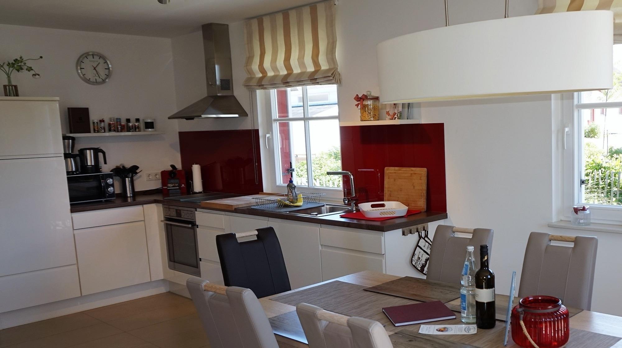 Das Ferienhaus ist eingezäunt und der große sonnige Garten lädt zu gemütlichen Stunden am Haus ein. Genießen Sie Ihren Urlaub in den zwei Strandkörben oder auf der Sonnenliege. Die Gartenmöbel auf der überdachten Terrasse bieten eine schöne Sitzgelegenheit z. B. für ein Frühstück am Morgen. Als kleines Highlight steht eine kleine Zapfanlage im HWR. Lassen Sie den Urlaubstag mit einem frisch gezapften Bier und leckeren Speisen vom Grill ausklingen. Die Terrasse ist mit Sichtschutz abgegrenzt und ein feststehender Grill sowie Abstellschuppen für mitgebrachte Fahrräder stehen bereit. Kleine Strandpiraten können kostenfrei den hauseigenen Bollerwagen nutzen. Im Haus erwartet Sie eine exklusive Ausstattung. Der sehr großzügig und hell gestaltete Wohnraum erstreckt sich über zwei Ebenen auf ca. 97m² und bietet Platz für bis zu 5 Personen. Die moderne Ausstattung des Hauses wird Sie begeistern. Der Essbereich im Wohnzimmer bietet bis zu 5 Personen viel Platz zum Speisen und spielen. Ein Kinderhochstuhl steht für kleine Gäste bereit. Die Küchenzeile ist sehr gut mit Geschirrspüler, Kühlschrank, Herd, Mikrowelle, Nespressomaschine, Waffeleisen und Mixer ausgestattet und besticht durch die Hochglanzoptik. Der Kaminofen bringt an kühleren Tagen wohlige Wärme ins Haus. Nach einem langen Strandspaziergang können Sie in der Sauna mit Dusche entspannen. Auf den beiden Sofas können Sie es sich mit einem Buch oder vor dem schwenkbaren TV gemütlich machen. Viele Bücher, Spiele, Umgebungs- und Radkarten, DVD`s und etwas Kinderspielzeug stehen Ihnen für einen unbeschwerten Urlaub zur Verfügung.