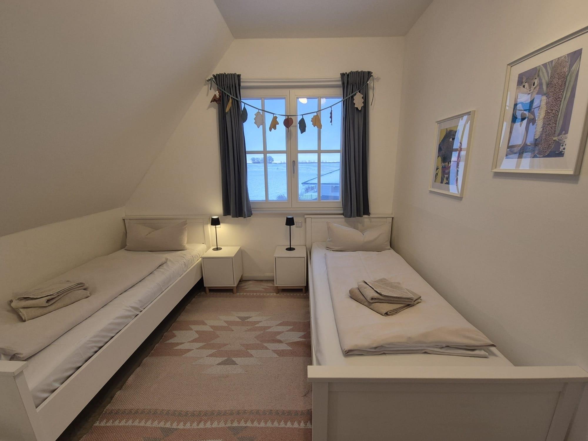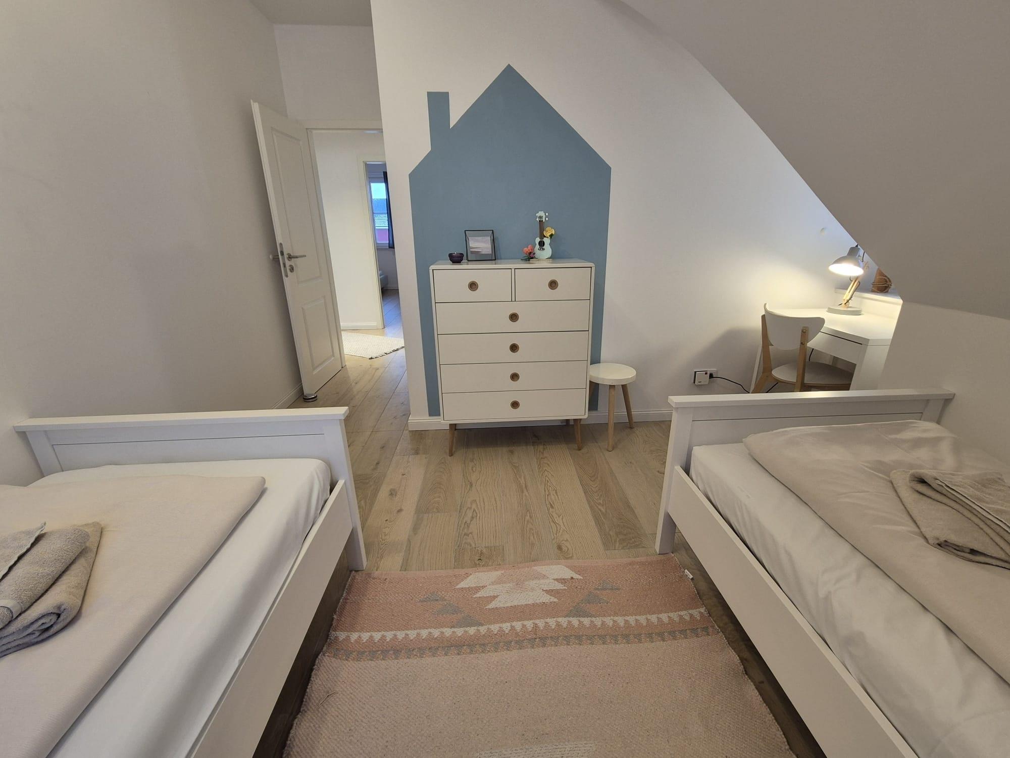 Das dritte Schlafzimmer mit zwei Einzelbetten, Schreibtisch und Seeblick ist perfekt auf kleine Gäste abgestimmt.