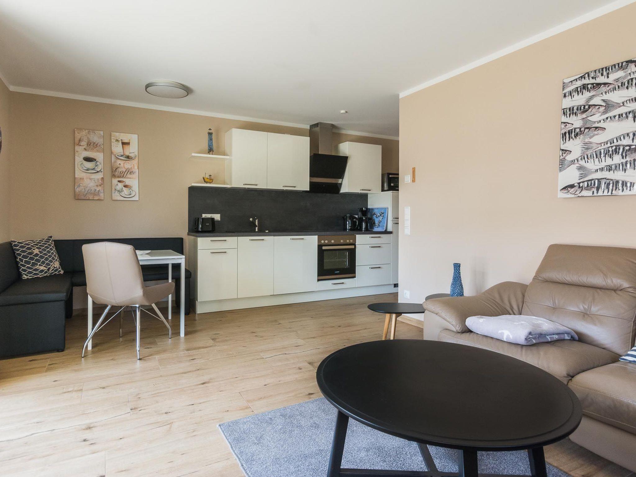 Das Appartement verfügt über einen lichtdurchfluteten Wohnbereich mit einer offenen Küche und gemütlichem Essbereich. Die Küche ist voll ausgestattet.