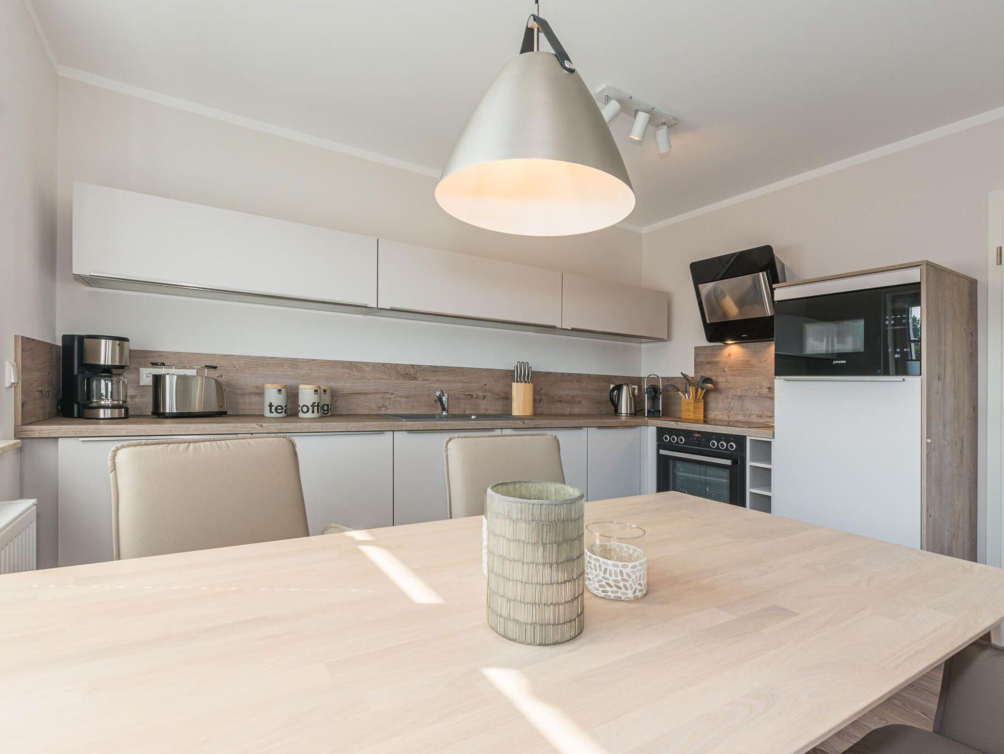 Im Friesländer finden Sie eine offene Küche, komplett ausgestattet mit allen Koch- und Verbrauchsutensilien. Geräte wie Geschirrspüler, Mikrowelle und Kühlschrank mit Gefrierfach gehören ebenfalls zur Ausstattung. Der Esstisch oder auch das bequeme Ecksofa laden zum geselligen Beisammensitzen ein. Draußen Frühstücken oder am Abend noch die frische Seeluft etwas genießen ? der Balkon, mit Blick ins Grüne und am Horizont der Bodden lädt zum Verweilen ein. Mit etwas Glück sehen Sie im Herbst auch den abendlichen Kranicheinflug vom Balkon. Hören können Sie diesen auf jeden Fall.