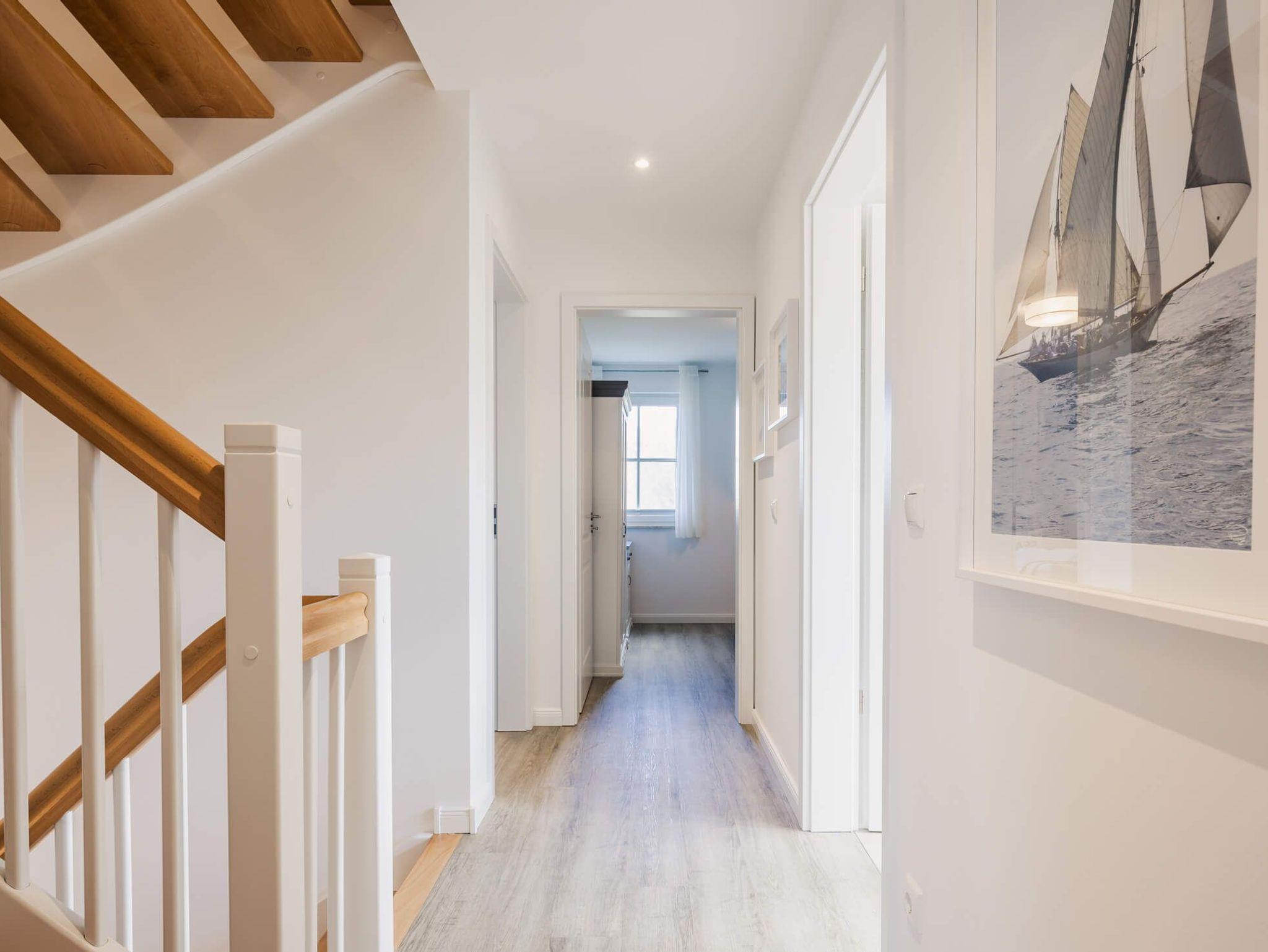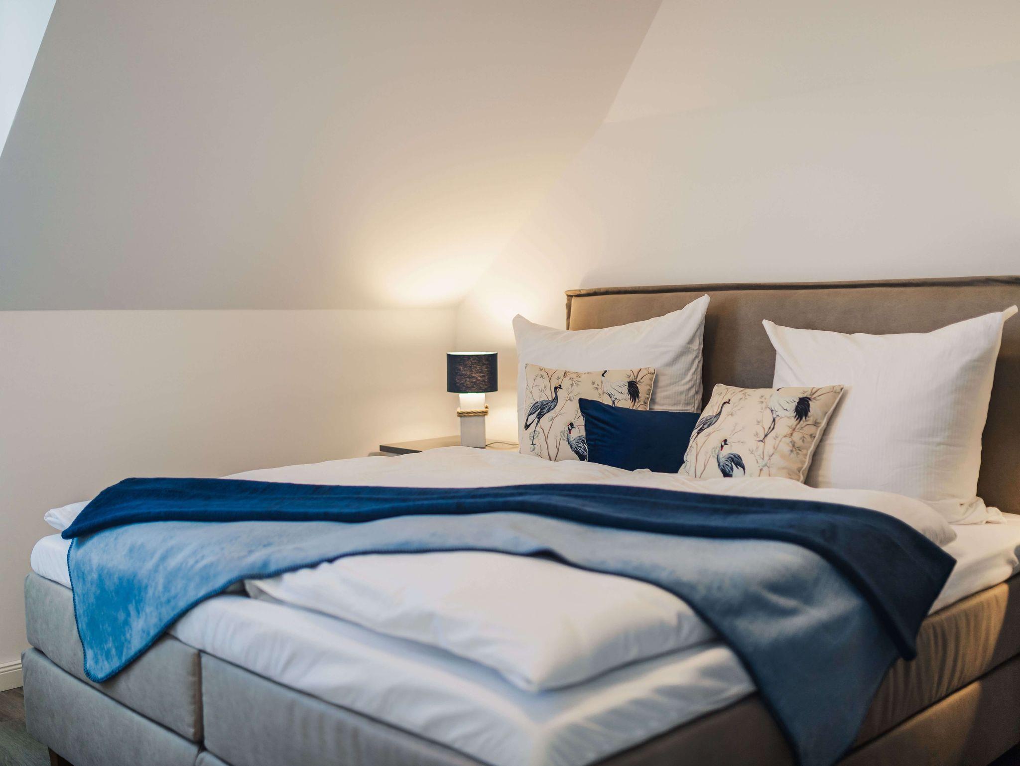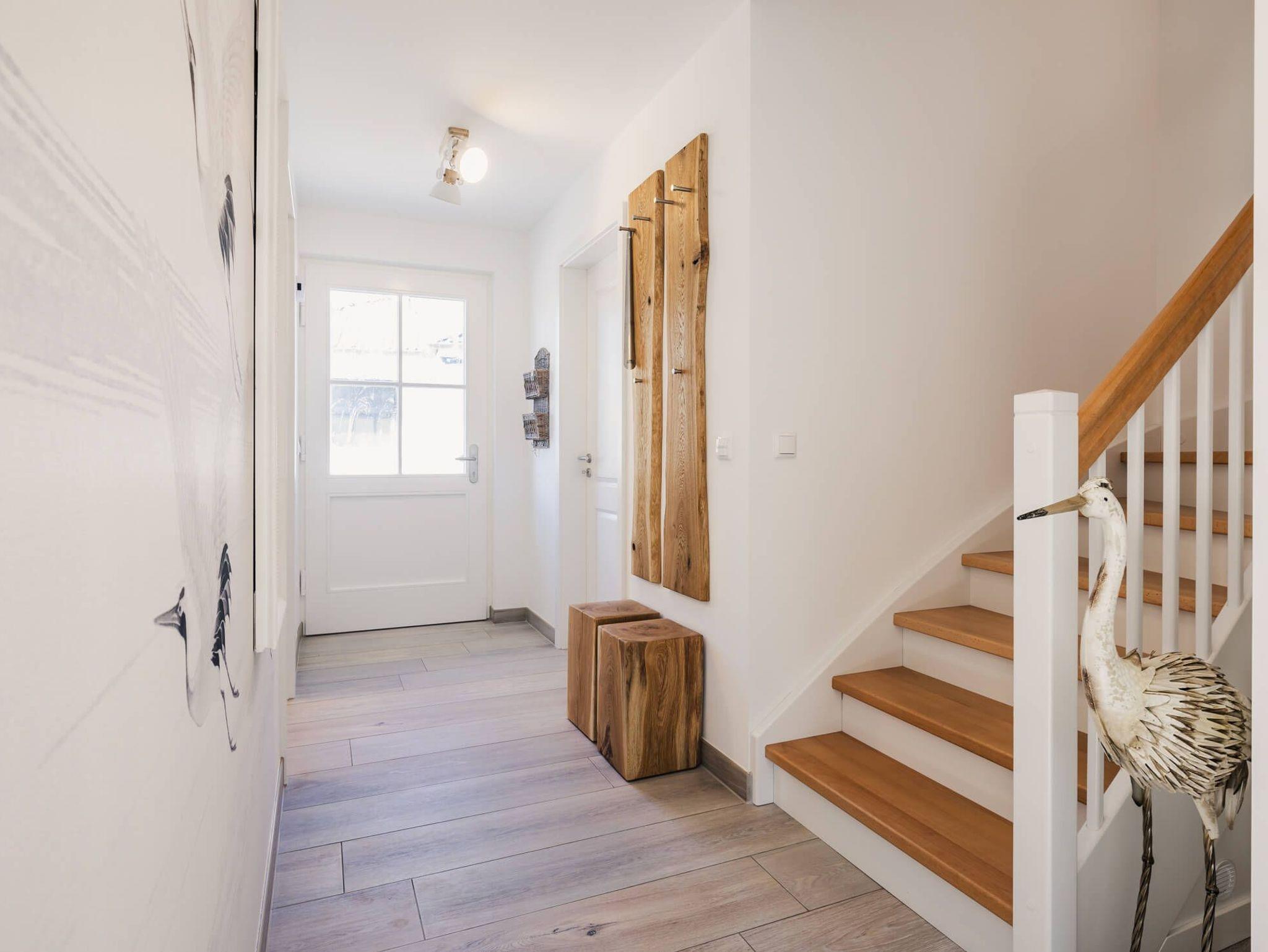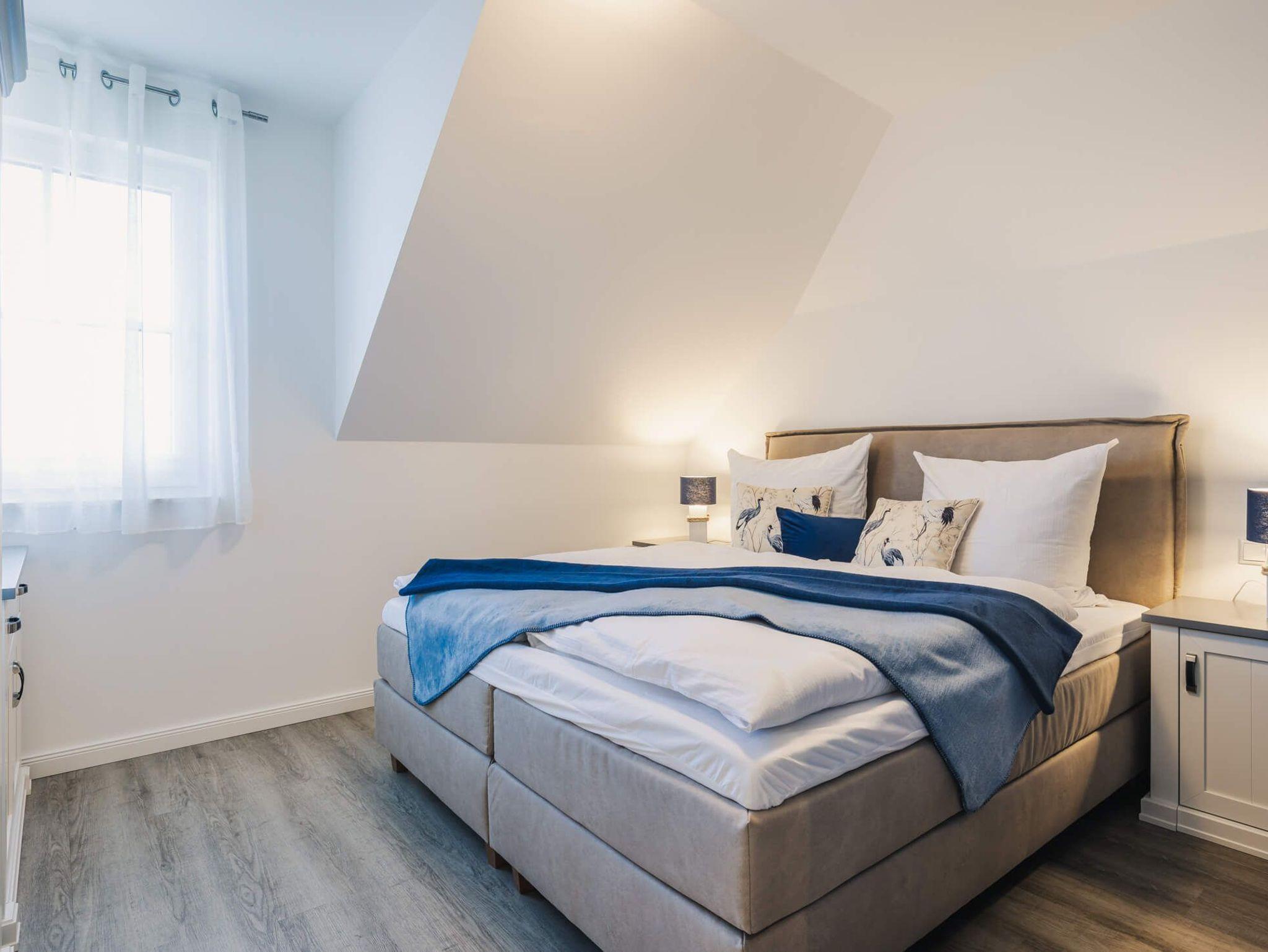 Auf 105 Quadratmetern Wohnfläche bietet Ihnen das Ferienhaus Kranichkieker Platz für 7 Personen. Es verfügt über 4 Schlafzimmer und 2 Bäder. Ein Bad im Erdgeschoss mit ebenerdiger Dusche und Sauna und ein Bad im Obergeschoss mit Badewanne und bodengleicher Dusche sorgen für Komfort und Entspannung. Die Schlafzimmer im Obergeschoss sind komfortabel mit Boxspringbetten und Flatscreen-TV ausgestattet. Das Schlafzimmer im Dachgeschoss beinhaltet zwei Einzelbetten und einen Flatscreen-TV. Der offene Wohn-Ess-Bereich mit voll ausgestatteter Küche bietet ausreichend Platz für gemeinsame Mahlzeiten und gesellige Abende. Die Terrasse mit angrenzendem Rasen lädt zum Sonnenbaden, Grillen und Entspannen im Freien ein. In dem abschließbaren Fahrradschuppen können Sie Ihre Fahrräder sicher abstellen. Zwei PKW-Stellplätze stehen Ihnen direkt am Haus zur Verfügung.