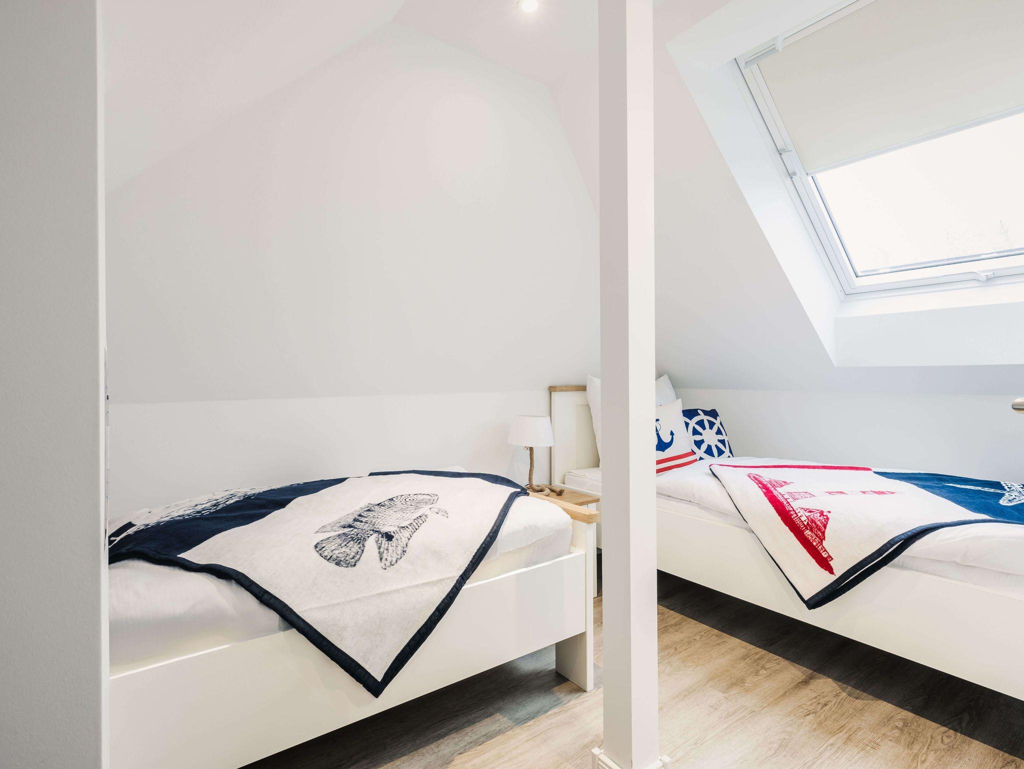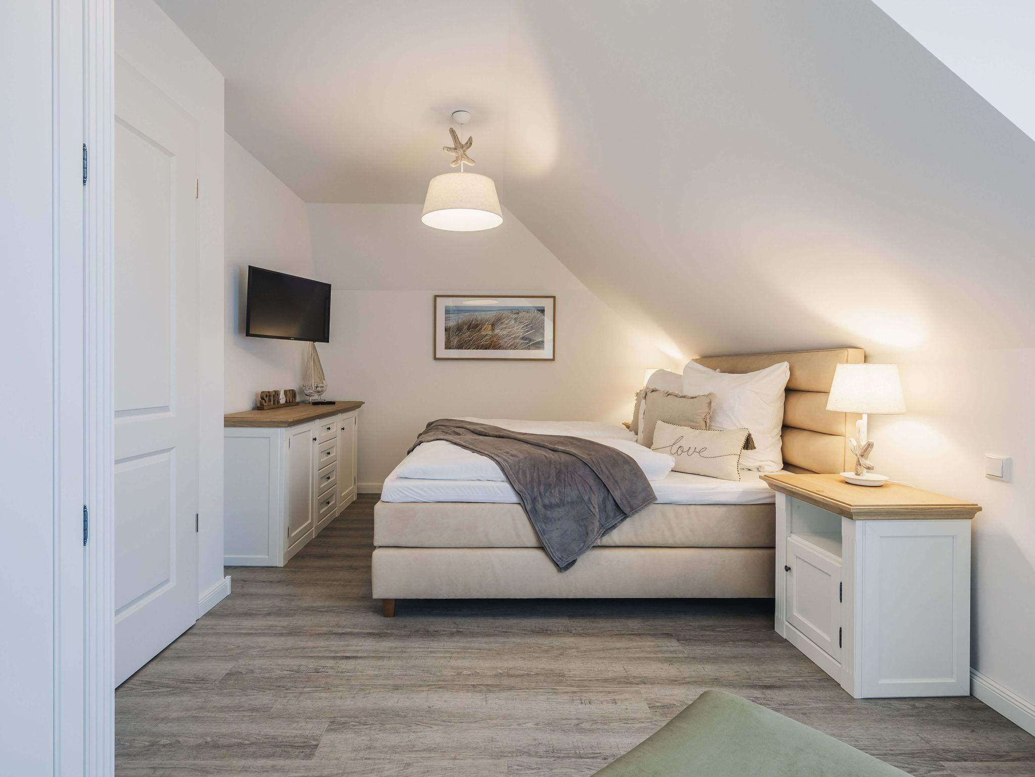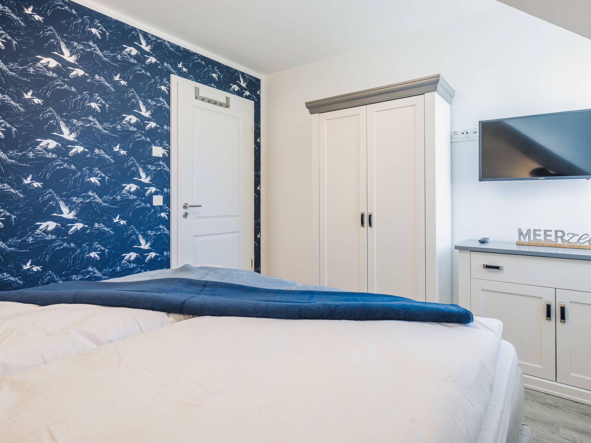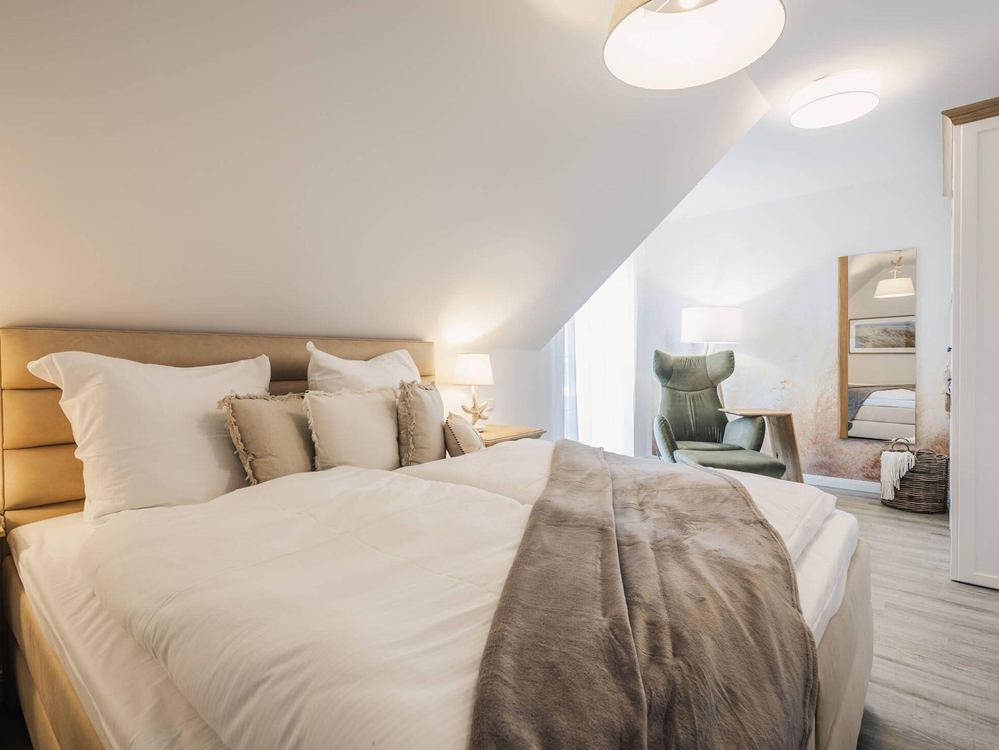 Auf 105 Quadratmetern Wohnfläche bietet Ihnen das Ferienhaus Kranichkieker Platz für 7 Personen. Es verfügt über 4 Schlafzimmer und 2 Bäder. Ein Bad im Erdgeschoss mit ebenerdiger Dusche und Sauna und ein Bad im Obergeschoss mit Badewanne und bodengleicher Dusche sorgen für Komfort und Entspannung. Die Schlafzimmer im Obergeschoss sind komfortabel mit Boxspringbetten und Flatscreen-TV ausgestattet. Das Schlafzimmer im Dachgeschoss beinhaltet zwei Einzelbetten und einen Flatscreen-TV. Der offene Wohn-Ess-Bereich mit voll ausgestatteter Küche bietet ausreichend Platz für gemeinsame Mahlzeiten und gesellige Abende. Die Terrasse mit angrenzendem Rasen lädt zum Sonnenbaden, Grillen und Entspannen im Freien ein. In dem abschließbaren Fahrradschuppen können Sie Ihre Fahrräder sicher abstellen. Zwei PKW-Stellplätze stehen Ihnen direkt am Haus zur Verfügung.