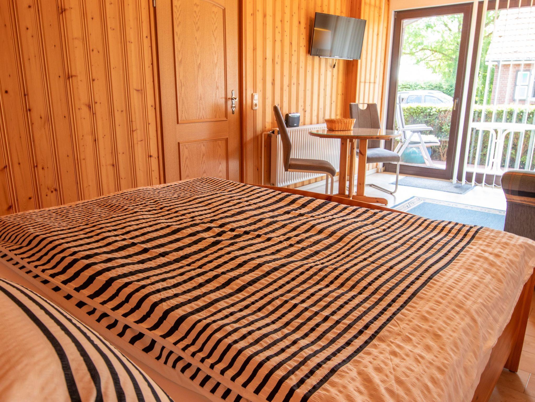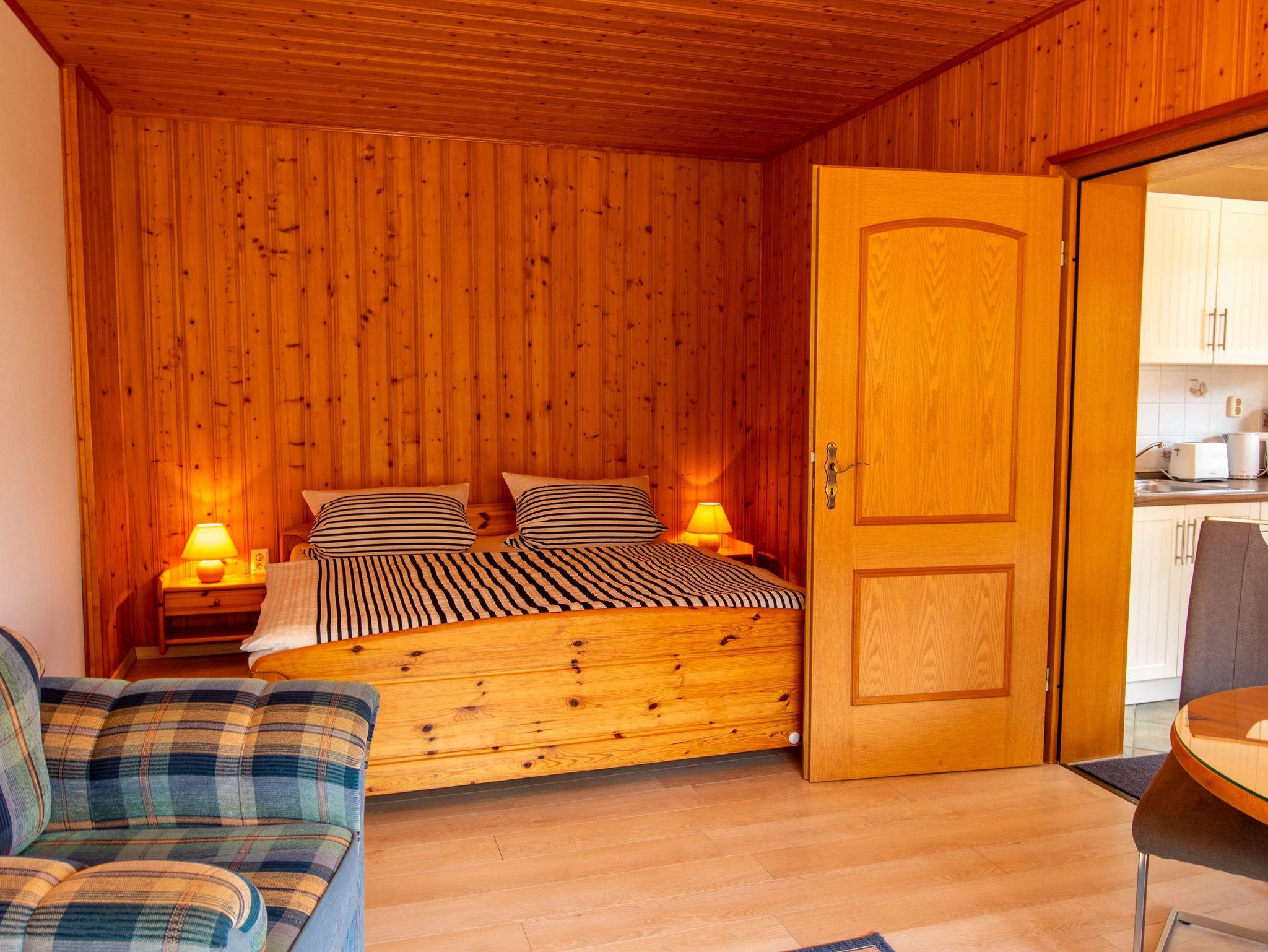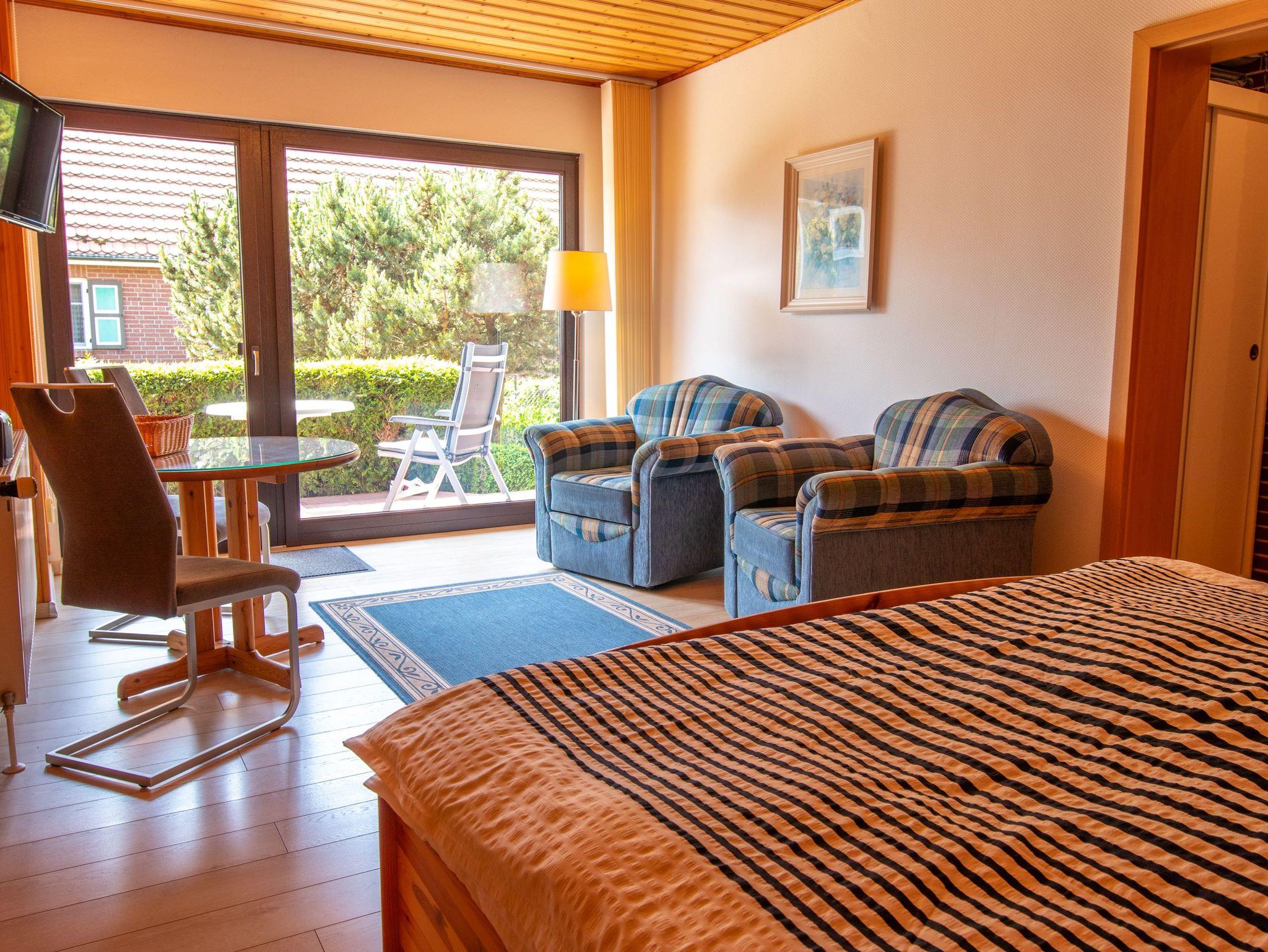 Sie erreichen die Ferienwohnung 1 über einen separaten Eingang am Haus der Vermieter. Im Eingangsbereich erwartet sie eine kleine Küche mit 2-Platten-Kochfeld, Kühlschrank, Kaffeemaschine, Toaster, Wasserkocher und Kochutensilien. Das gemütliche Wohnzimmer verfügt über zwei Sessel, TV, Esstisch und ein Doppelbett (180x200). Von hieraus erreichen sie die Terrasse mit Sitzmöglichkeit und das Bad mit Dusche und WC.