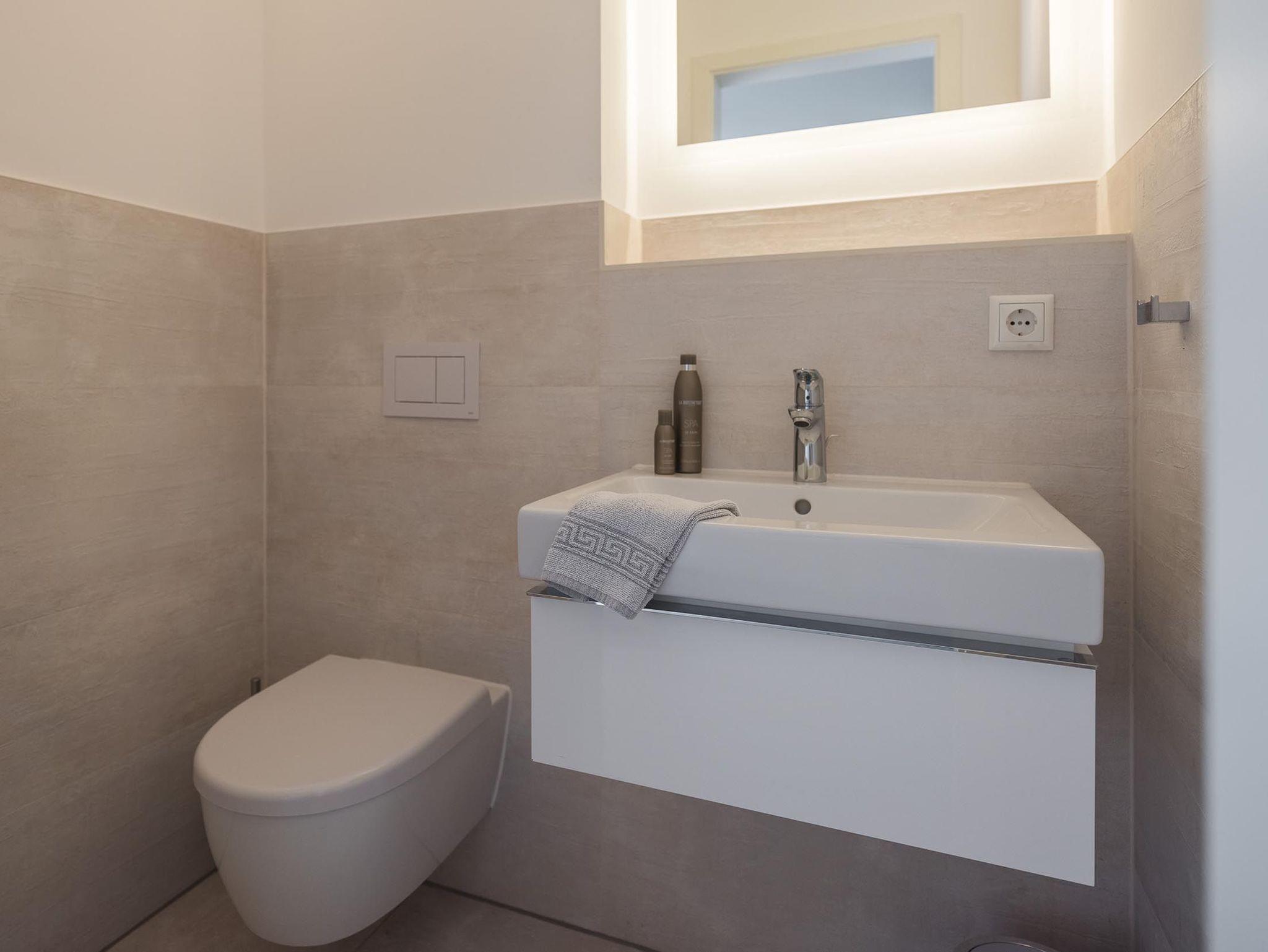 Die zwei modern eingerichteten Badezimmer sind mit einer hochwertigen Dusche ausgestattet. Ein zusätzliches Gäste-WC rundet den hohen Standard der Wohnung ab. Ein weiteres Schmuckstück des Penthouses ist die eigene Sauna.