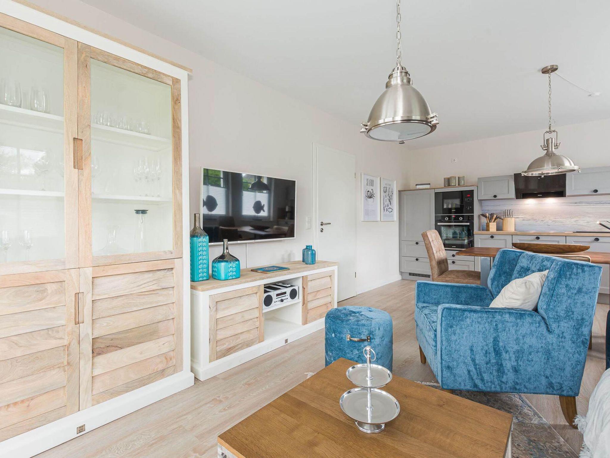 Im Wohnraum mit offener Küchenzeile finden Sie bequeme Sitzmöbel, Flat-TV und einen großzügigen Esstisch der zum Verweilen einlädt. Von hier aus haben Sie Zugang zur West-Terrasse, auch hier ist eine gemütliche Sitzgarnitur vorhanden. Die Küche ist mit sämtlichen Küchengeräten und allen gängigen Utensilien komplett ausgestattet.