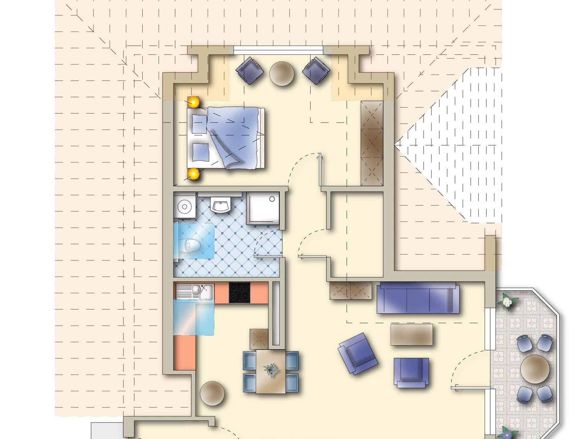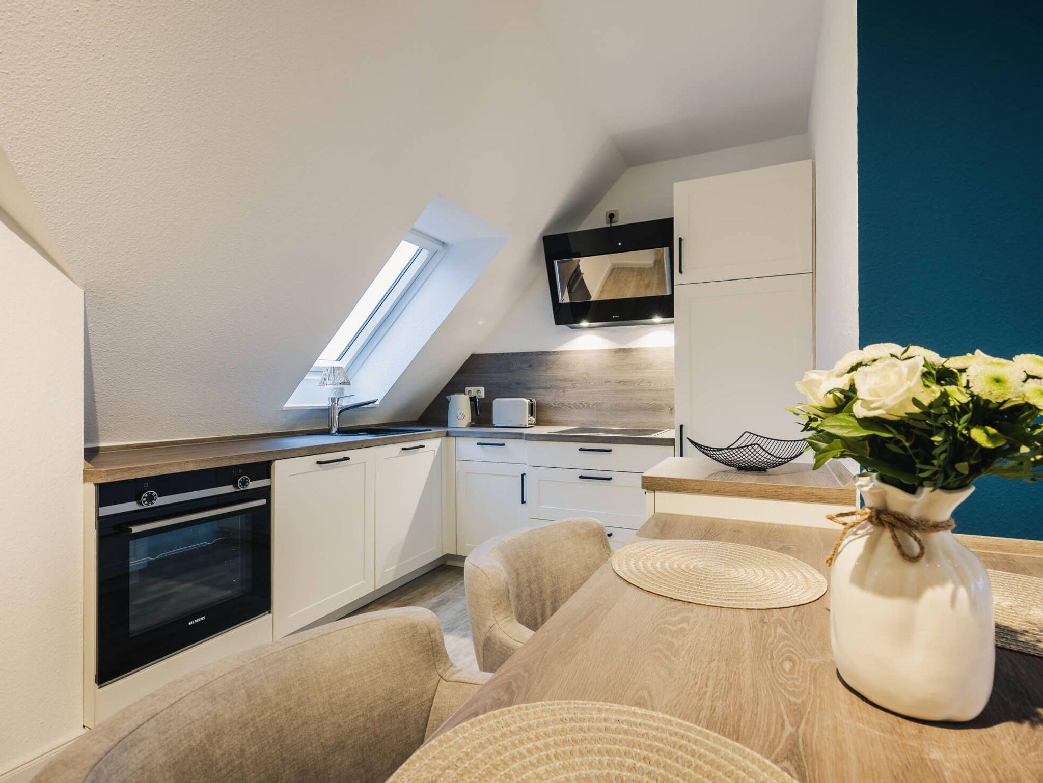 • Voll ausgestattete Küche mit Cerankochfeld, Backofen, Kühlschrank und Geschirrspüler