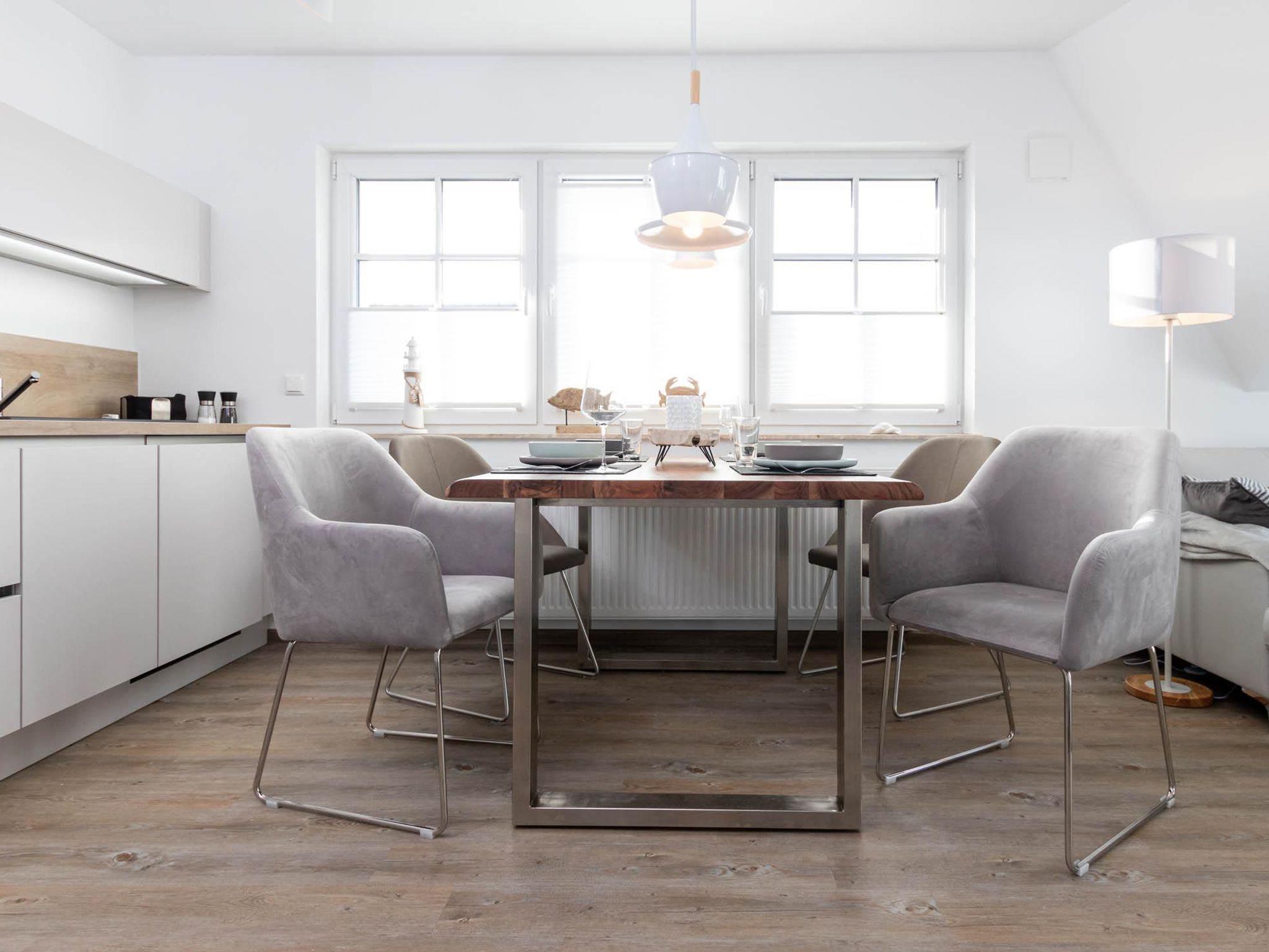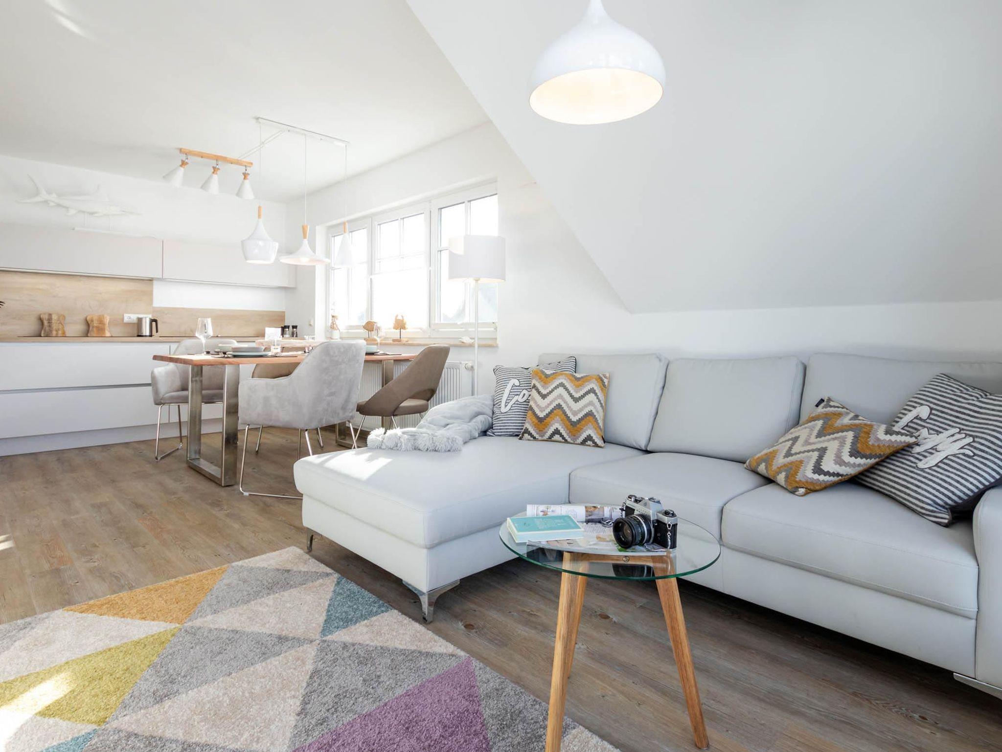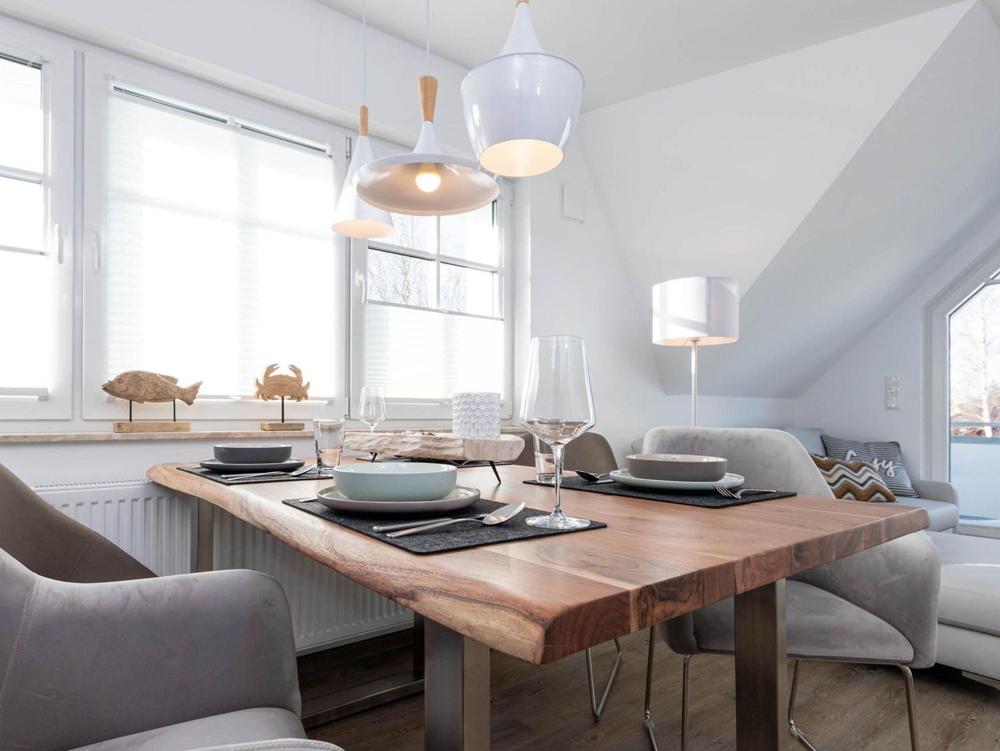 Traumhaftes Maisonette-Appartement in Zingst mit viel Platz für 4 Personen. Der große, helle und freundlich eingerichtete Wohnraum mit Koch- und Essbereich lädt zum Verweilen ein. Die Küche ist mit hochwertigen Elektrogeräten und Küchenutensilien wie Mikrowelle, Wasserkocher, Toaster und Kaffeemaschine ausgestattet. Der Esstisch bietet ausreichend Platz für die ganze Familie. Gerne können Sie das Frühstück bei Sonnenschein auf dem Balkon einnehmen und die Meerluft genießen oder am Abend einfach den Sternenhimmel betrachten.