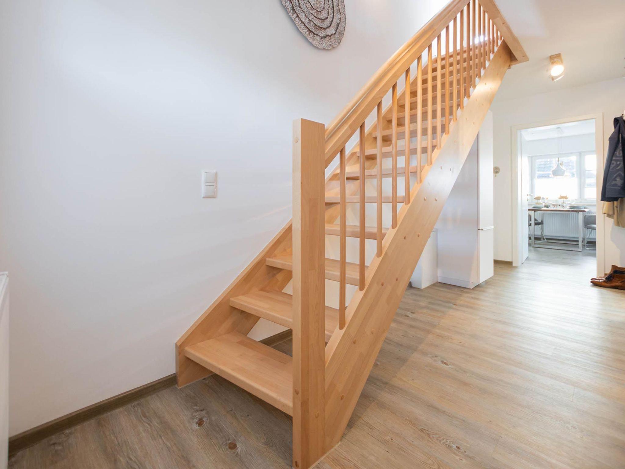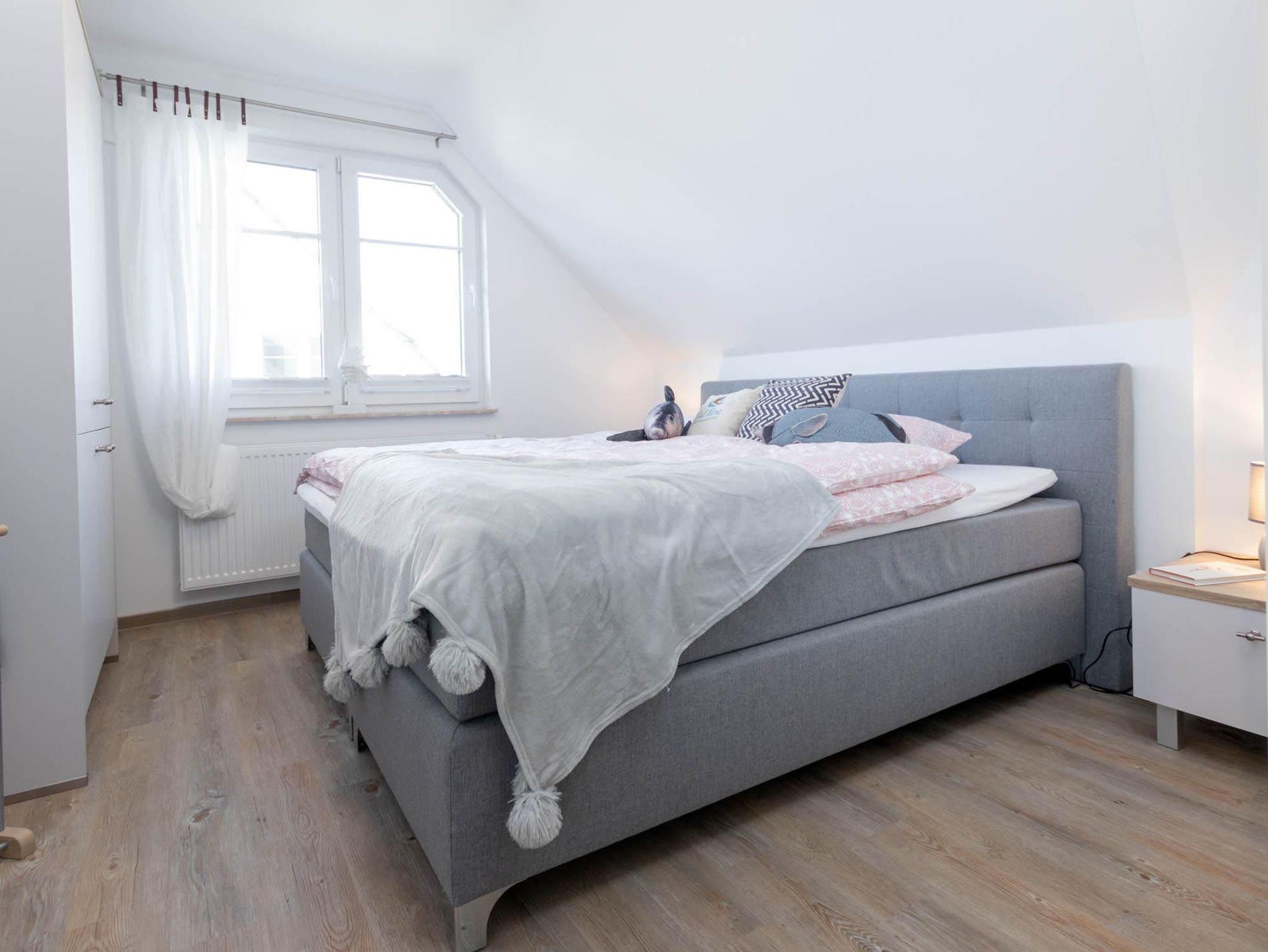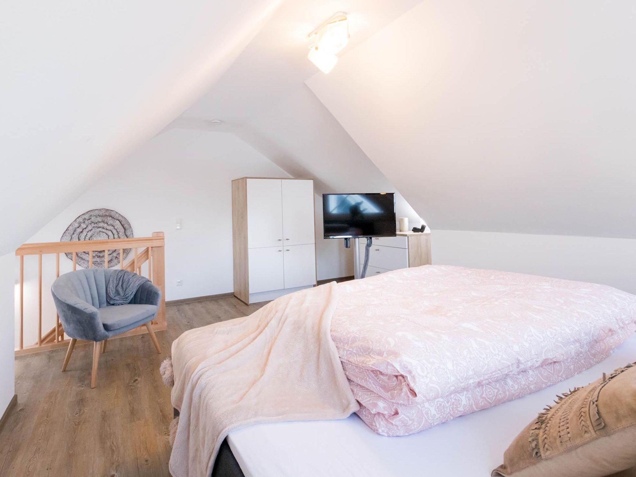 Ein Schlafzimmer sich in der ersten Etage, das zweite ist im Dachgeschoss. Beide sind mit 180x200 Boxspringbetten ausgestattet, erholsamer Schlaf ist garantiert. Das obere Schlafzimmer erreichen Sie bequem über eine Holztreppe. In jedem Raum befindet sich ein Flat-TV.