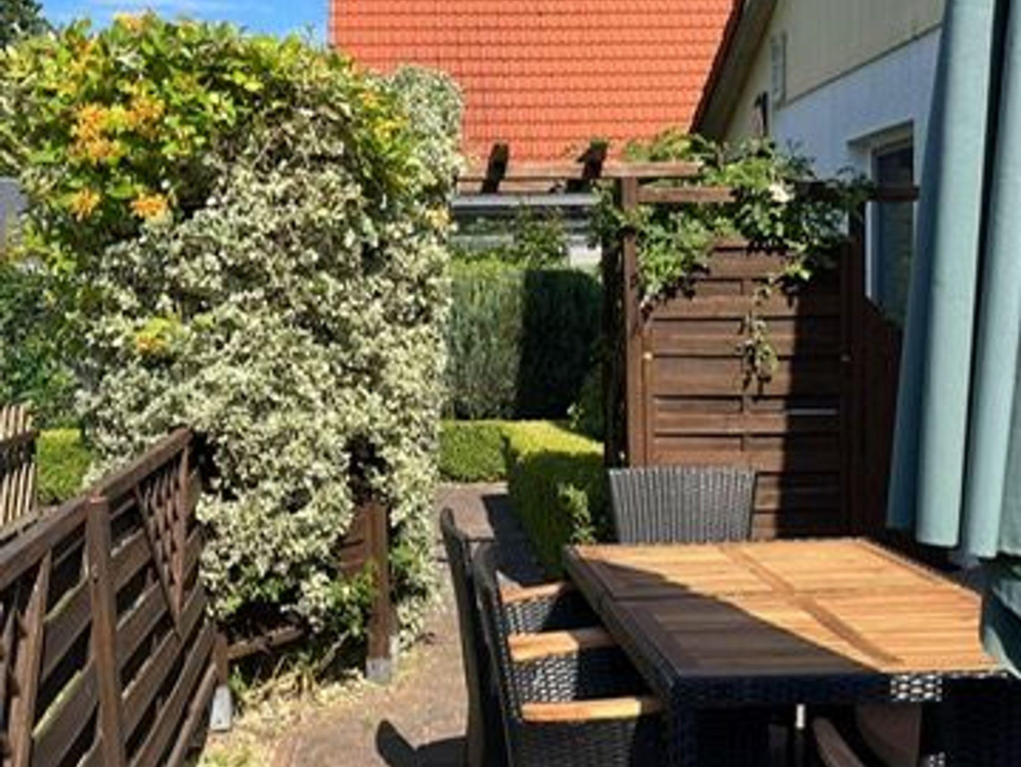 Die große Südterrasse mit Terrassenmöbeln und Sonnenschirm laden zum Frühstücken im Freien ein. Der 300qm große Garten ist komplett eingezäunt. So können sich unsere kleinen Gäste unbeschwert vergnügen und auch die vierbeinigen Gäste können sich frei bewegen.